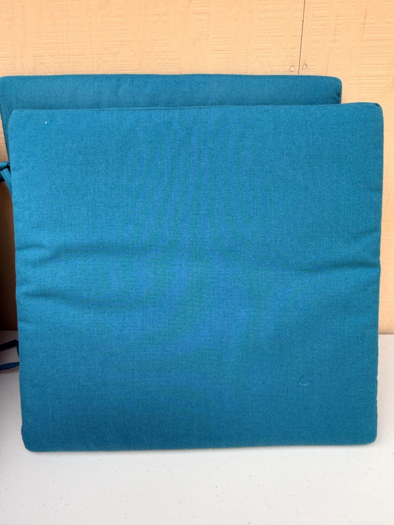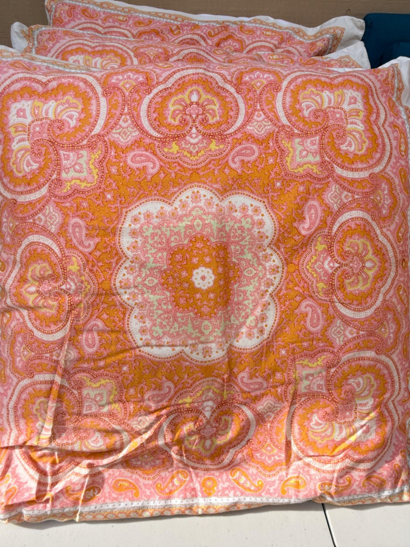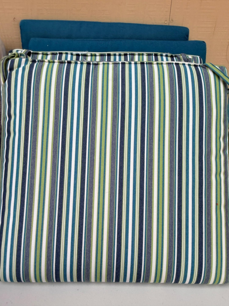 3 sets of Chair Cushions & 3 European Pillows Cushions are 19”x18” Pillows are 21” square.