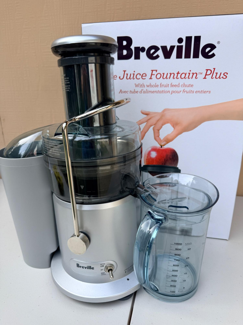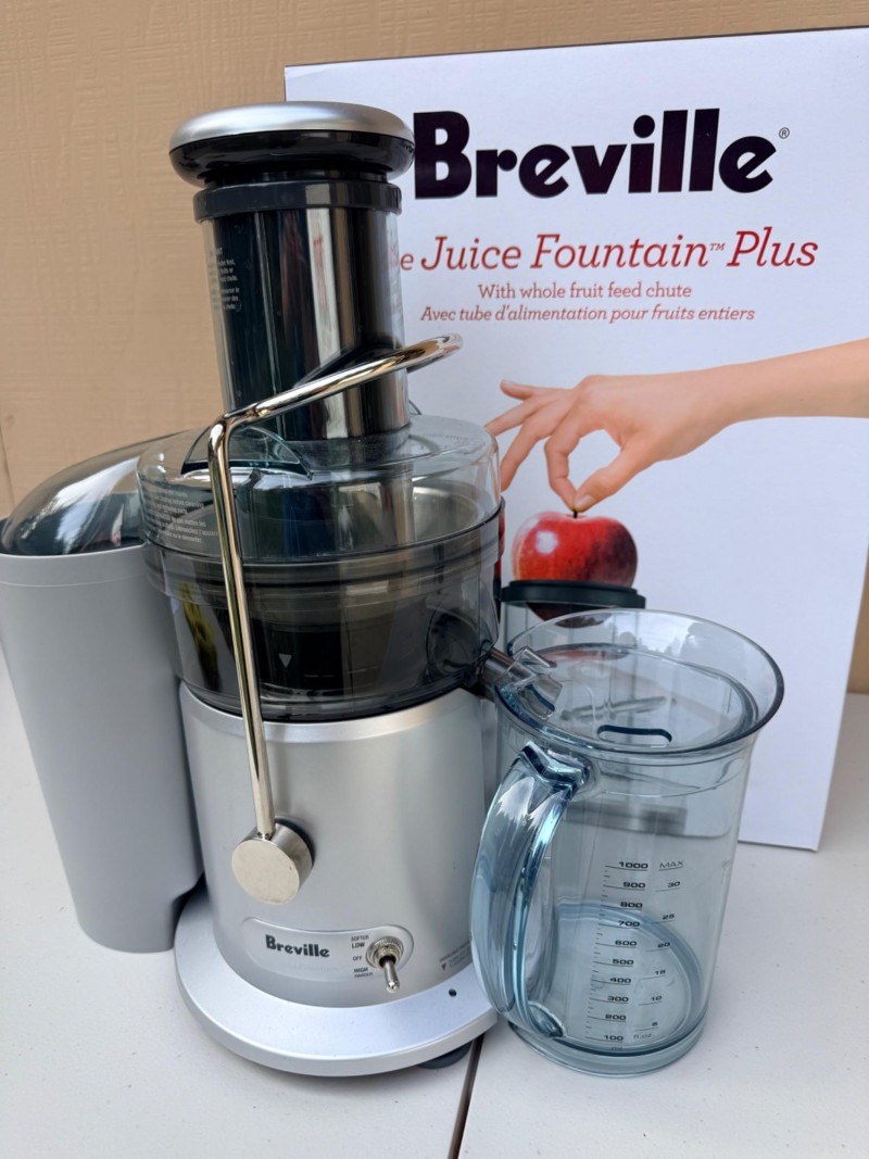 Breville Juice Fountain Plus centrifugal juicer, typically model JE98XL. Technology: Features a patented juicing system and Nutri Disc designed to transfer less than 1.8°F of heat to maximize nutrient absorption. Capacity & Power: Equipped with an 850-watt motor and includes a 1-liter (approx. 34 oz) juice jug. Features: Designed with a 3-inch extra-wide feed chute to accommodate whole fruits and vegetables, reducing prep time. Speed Settings: Offers two speeds (high and low) to handle different ingredient densities. In original box. Powers on, full functionality not tested.