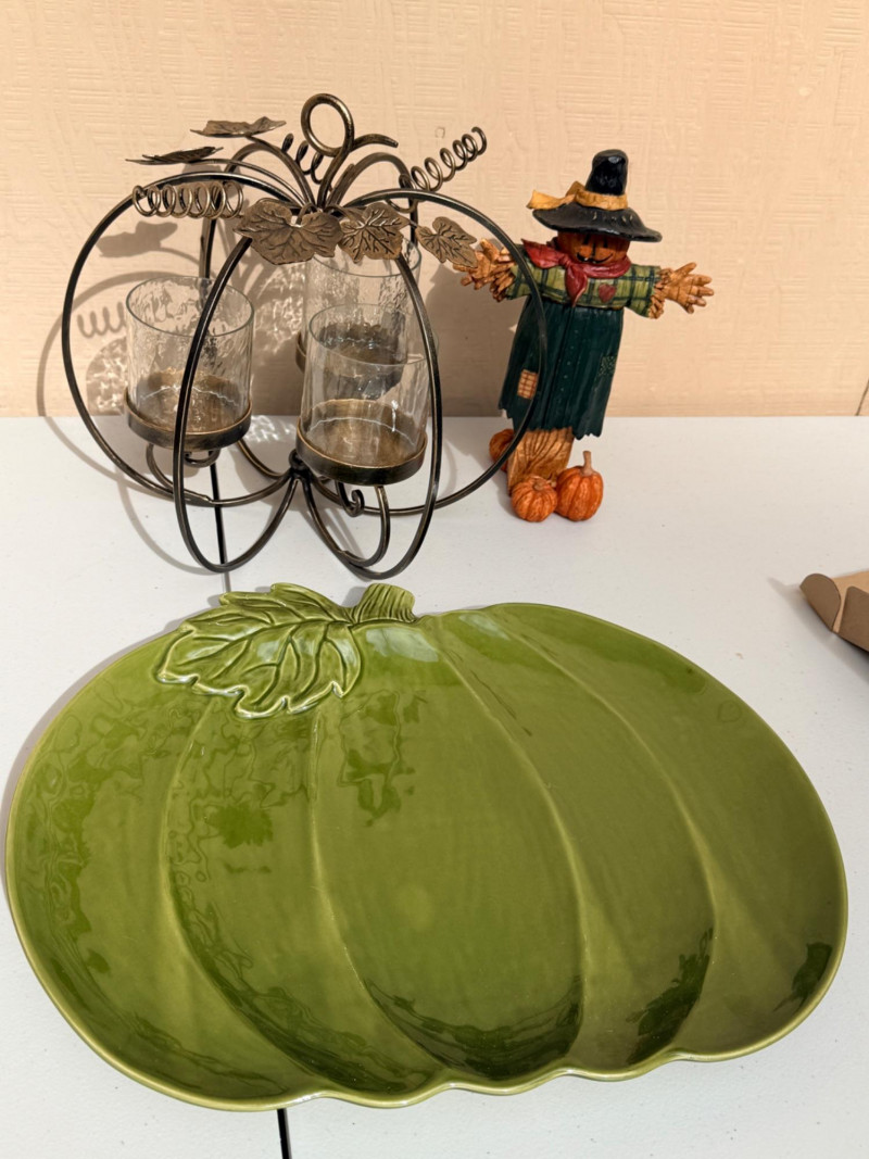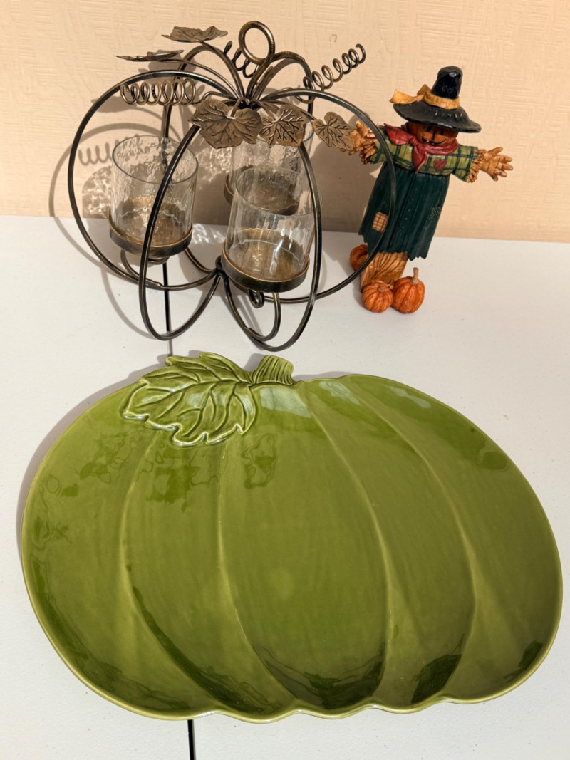 Pumpkin Platter, Centerpiece & Decor Green platter measures 18”x12” Metal frame pumpkin 3 candle holder is 13”x13” Resin Scarecrow is 11” tall.