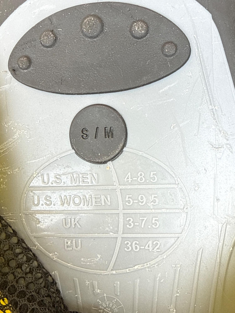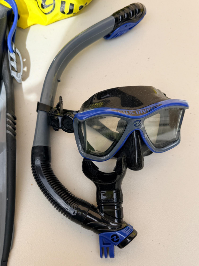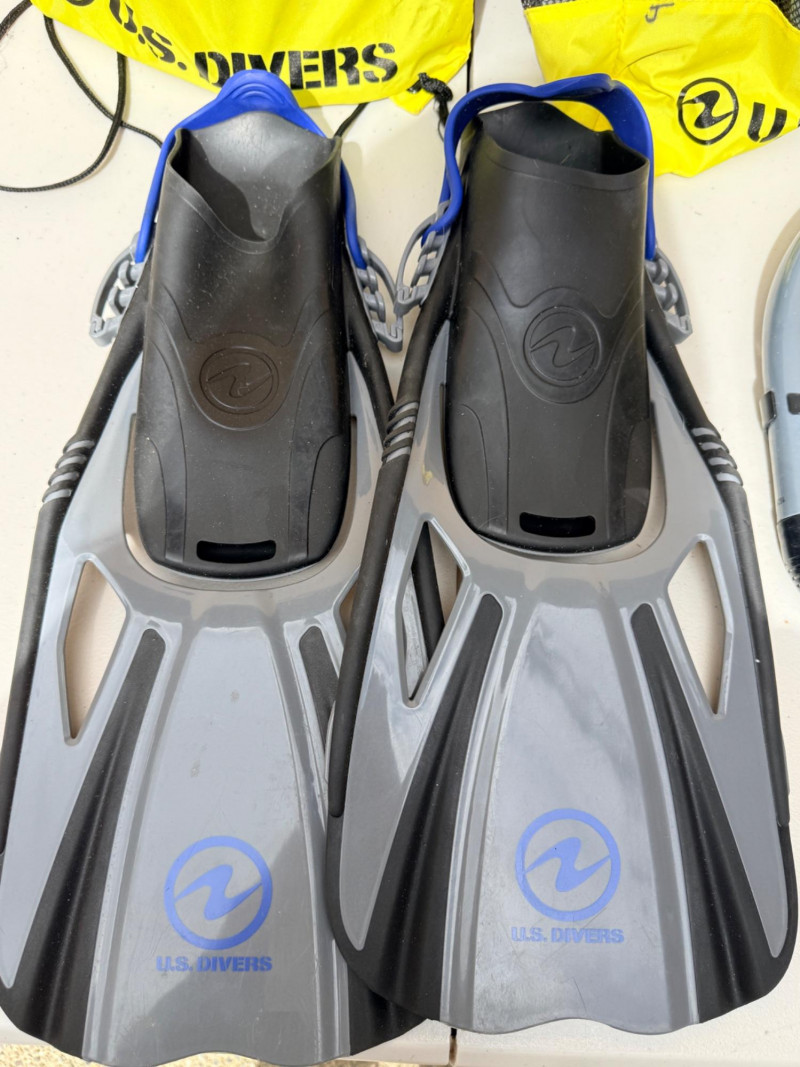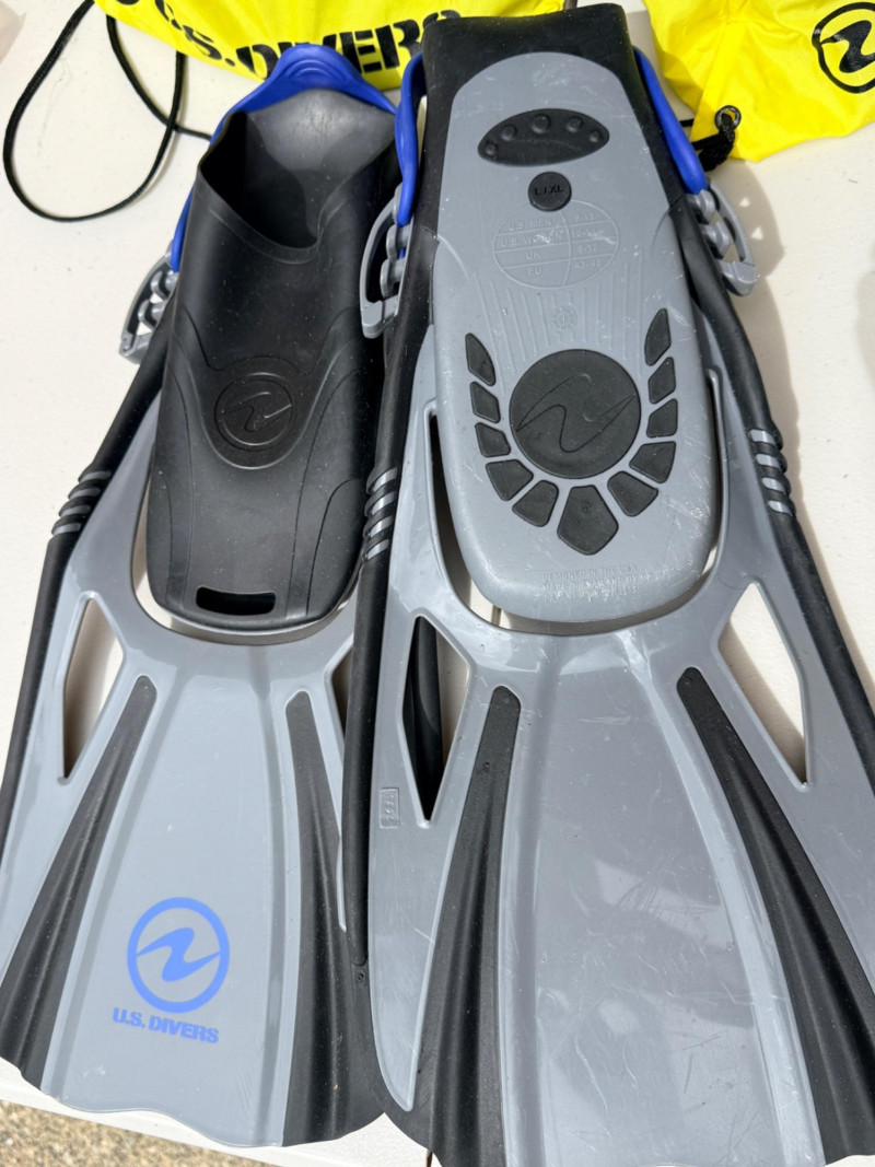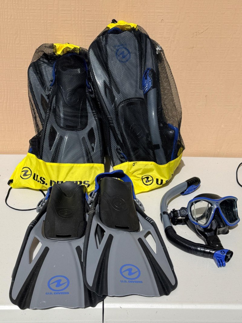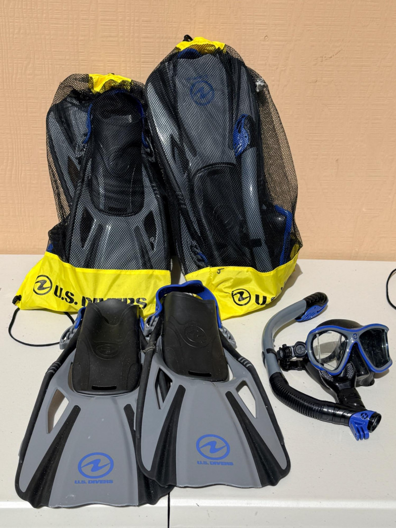 U.S. Divers snorkeling set, includes adjustable snorkeling fins, a mask, a snorkel and mesh carry bag for storage and transport. Hypoallergenic silicone skirt on the mask for comfort and leak prevention. (1) S/M See pics for sizing.