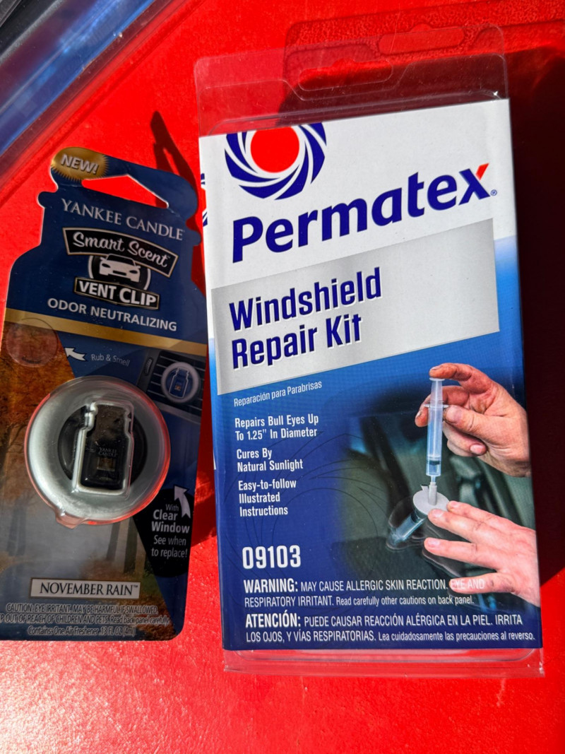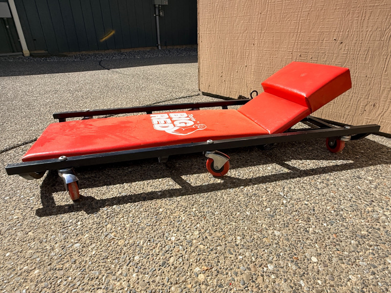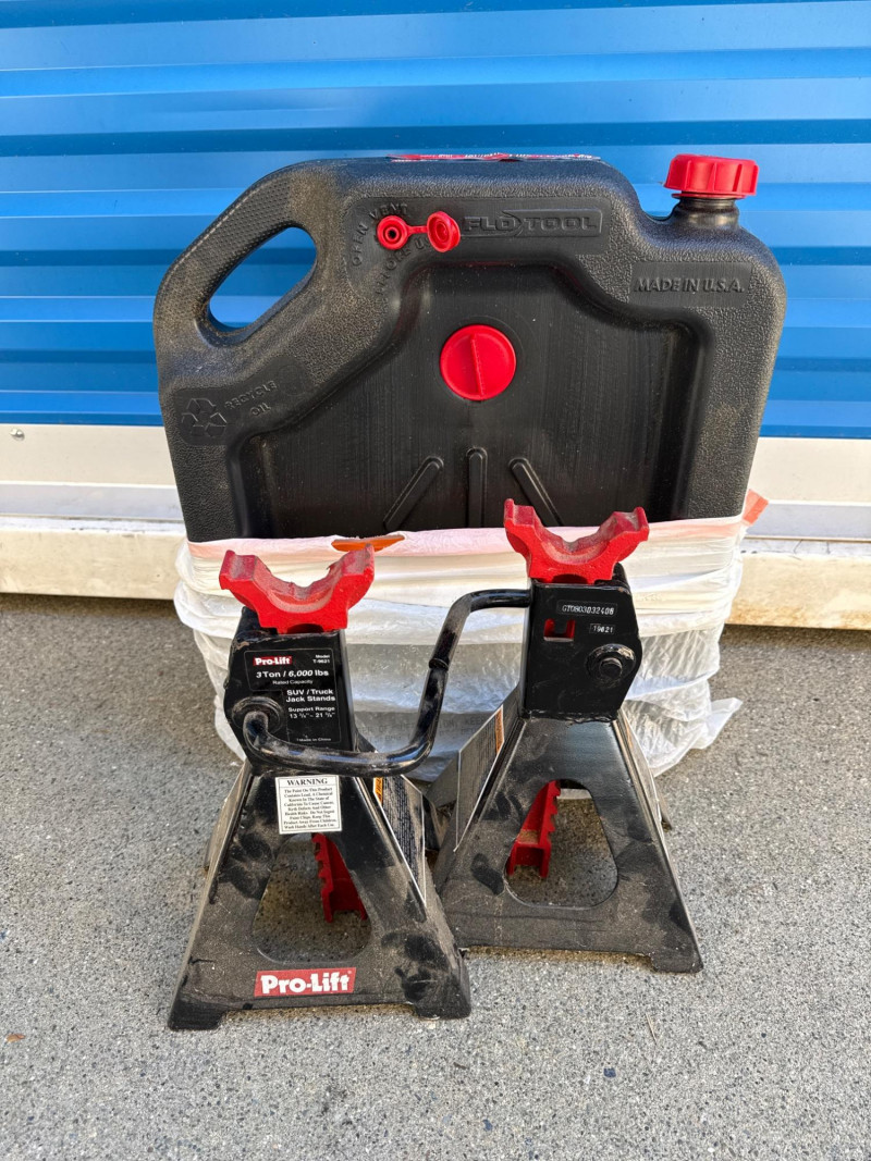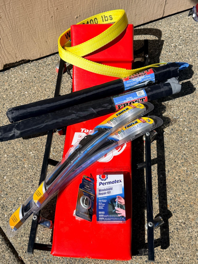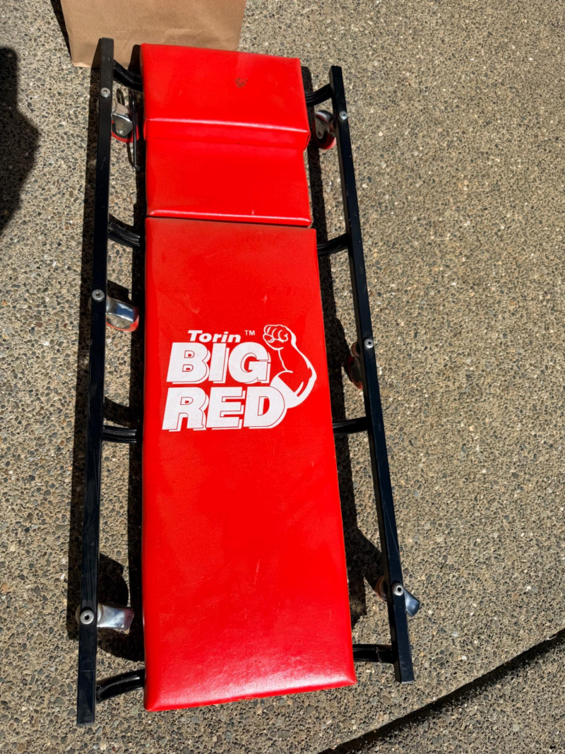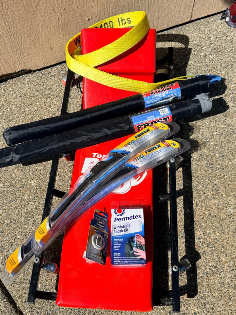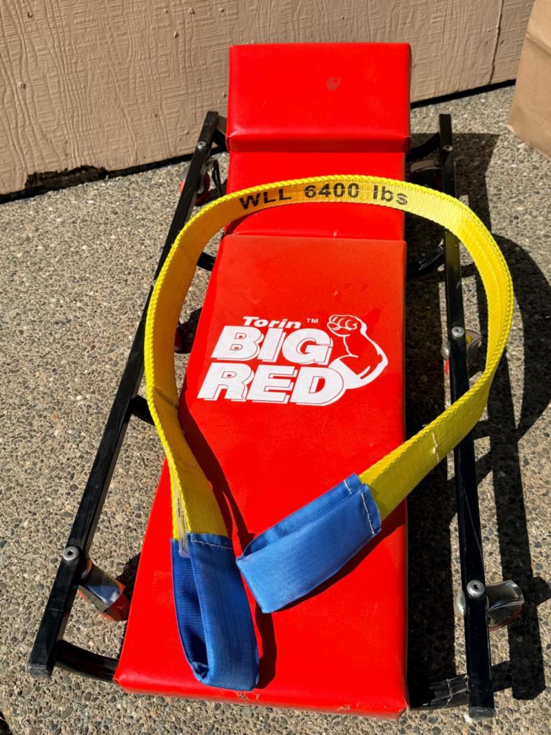 Torin Big Red Metal frame padded creeper with 6 swivel casters. Adjustable headrest. 17”x40.5” Rain-X Latitude windshield wipers 22” and 26” NIP 6400 lb webbed tow strap Windshield repair kit NIP Air freshener (2) Pro-Lift 3 ton jack stands Flotool 16qt oil catch container