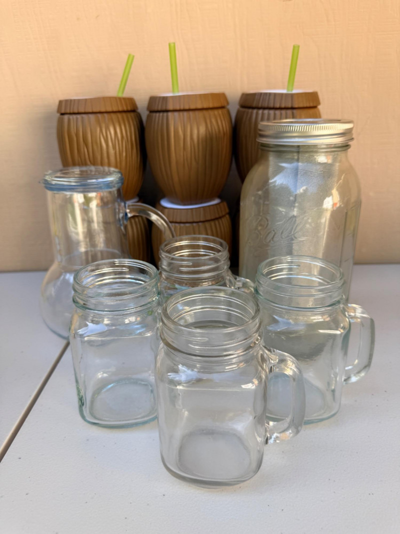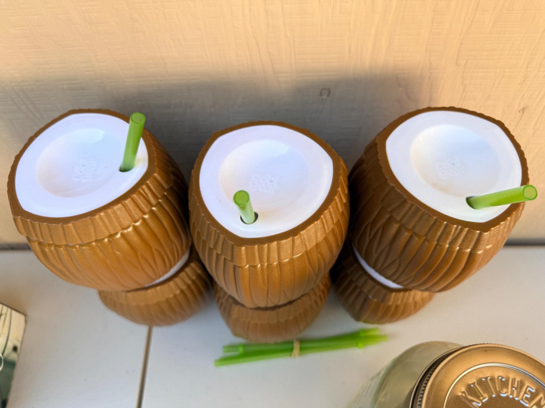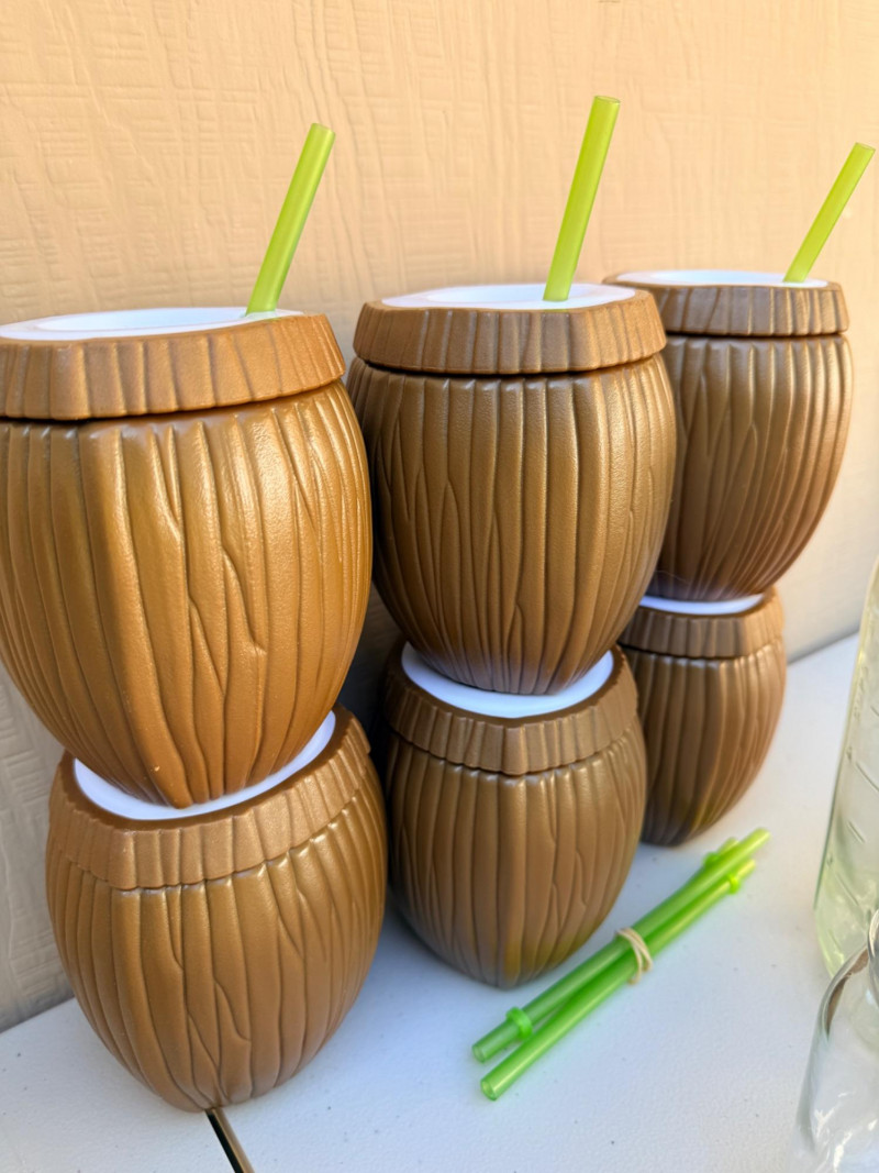 Beverage Sets 6 lidded coconut beverage holders with straws.