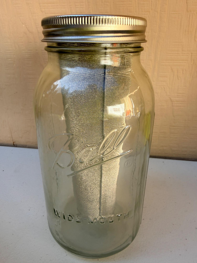 Ball Infused water jar is 9.5”x5” with metal mesh insert to fruit infuse your water.