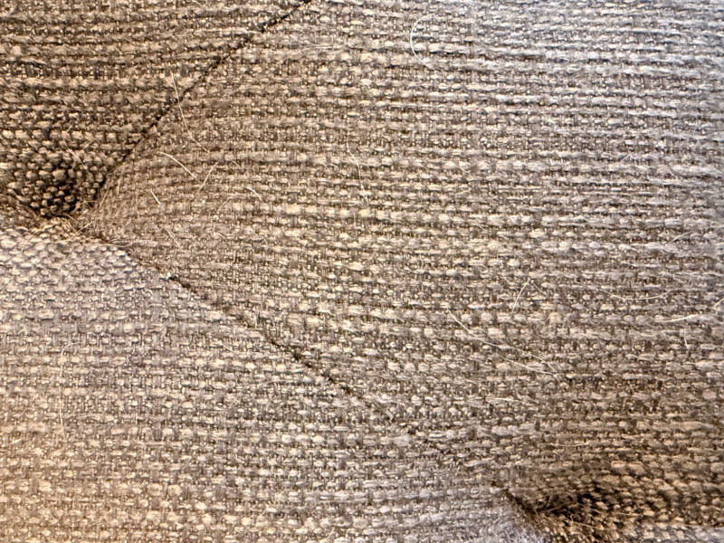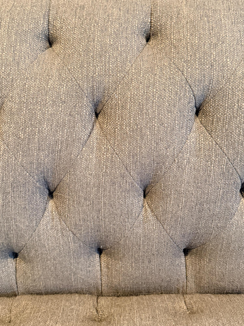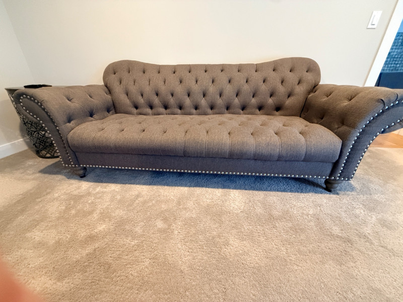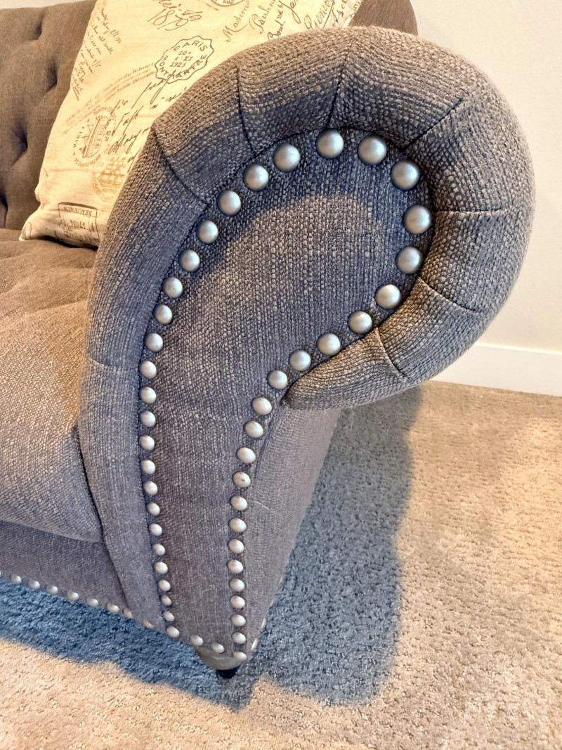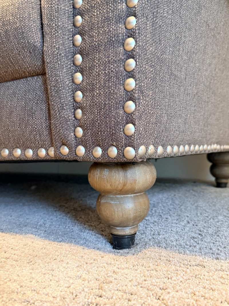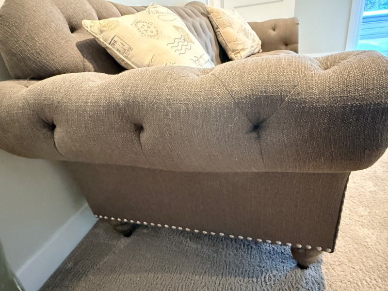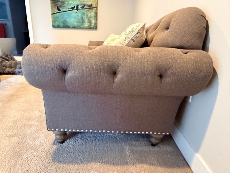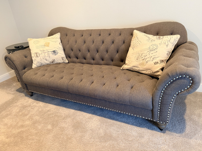 Cocoa Brown Sofa Cocoa brown traditional button-tufted backrest with elegant studded details, scroll arms, turned legs and curved silhouette. Includes 2 throw pillows. 80”x34”x35”