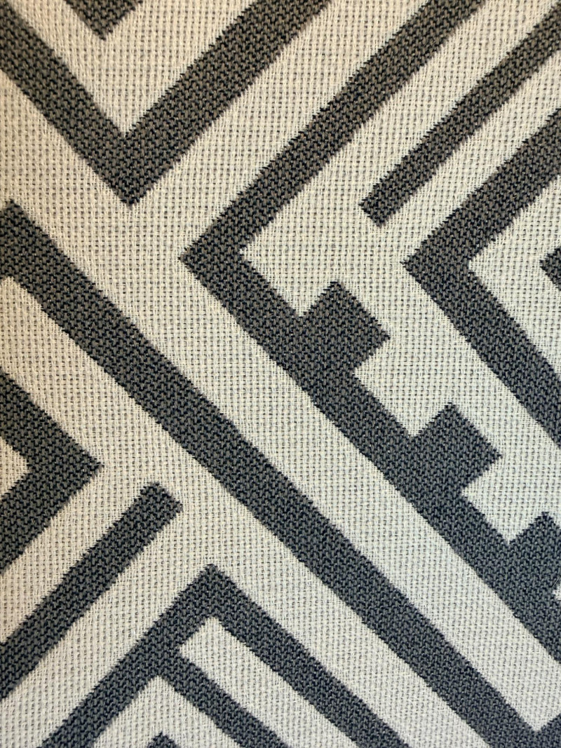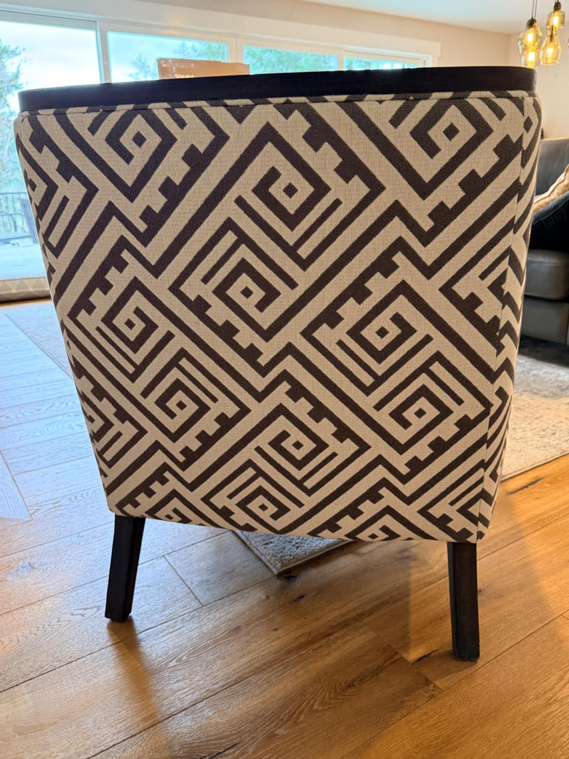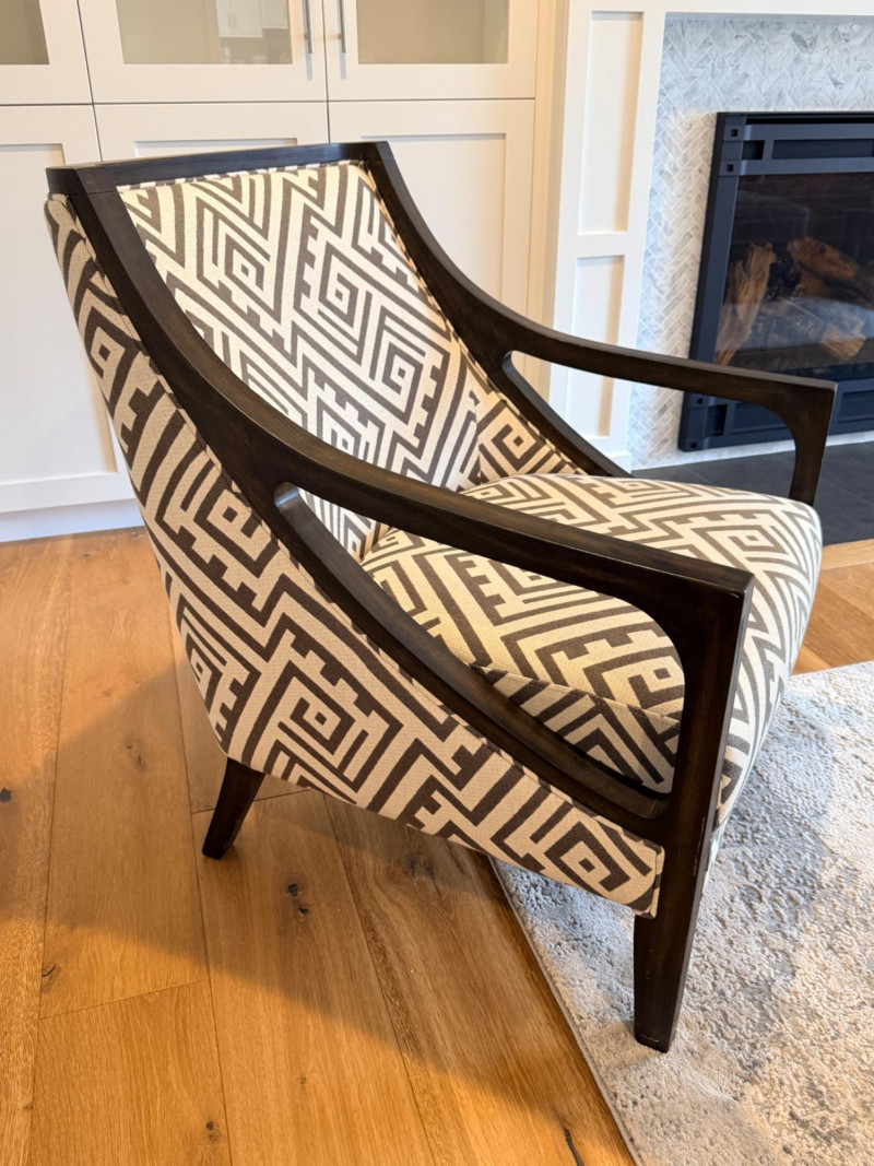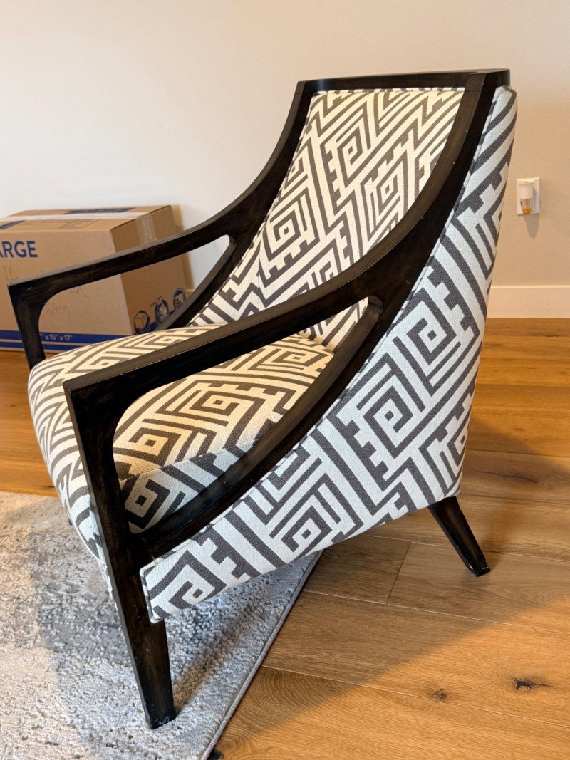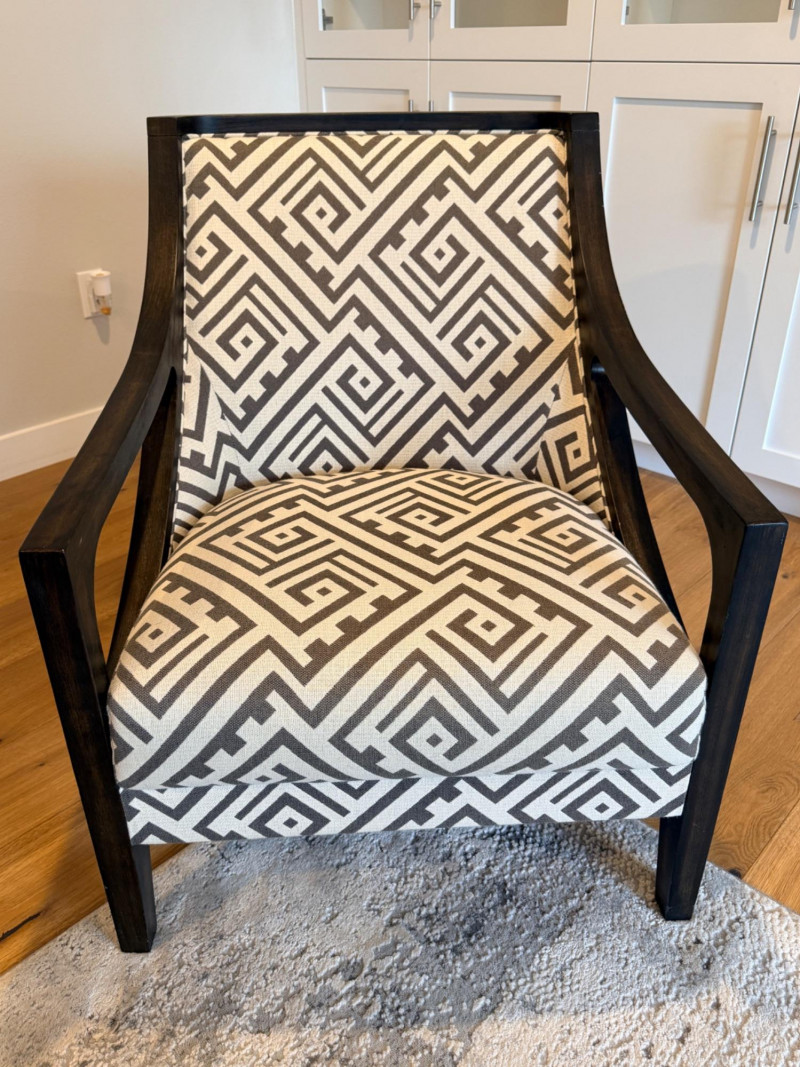 Geometric Accent Chair A modern take on a traditional silhouette, characterized by its bold geometric Greek key or maze upholstery. Materials: Upholstered in 100% polyester fabric with a solid wood frame. Finishes: The exposed wood frame is usually finished in dark espresso, or ebony tones.