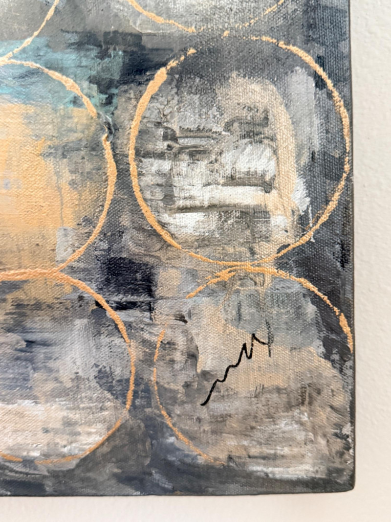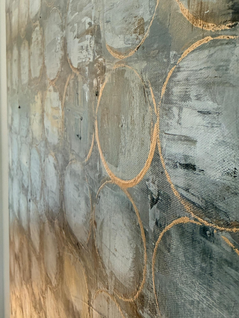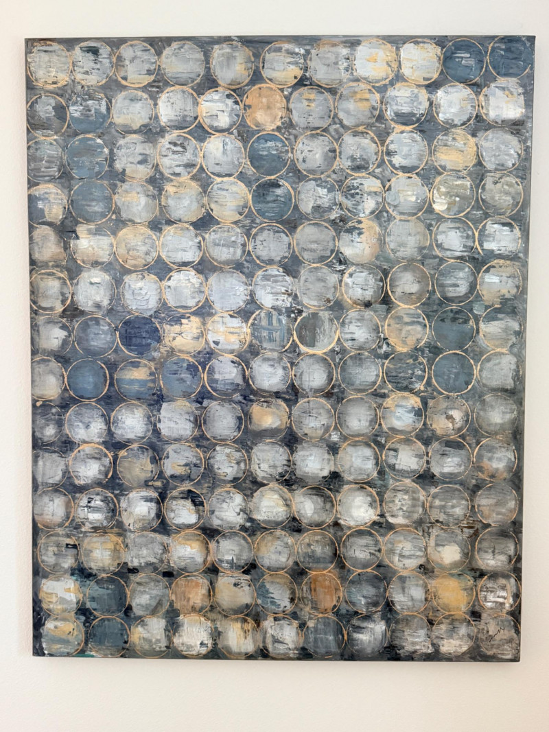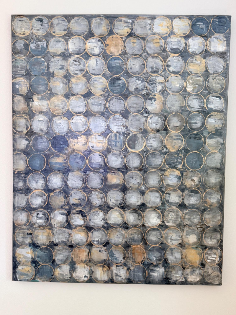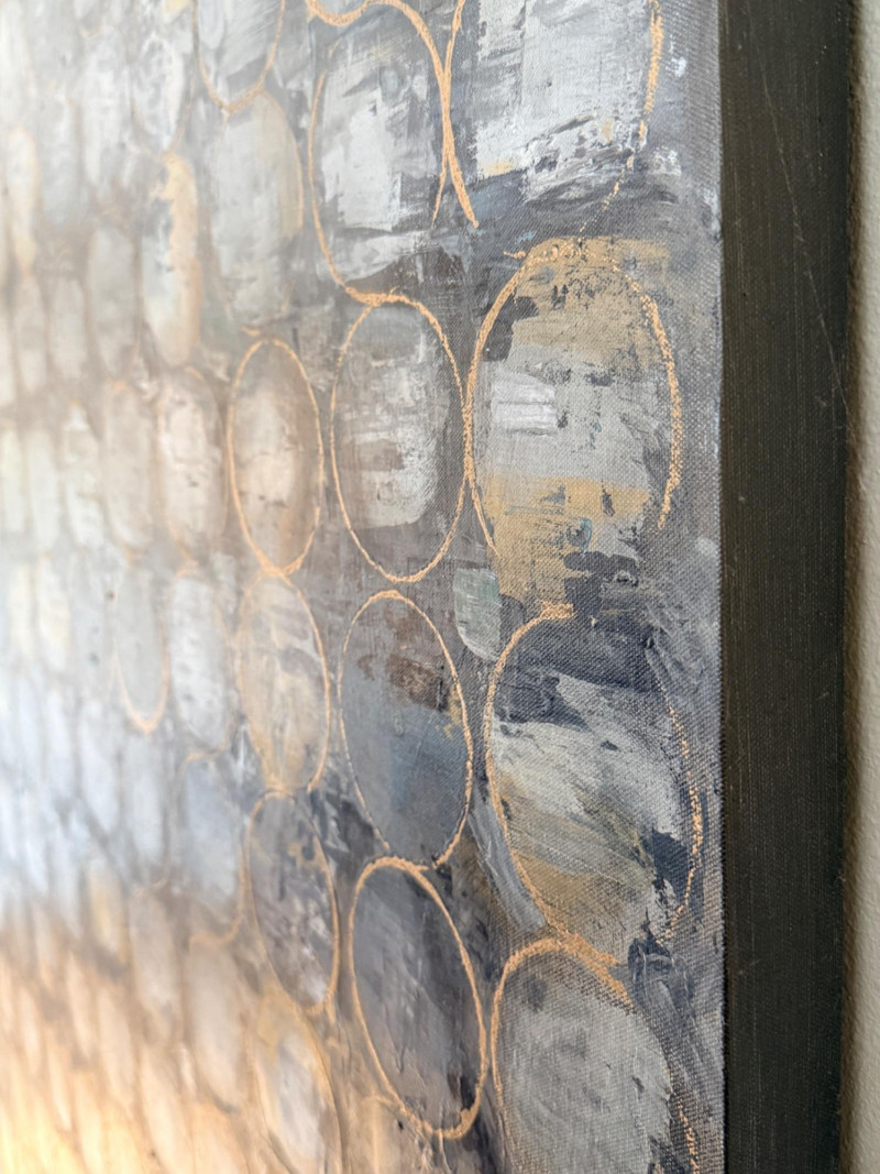 Golden Undertones - A Large Geometric Painting on Canvas This hand-painted abstract artwork is titled "Golden Undertones". It features a matrix of repeating circles in cool tones contrasted by gold accents, to create an intriguing contemporary aesthetic. Designed and painted entirely by hand by a studio in the USA Measures 39.75”x50”x1.5”