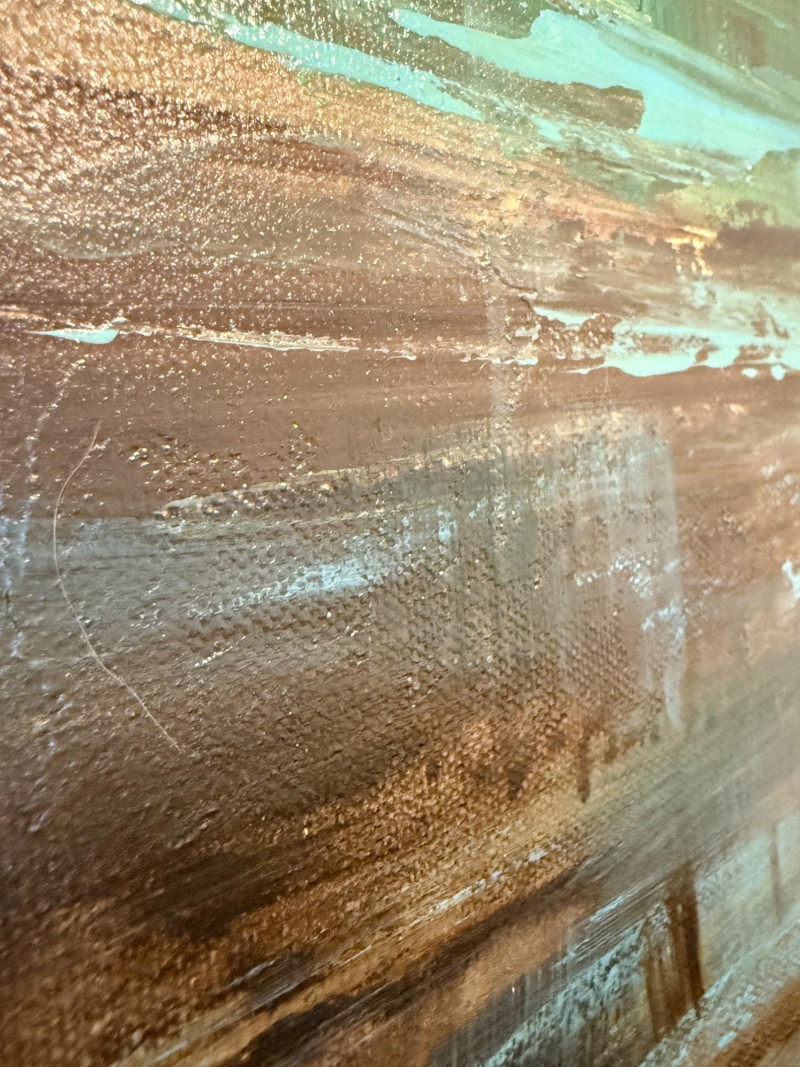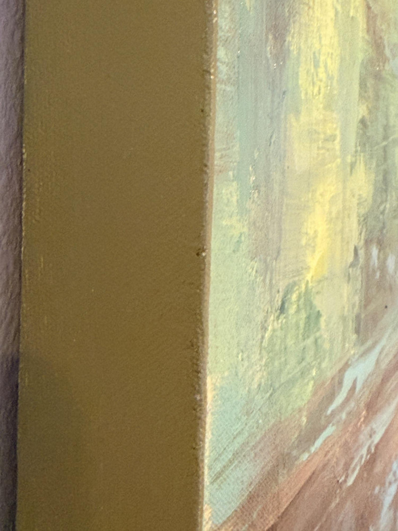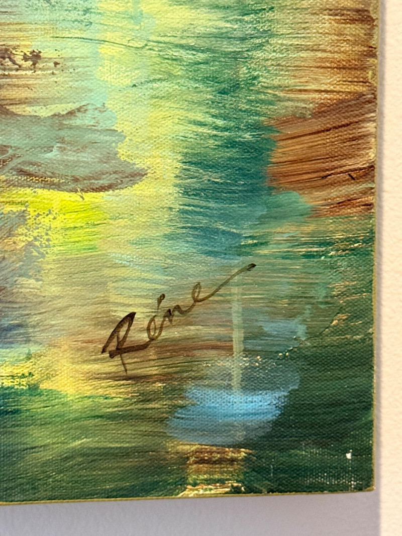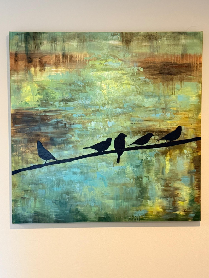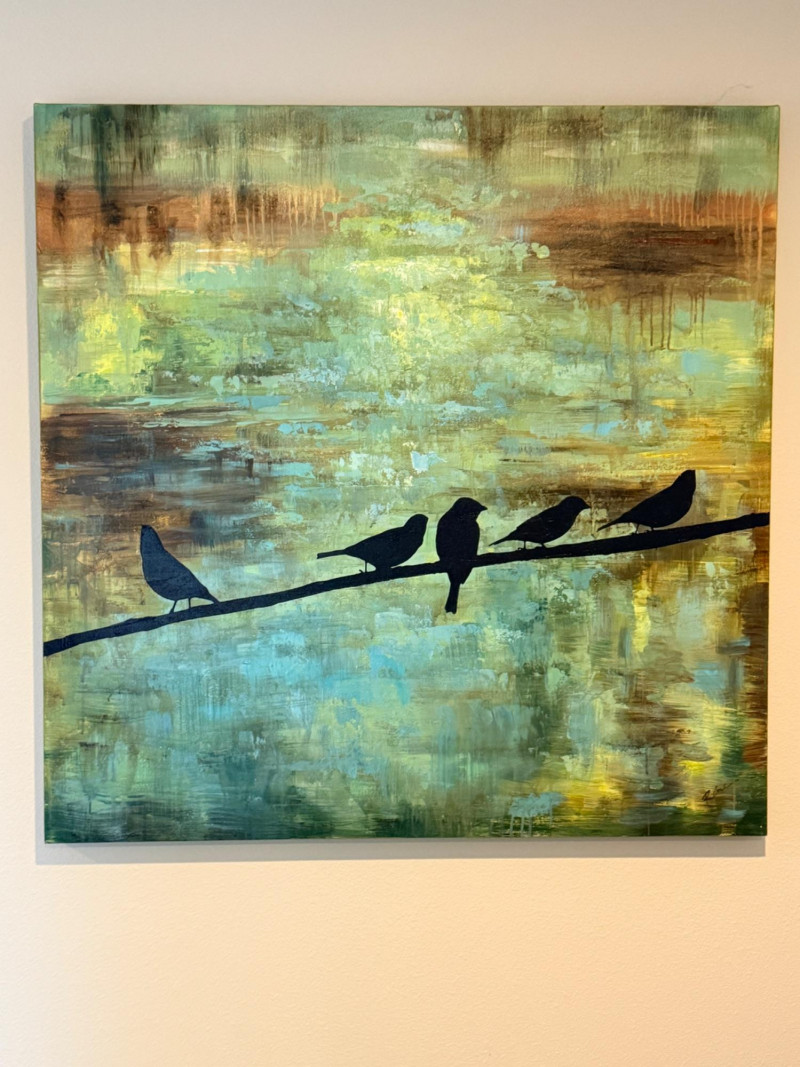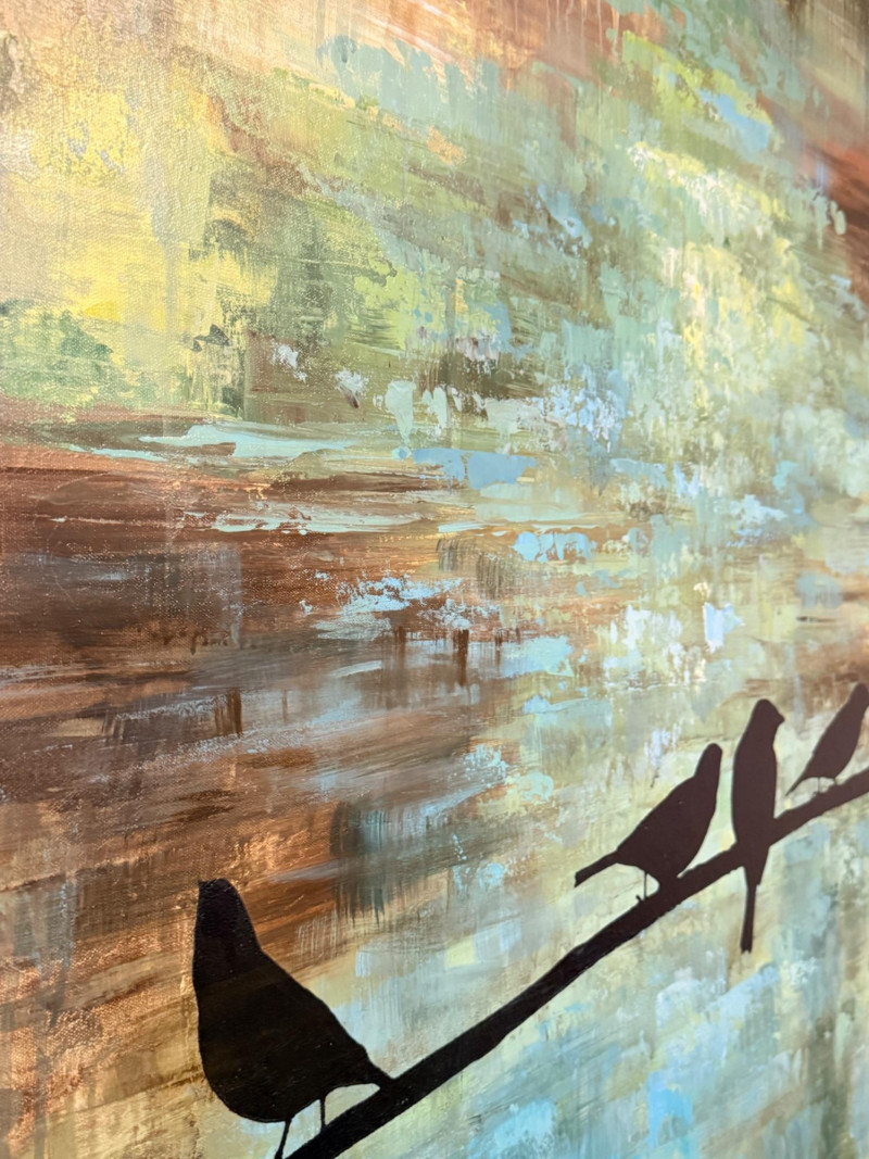 Birds on a wire large format painting on canvas, signed by artist Rene. Green, yellow, gold and black are the primary colors of this wall decor. 40”x40”x1.5”