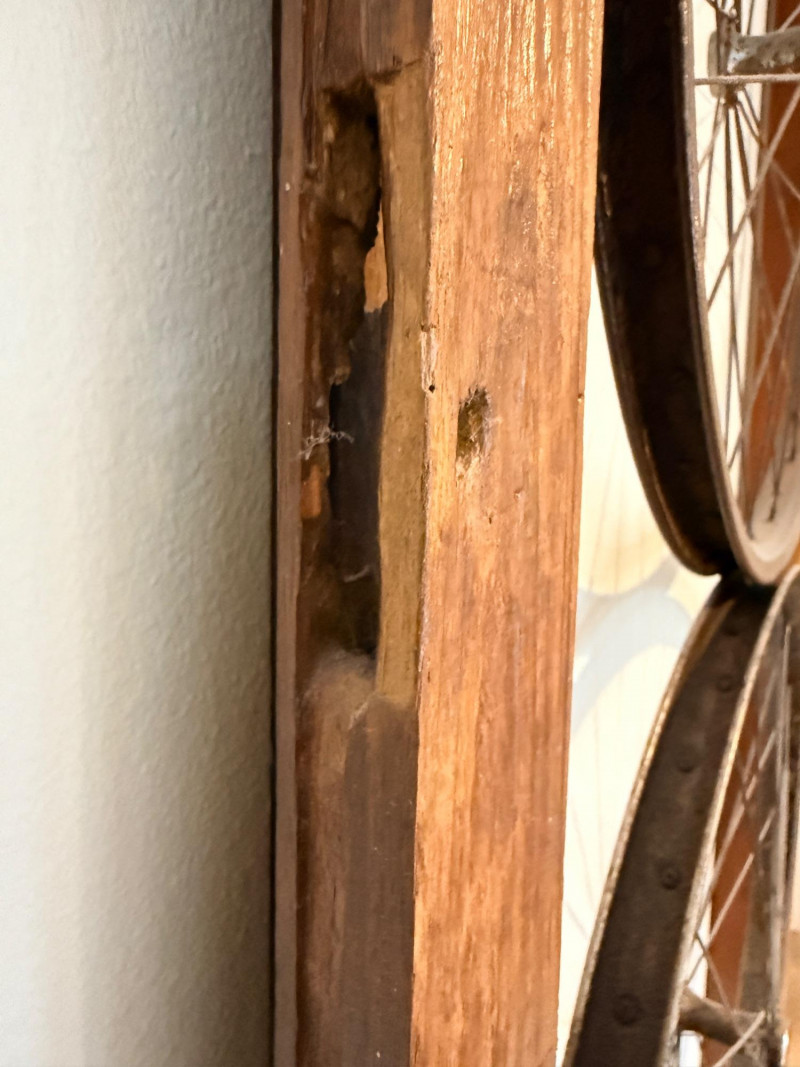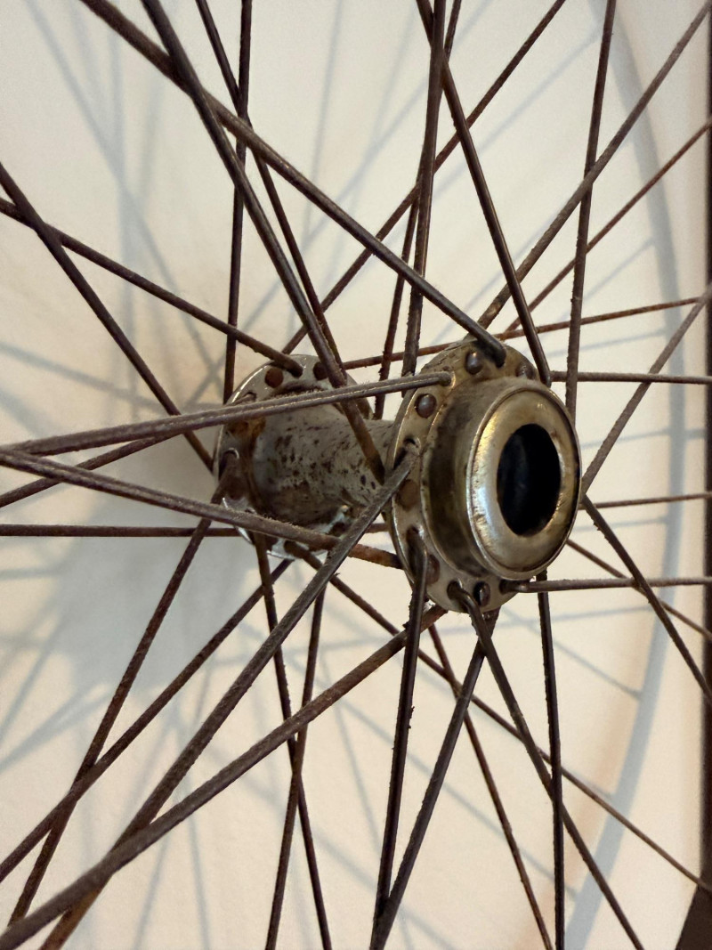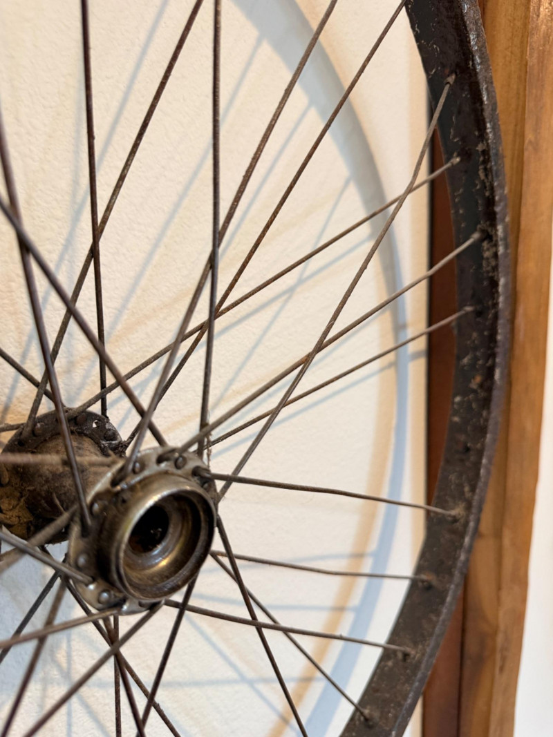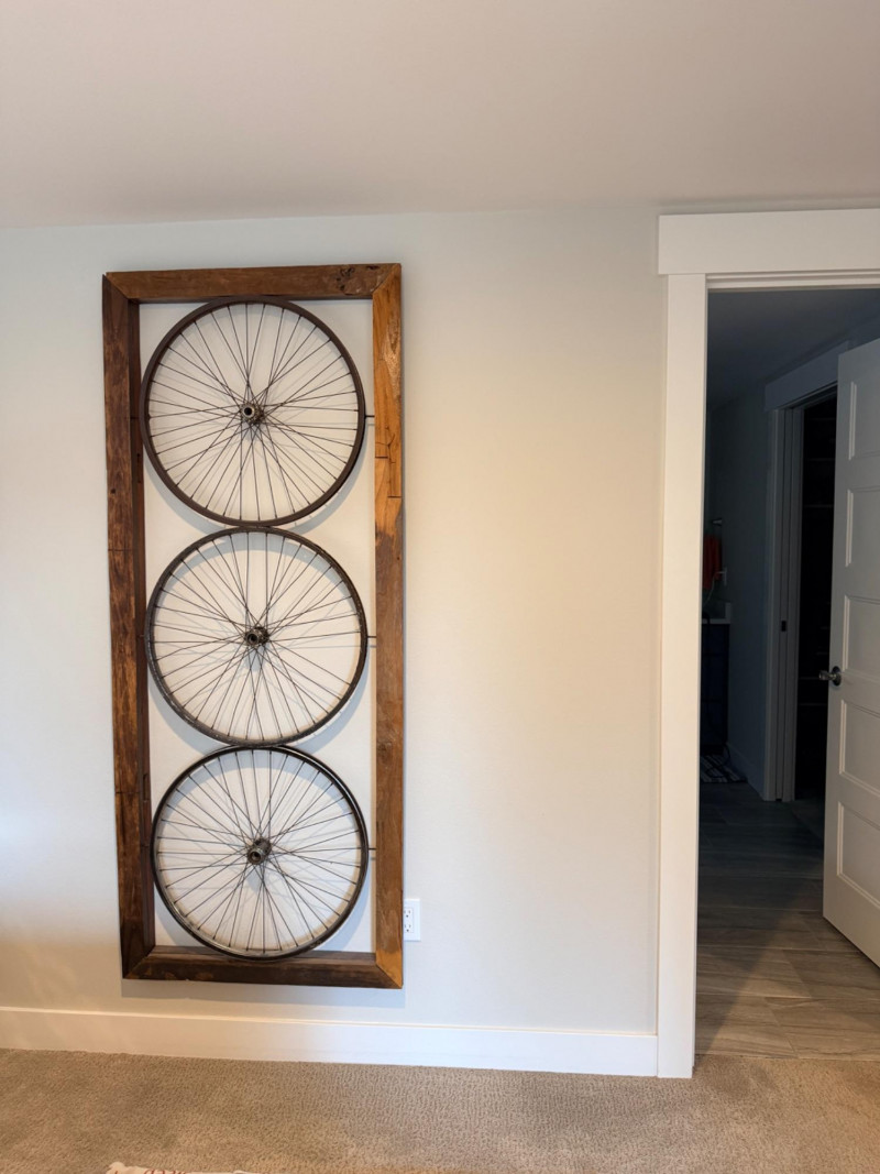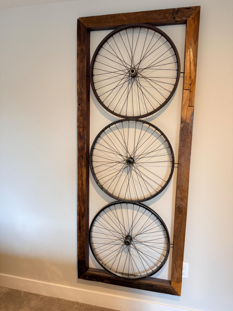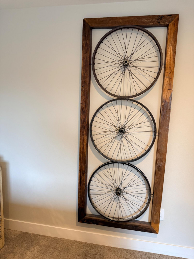 Wood Framed Bicycle Spoke Wheel Wall Art Repurposed wood window frame and bicycle spoke wheels combine for this unique wall art. Check your space, this is a large piece of art. See pics for perspective. Measures 30”x72.5”x4