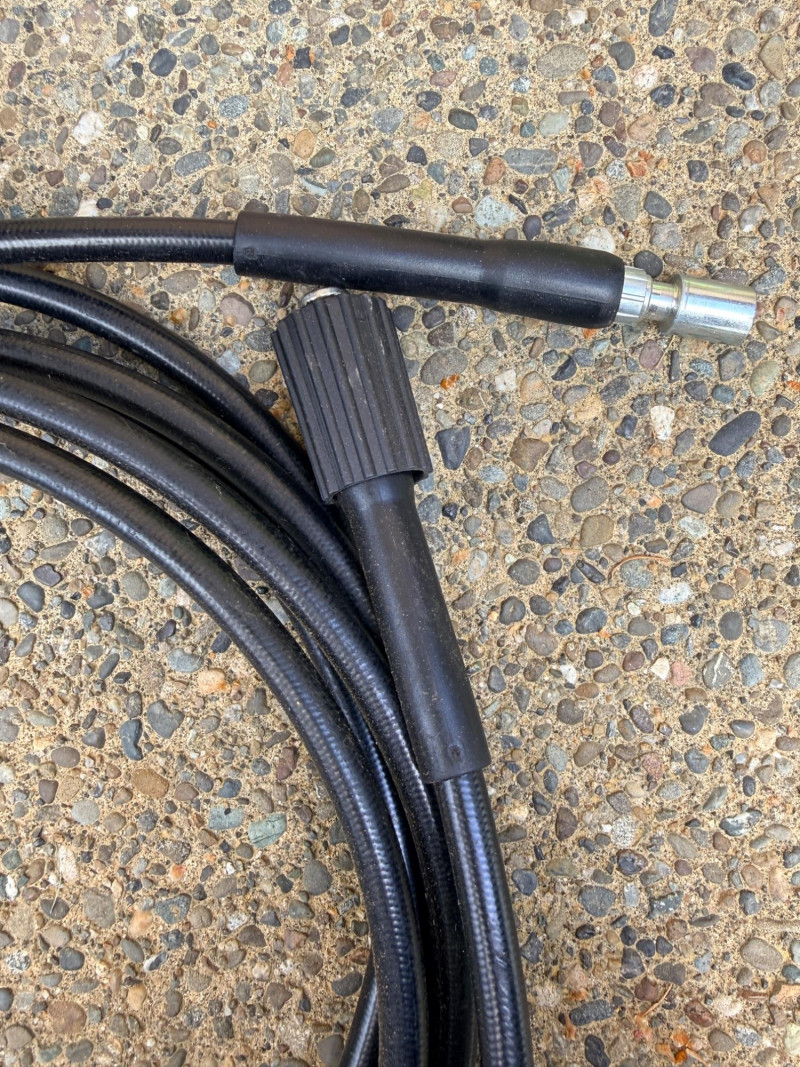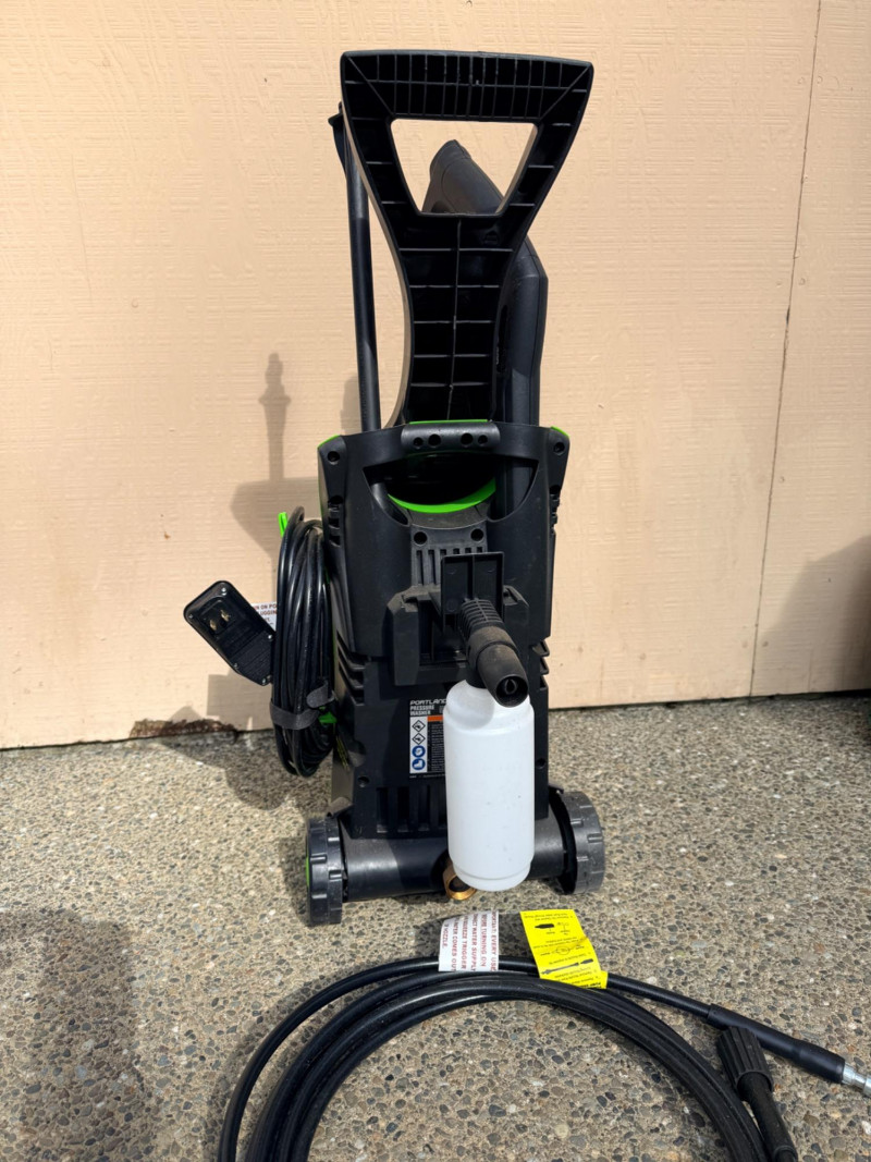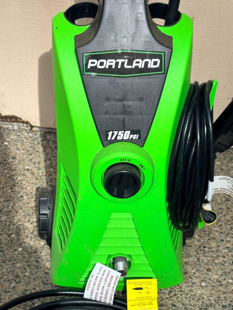 Portland 1750psi Electric Pressure Washer Super compact size measuring 11“ x 12“ x 29“ tall. Complete with hose and 2 piece handle. Tested, powers on! Did not connect hose for fully functions.