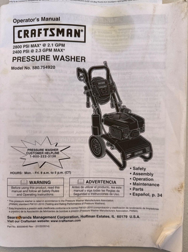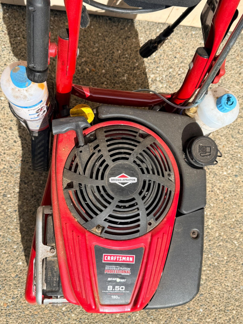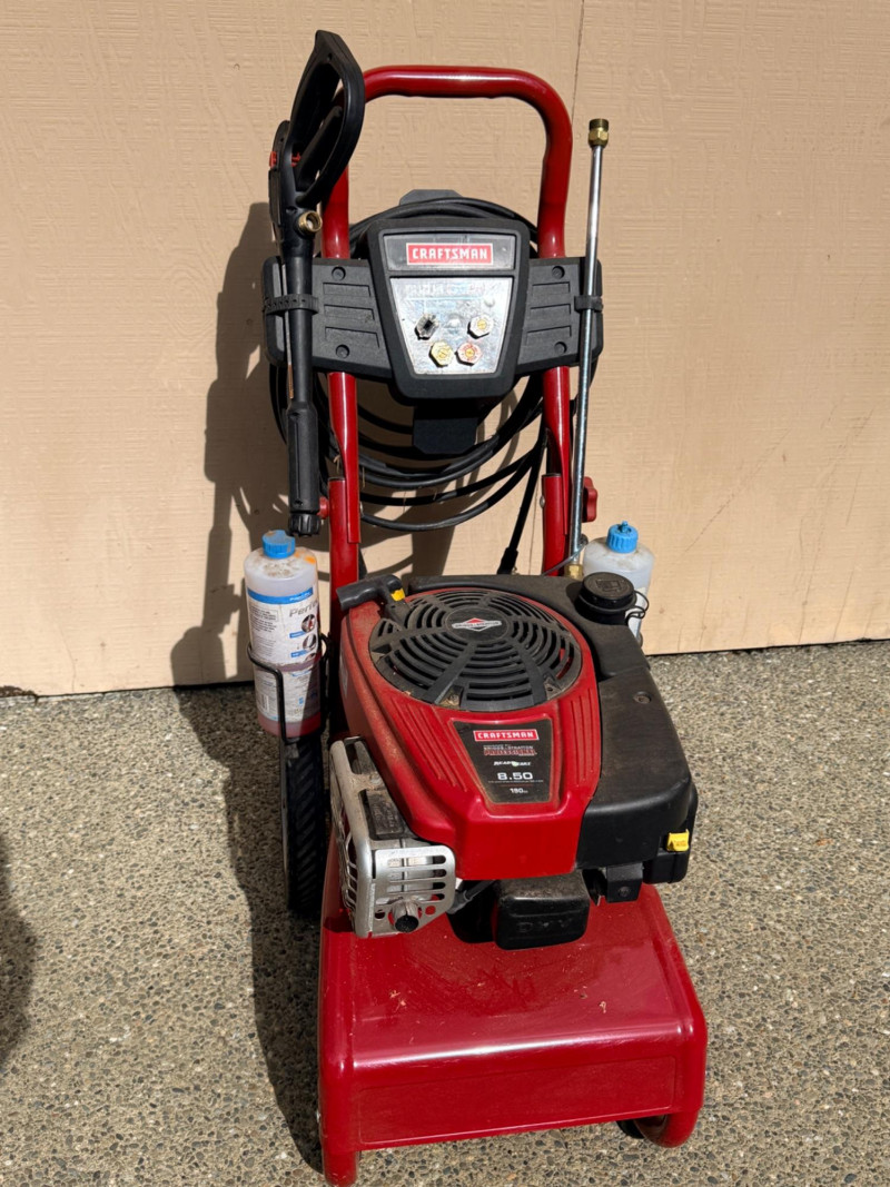 Craftsman Briggs & Stratton Professional Series Pressure Washer Craftsman gas-powered pressure washer. Model 580.754920 from the Professional Series. It is powered by a Briggs & Stratton engine featuring 8.50 ft-lbs of gross torque. Equipped with a direct-from-concentrate soap system and a flexible hose. Includes operators manual. Fuel removed for seasonal storage.