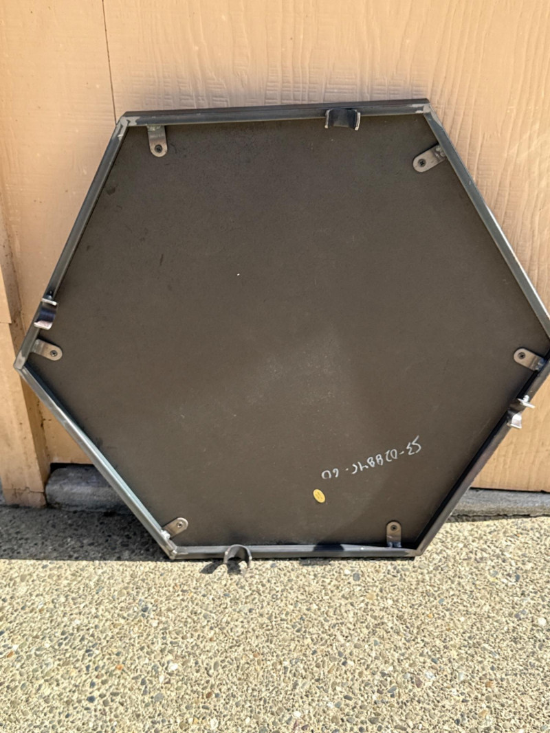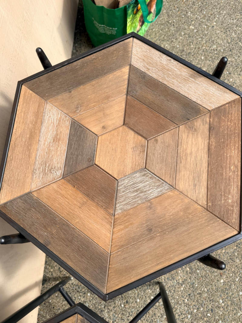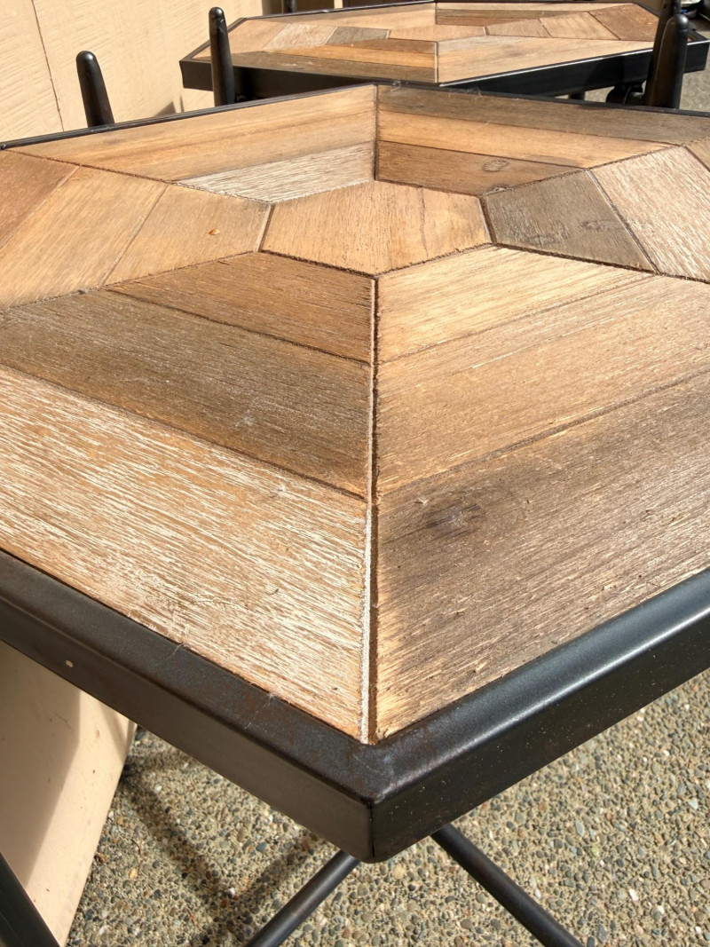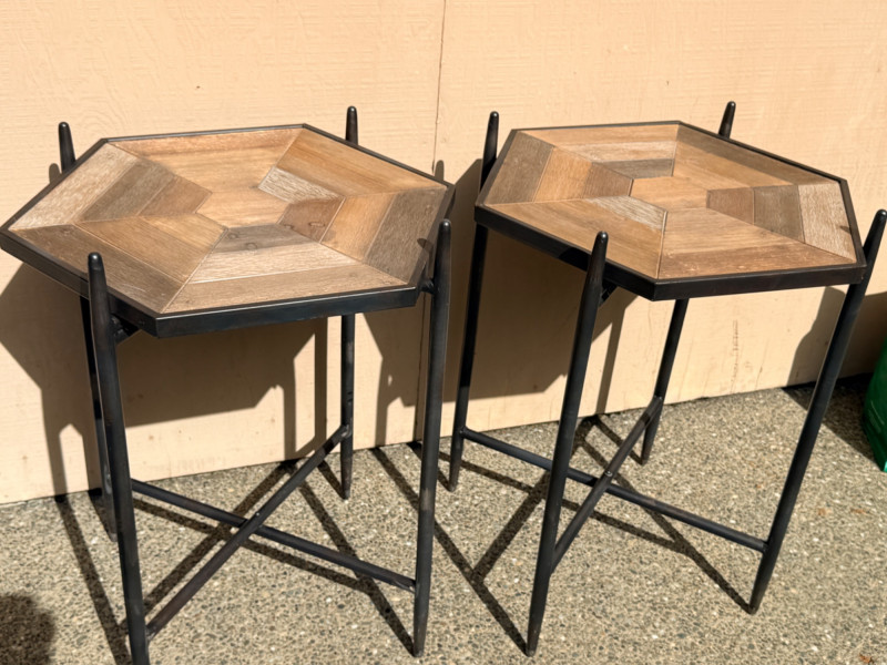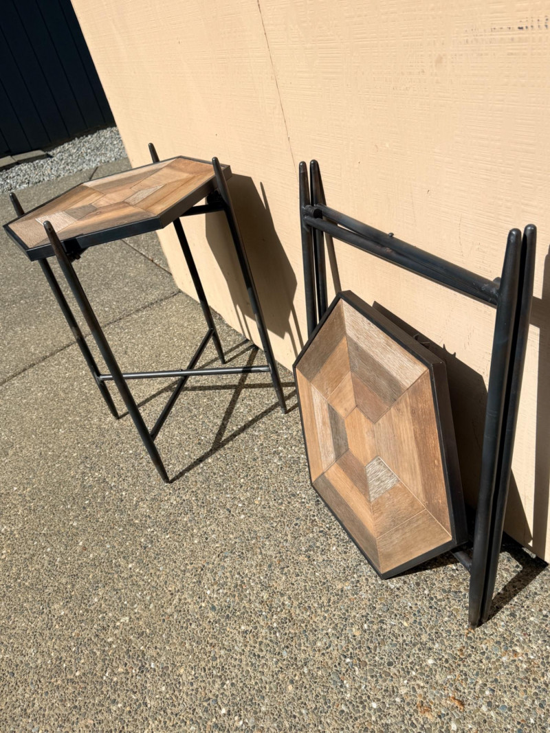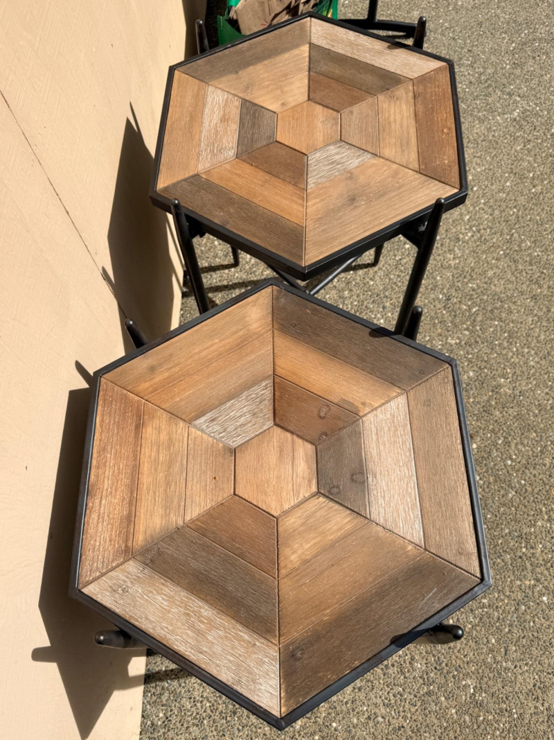 (2) Collapsible Metal Frame Wood Top Side Tables Hexagon wood table surface with black metal folding base. Folds flat for storage. 22”x19”x28