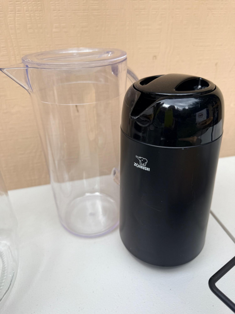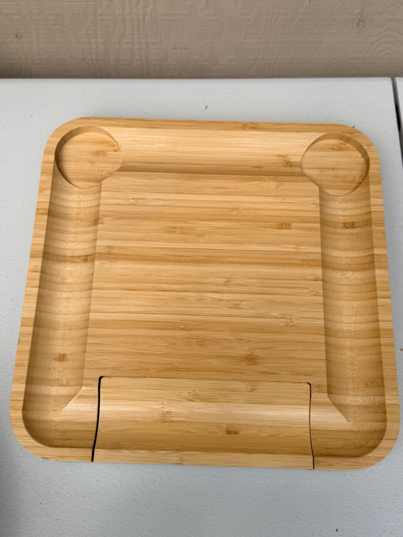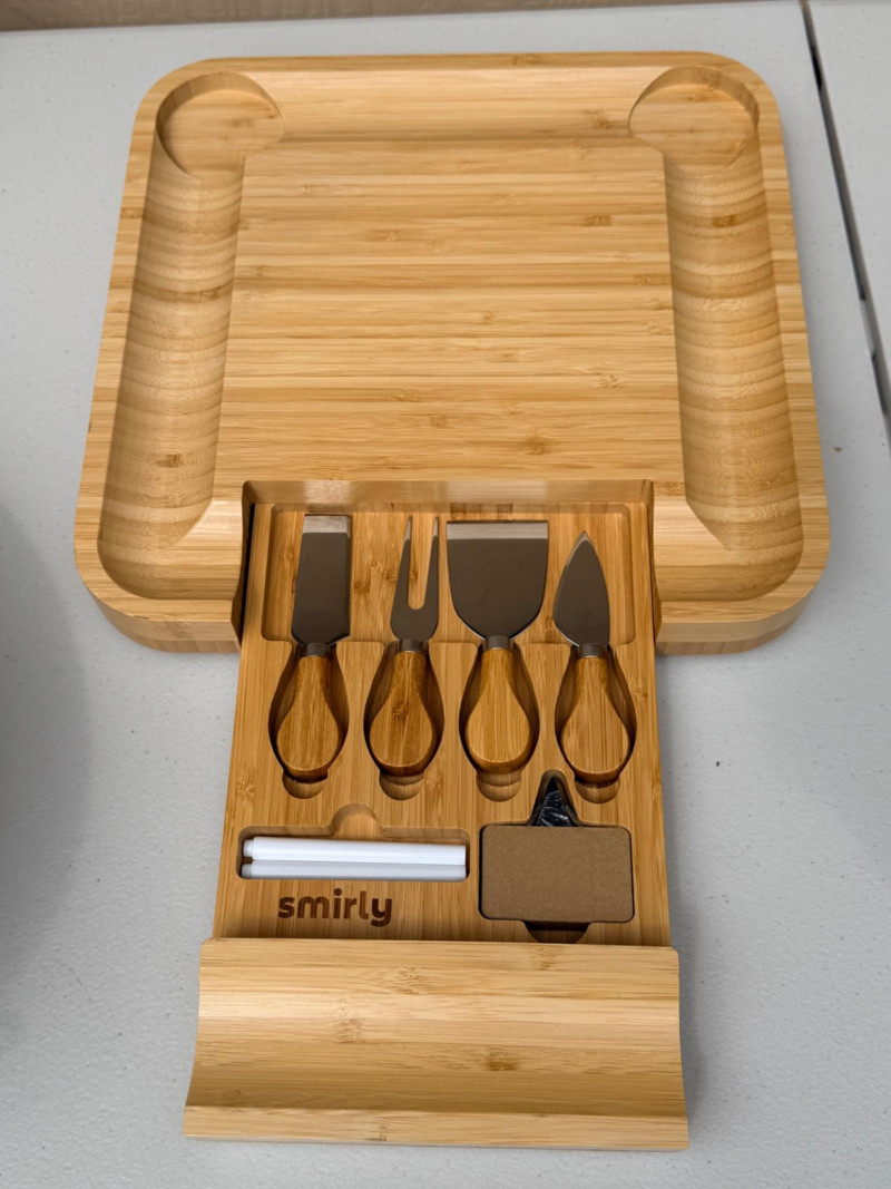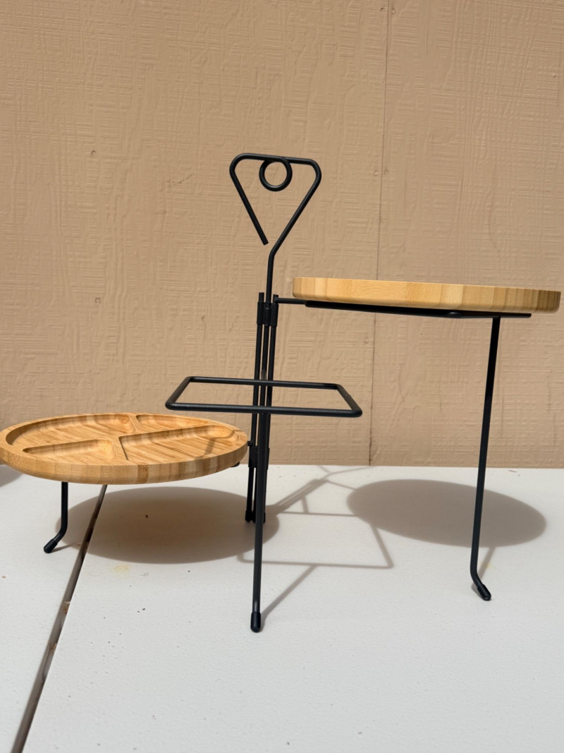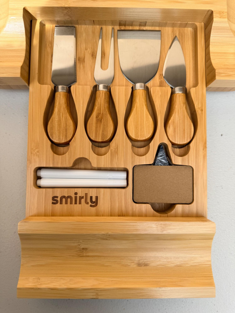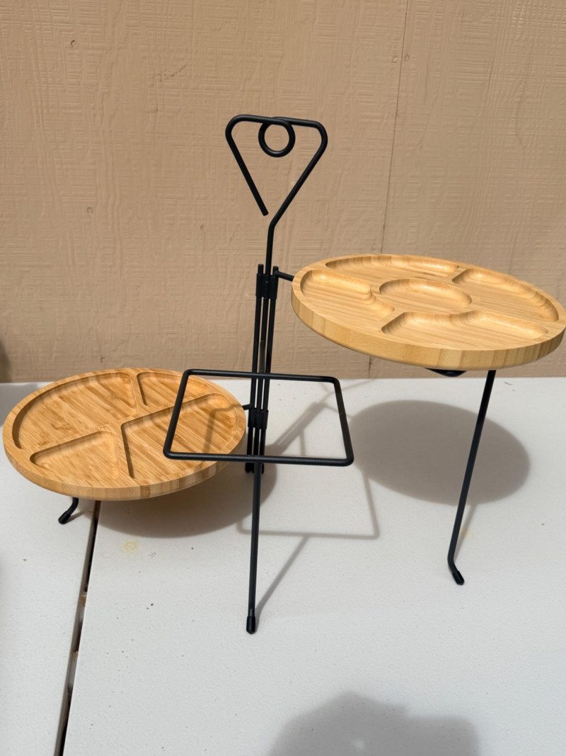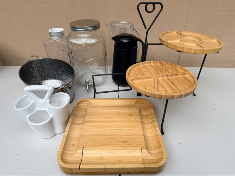 Be Summer Party Ready! Bamboo cheese board with on board knife storage is 13”x13” 2 Bamboo serving plates Ceramic utensil holder Oval double handle bucket 3 tier plate holder for appetizers or desserts Glass refrigerator pitcher Acrylic pitcher Zojurushi hot beverage carafe