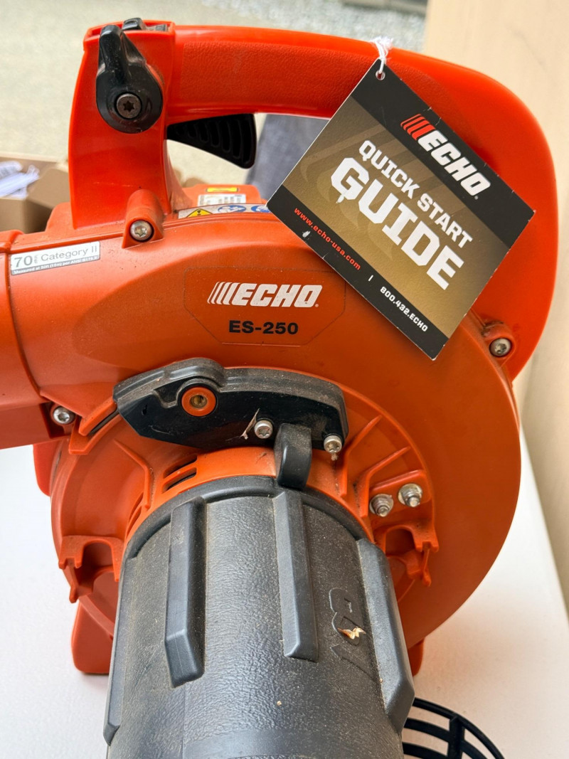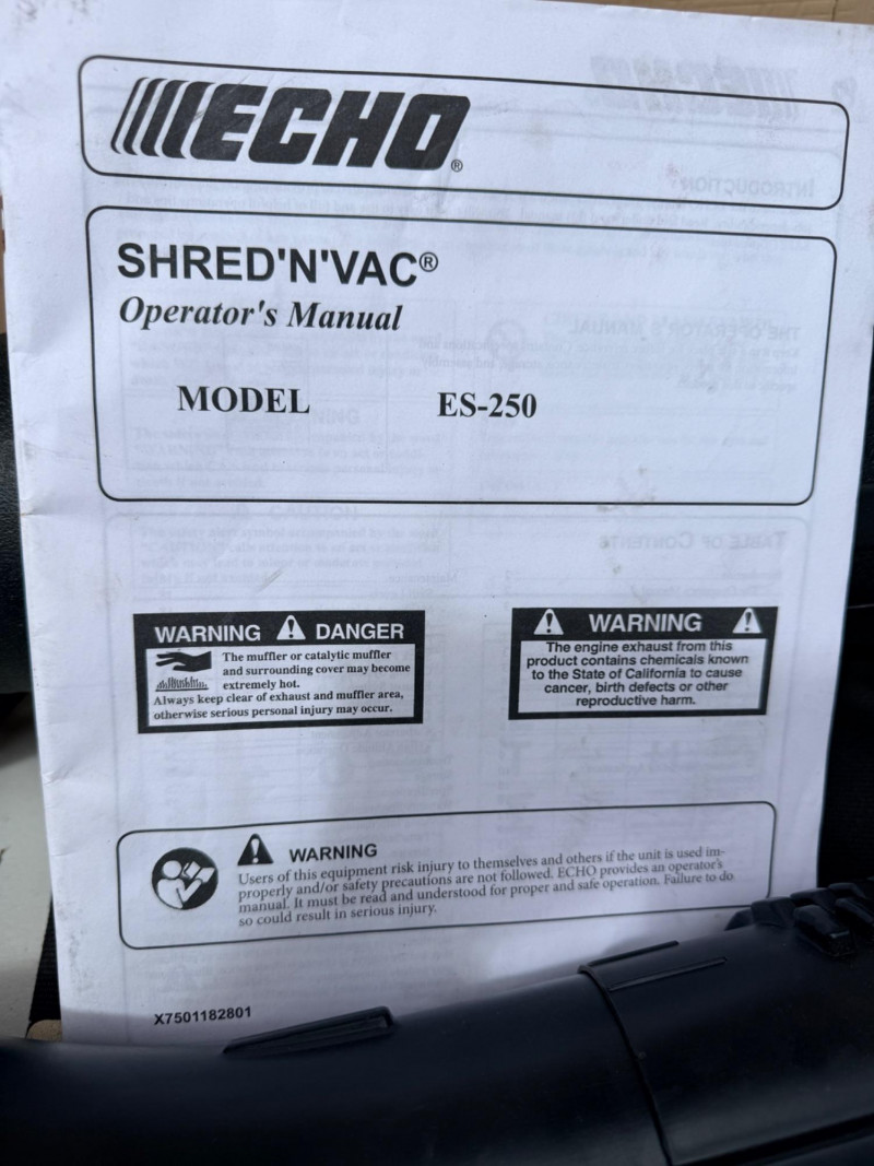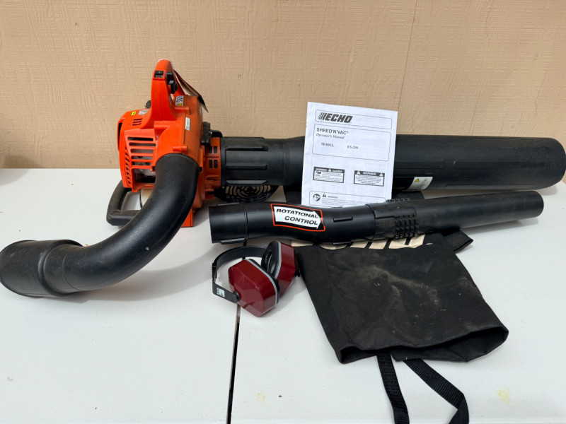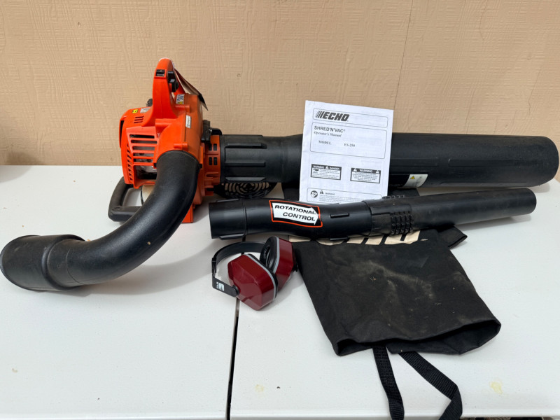 Echo Shred 'N' Vac ES-250 Three tools in one: easily converts from blower to vacuum/shredder Patented 4-blade shredding mechanism reduces debris by a ratio of 12:125. 4 cc professional-grade, 2-stroke engine. Tested, works!