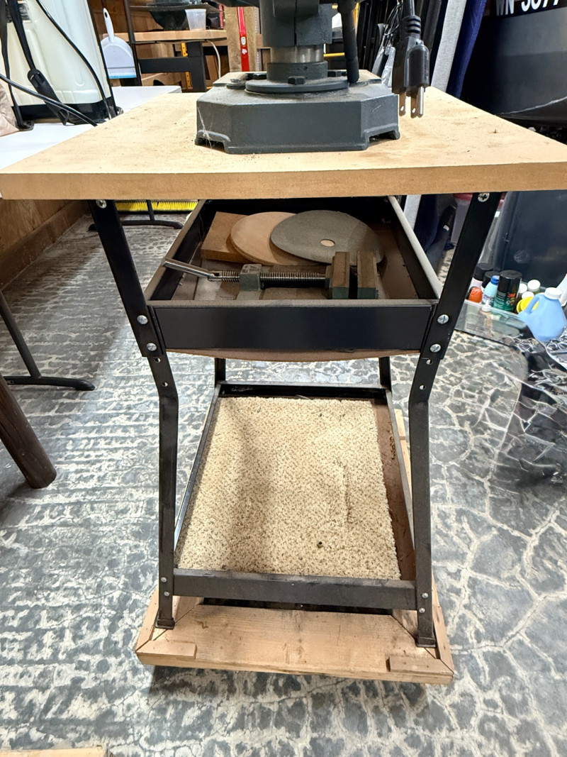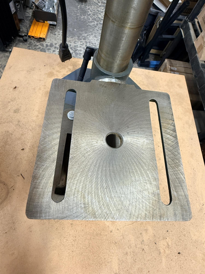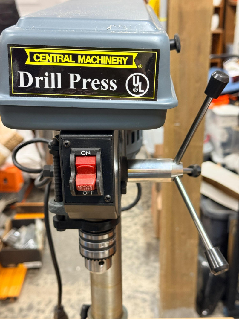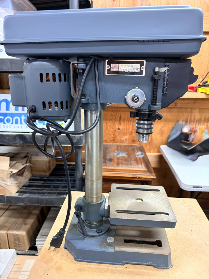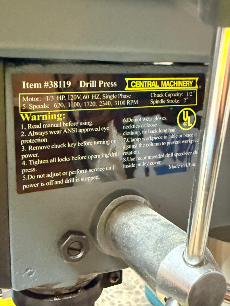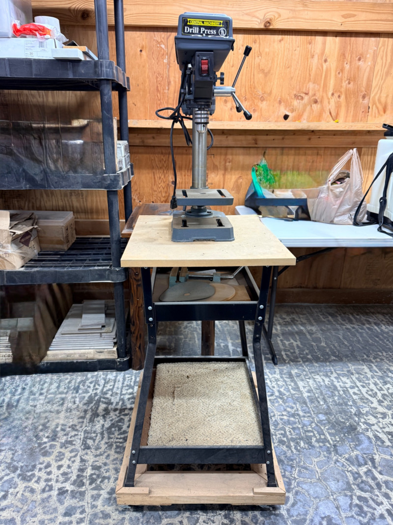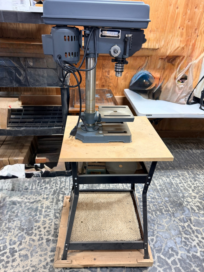 Central Machinery Drill Press on stand and rolling base. The Central Machinery Model 813B is a 5-speed, 8-inch benchtop drill press powered by a 1/3 HP, 2.4 amp motor, ideal for light-duty, hobbyist, and woodworking tasks. Key specs include a 620-3100 RPM range, 1/2-inch keyed chuck, 2-inch spindle travel, and a 45-degree tilting worktable. Features:Motor: 120V / 60Hz, 1/3 HP (2.4 Amps)Speeds: 5 Speeds ( RPM) Chuck Capacity: 1/2 inch (keyed)Swing: 8 inches Spindle Travel: 2 inches Table: Tilts left/right, 360-degree rotation Base Dimensions: 7-1/2 in. x 11-1/2 in. Tested, works! Includes a metal stand on platform base with wheels.
