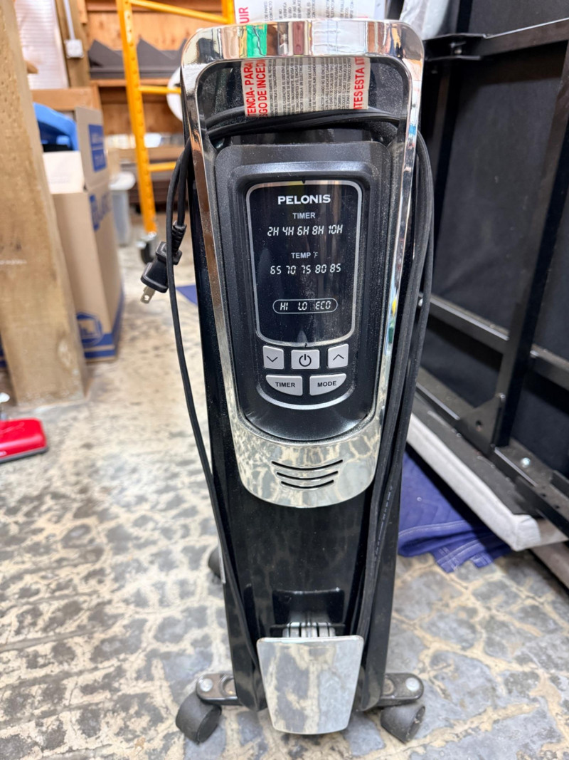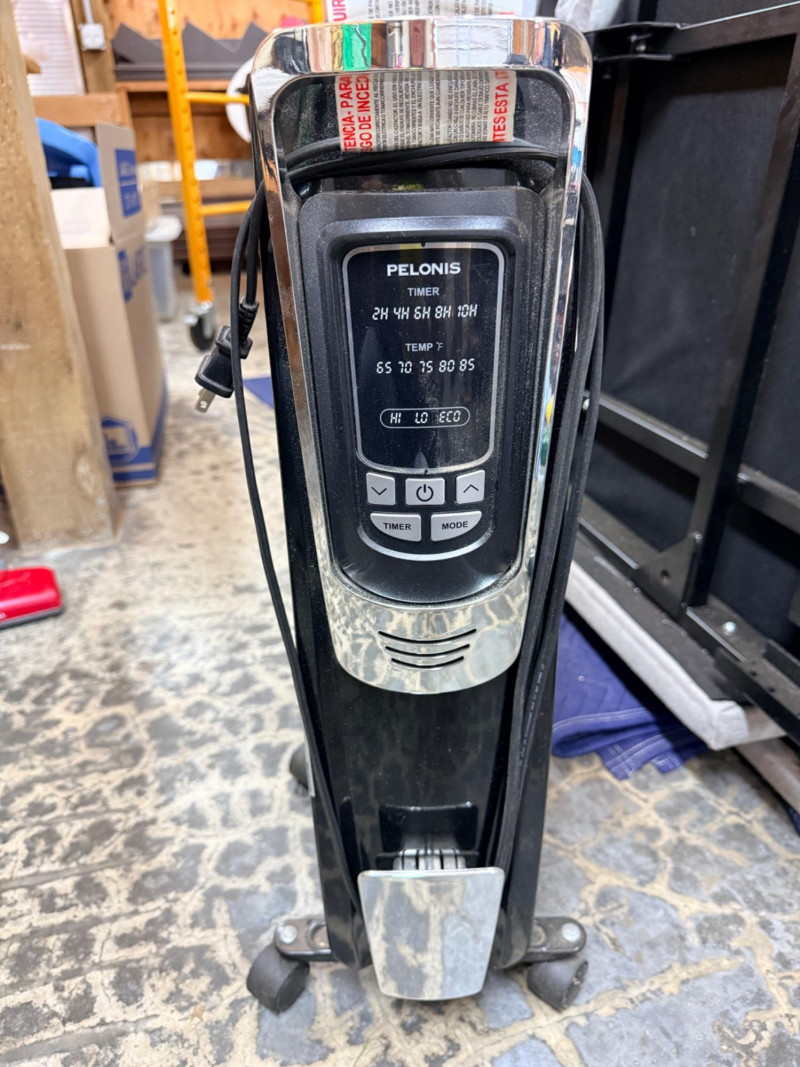 Pelonis Compact Oil Radiant Heater 2-10 hour timer 65-85 degree temperature range. Tested, works! Measures 9”(includes caster) x14”x24”