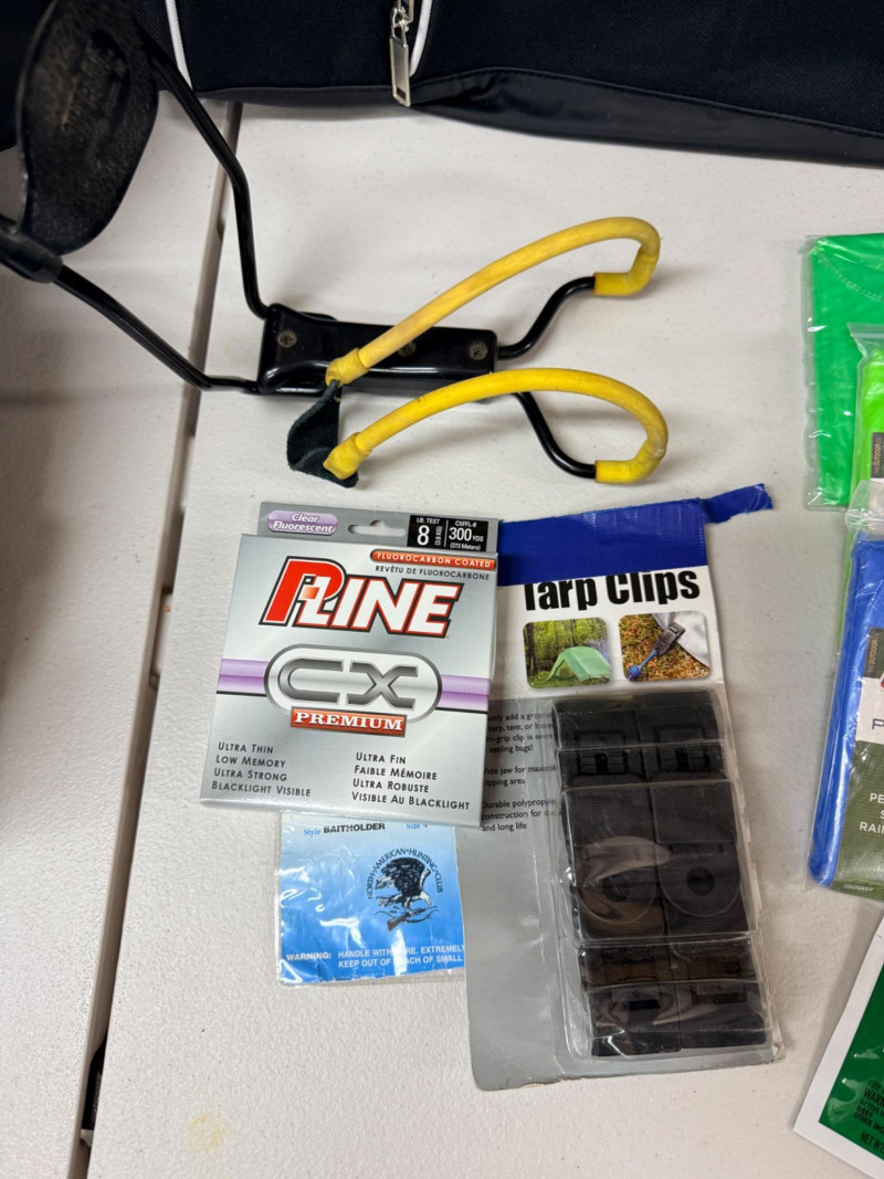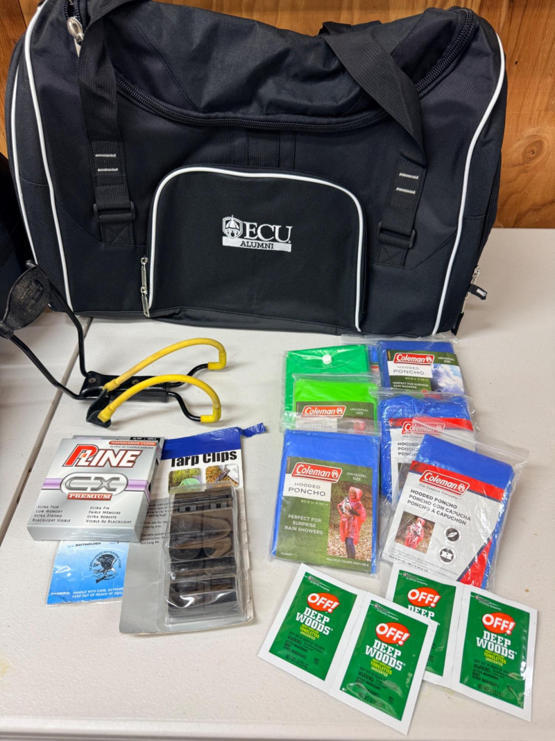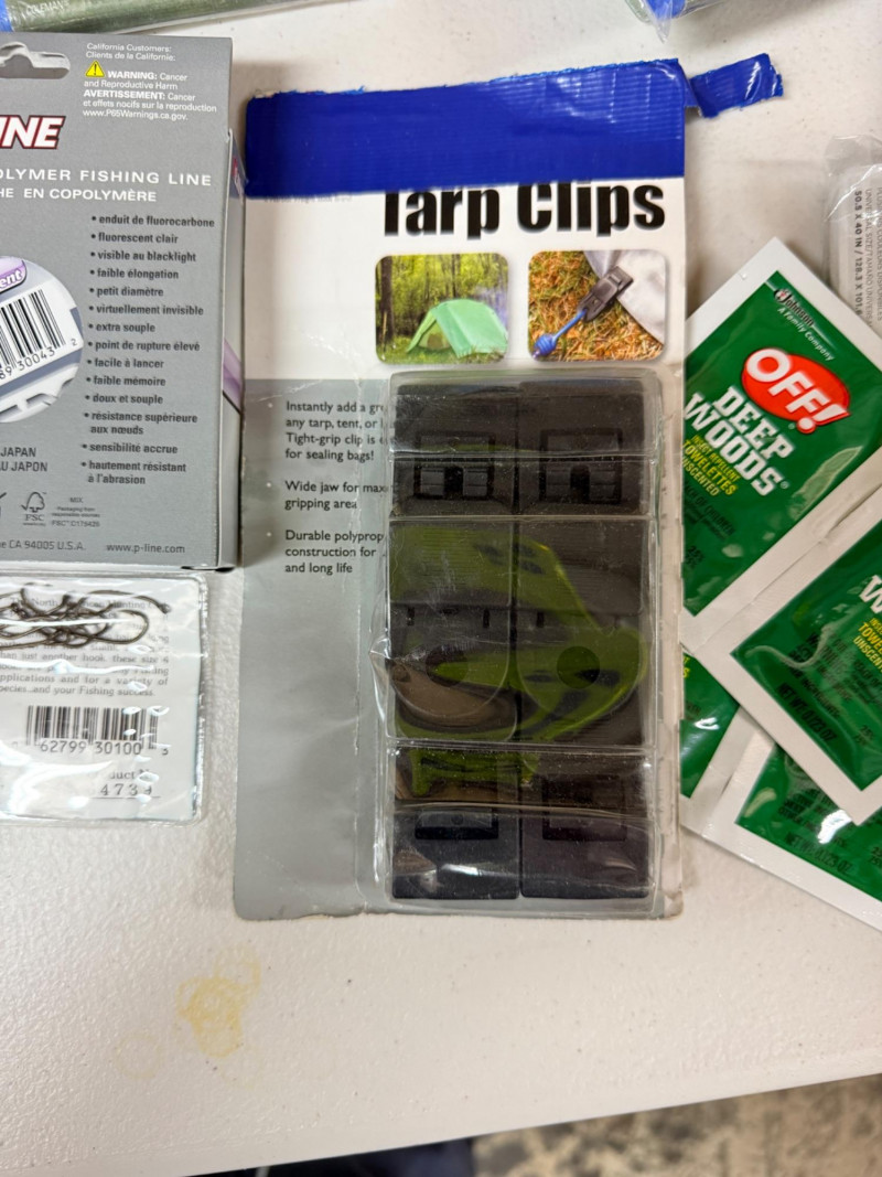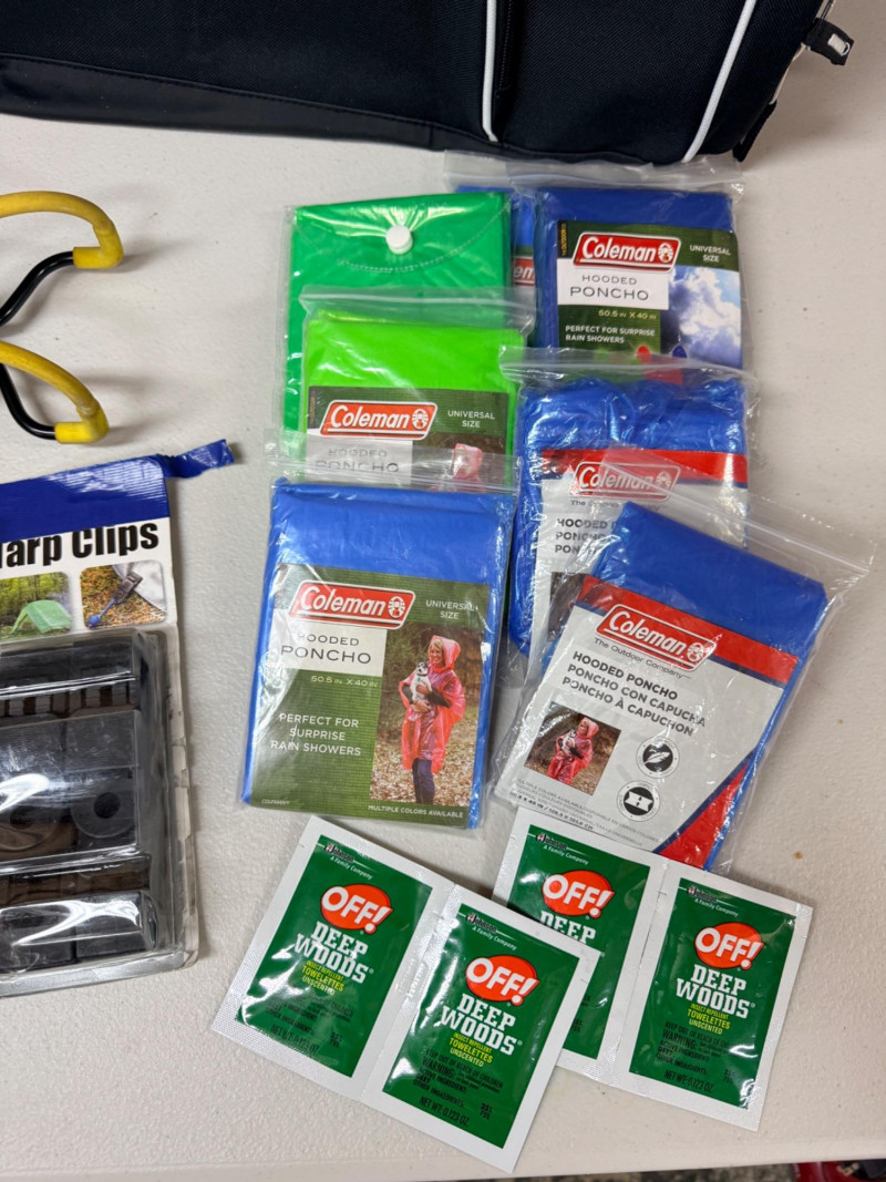 Camping Gear Picnic Time picnic blanket compliments of Cap Med Ctr (7) Coleman ponchos Deep Woods Off towelettes Tarp clips PLine fishing line NIP Baitholder size 4 fishing hooks. Bag measures 21”x13”x14”