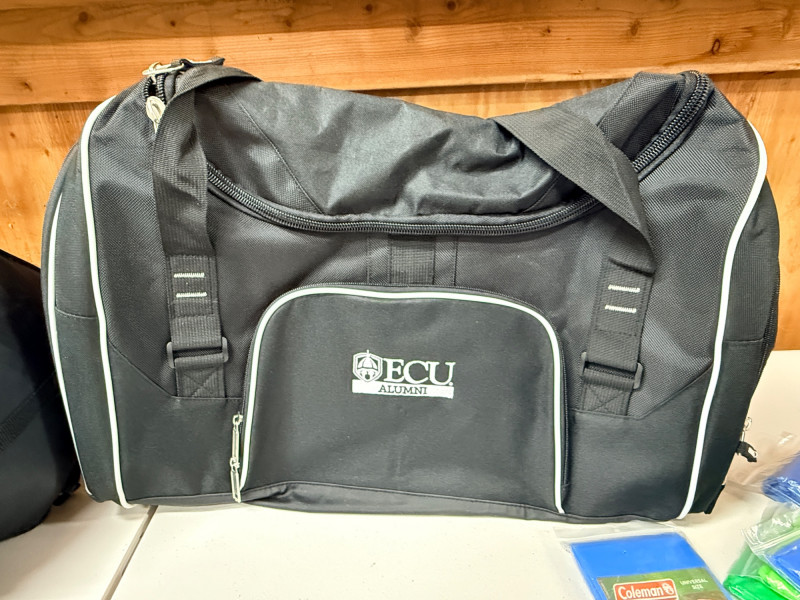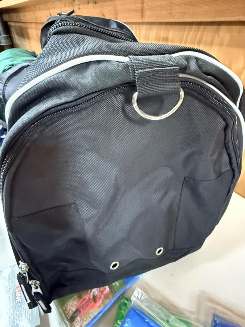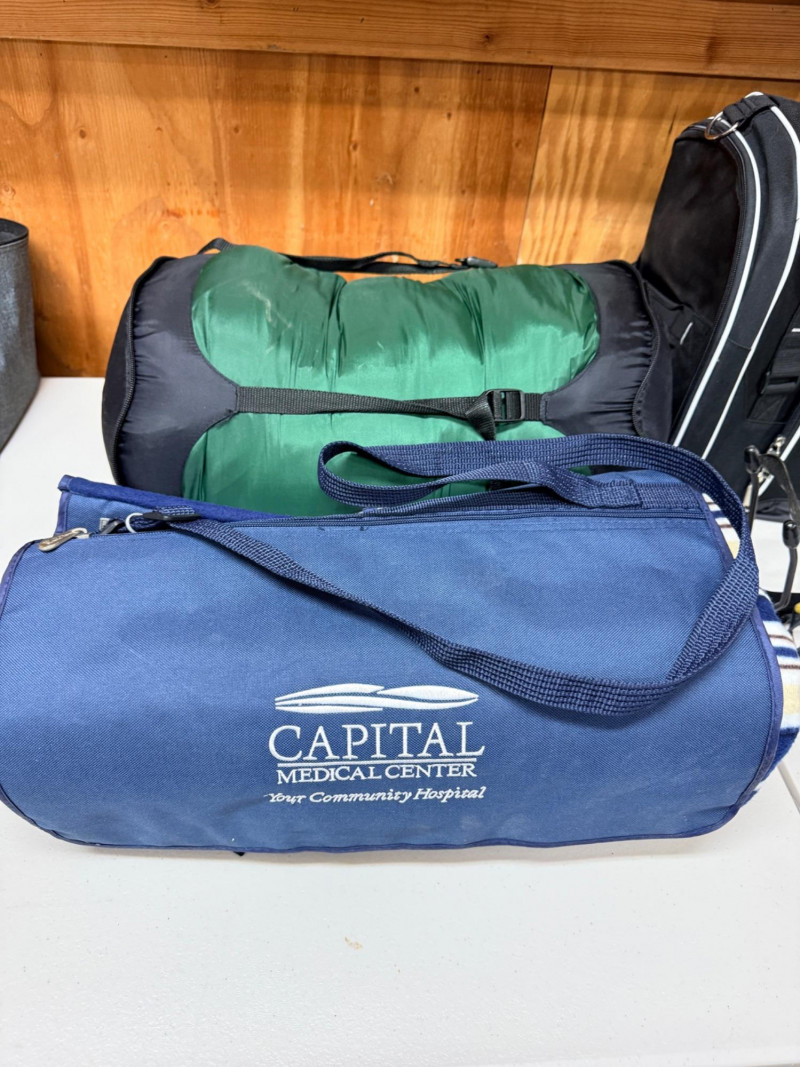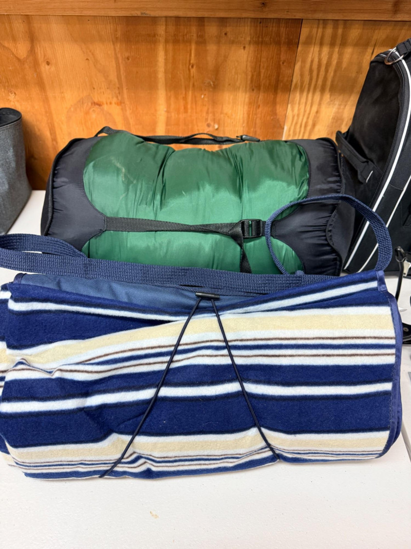 Camping Gear Picnic Time picnic blanket compliments of Cap Med Ctr (7) Coleman ponchos Deep Woods Off towelettes Tarp clips PLine fishing line NIP Baitholder size 4 fishing hooks. Bag measures 21”x13”x14”
