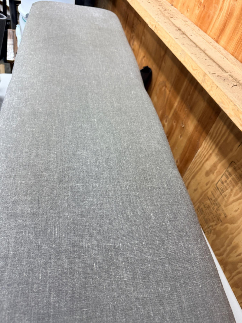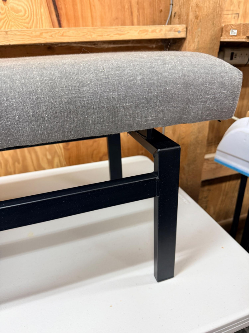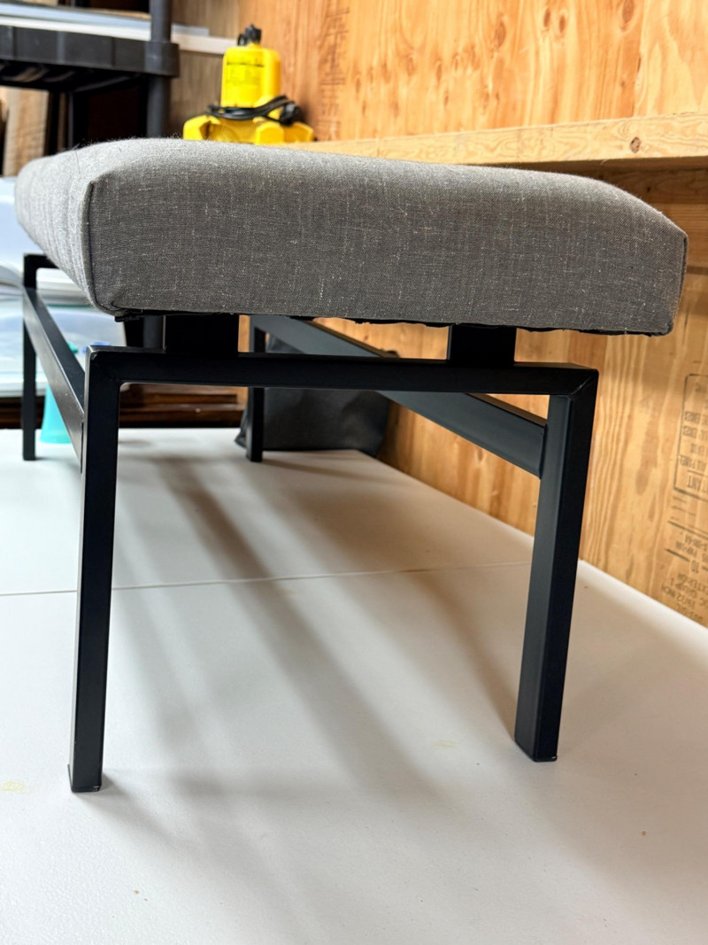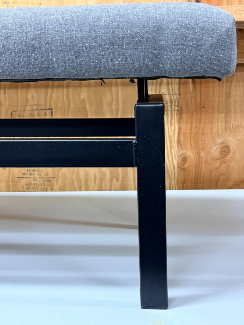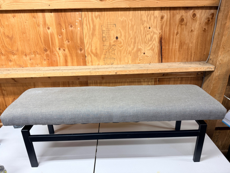 Metal Frame Upholstered Bench Black metal frame with gray upholstery measures 52” x 15” with 17 inch seat height.