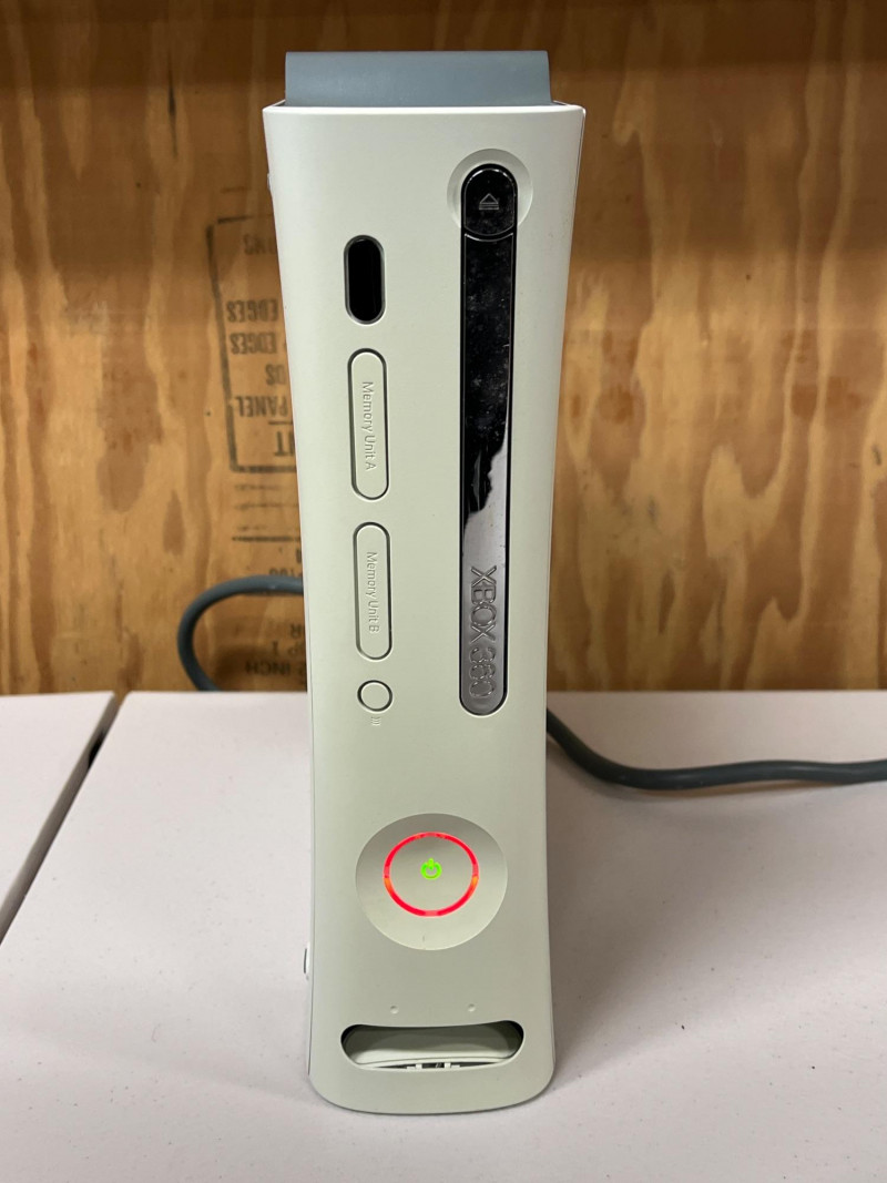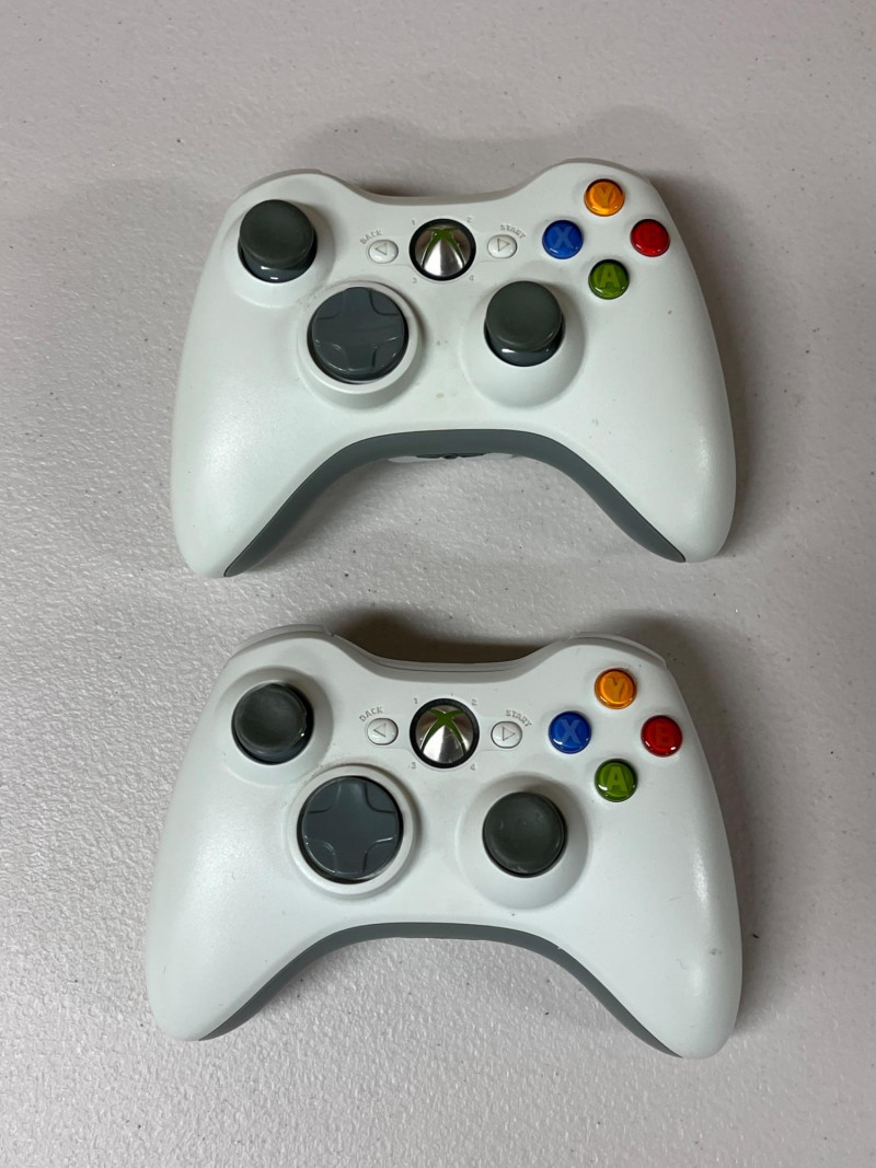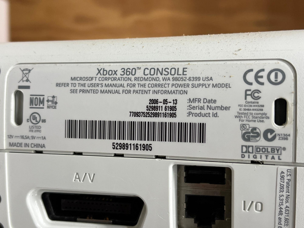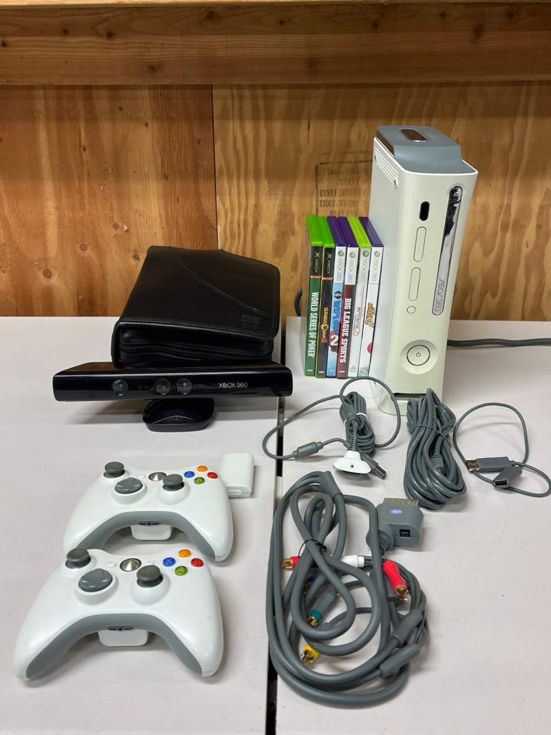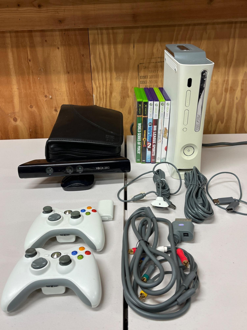 Xbox 360 - Games - Accessories! Home video game console, specifically the original "Pro" or "Core" white model. A matte white fat console known for its distinctive concave shape. Detachable gray hard drive mounted to the top. Two controllers Power cords and other miscellaneous cords. Twenty-nine games total. Kinect. Tested: Powers on. Mfg 2006