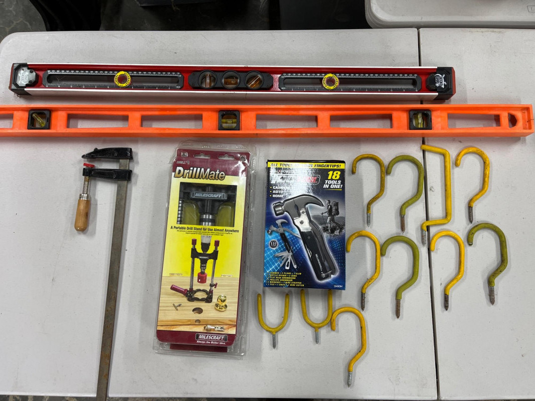 Levels - Clamp - Drill and Store Miscellaneous Tool Lot 36” Aluminum Gecko Grip level 48” Johnson Composite level 20.5” F-Style steel bar clamp (11) rubber coated screw hooks NIP DRILLMATE portable drill stand. NIP TacTool 18 tools in one.