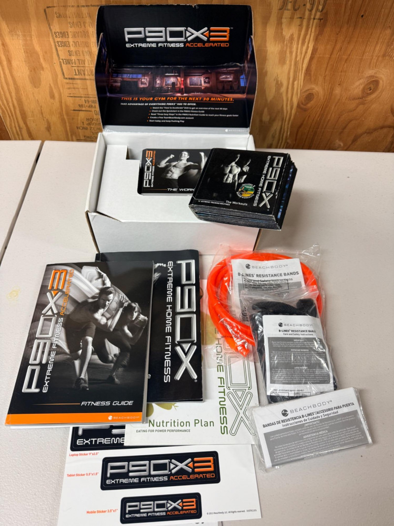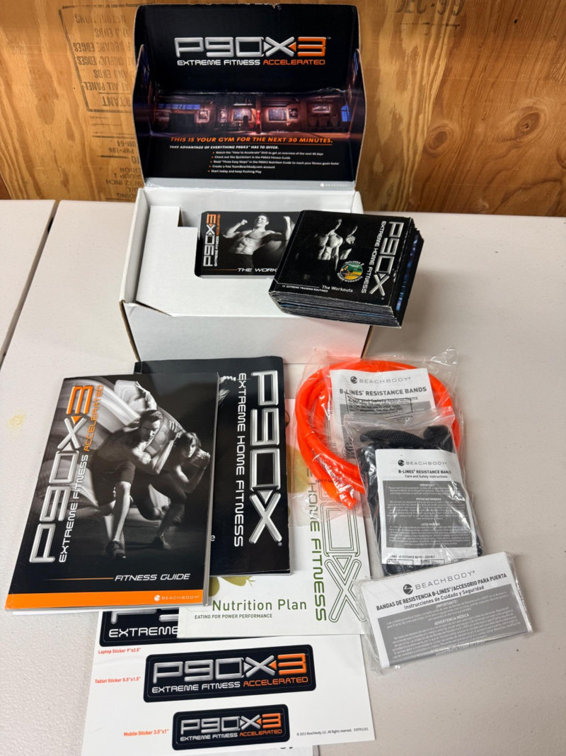 P90X and P90X3 Extreme Home Fitness Beach Body System 12 CD Extreme Training Routines 13 Beach Body 3X Workout CD’s (2) Resistance bands B-Lines Resistance bands 2 Fitness Guides Nutrition Plan