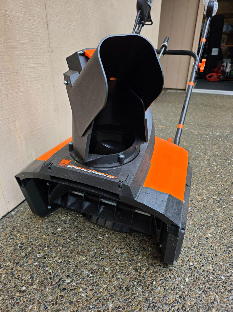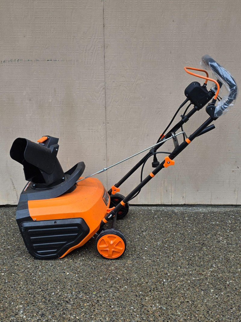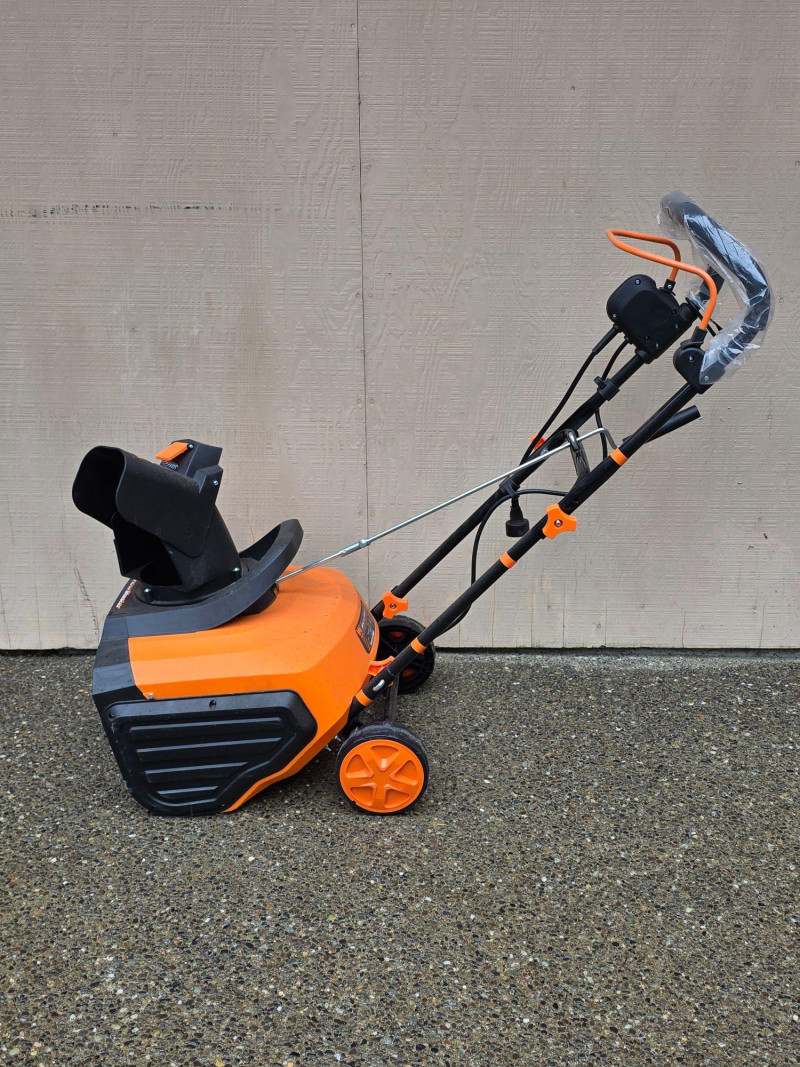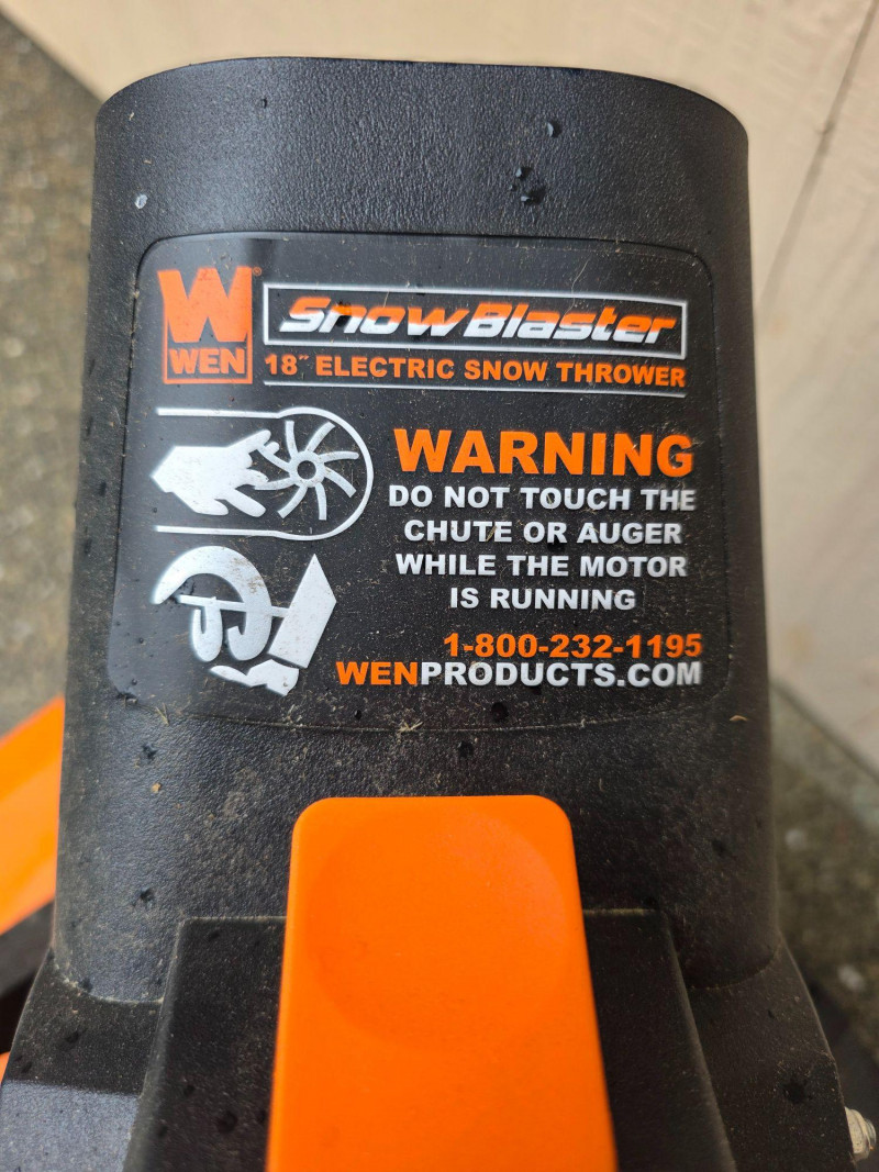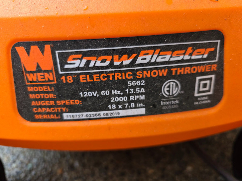 WEN Snow Blaster 18" Electric Snow Thrower WEN Model #5662 13.5 Amp corded electric motor Clears a path 18 inches wide and up to 8 inches deep Throws snow up to 20 feet away through an adjustable chute Lightweight design with 6" wheels for maneuverability Looks nearly new, still has plastic wrapped around the handlebar! Tested - Works! 38"T x 41"L x 17.5"W