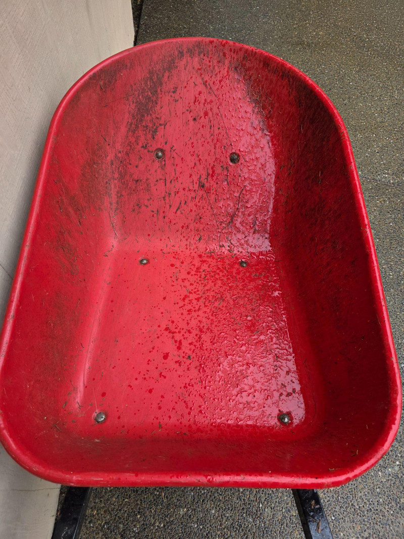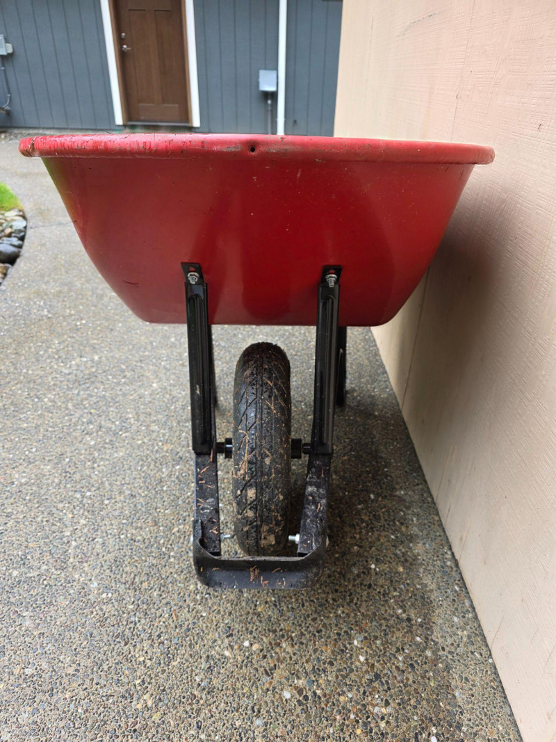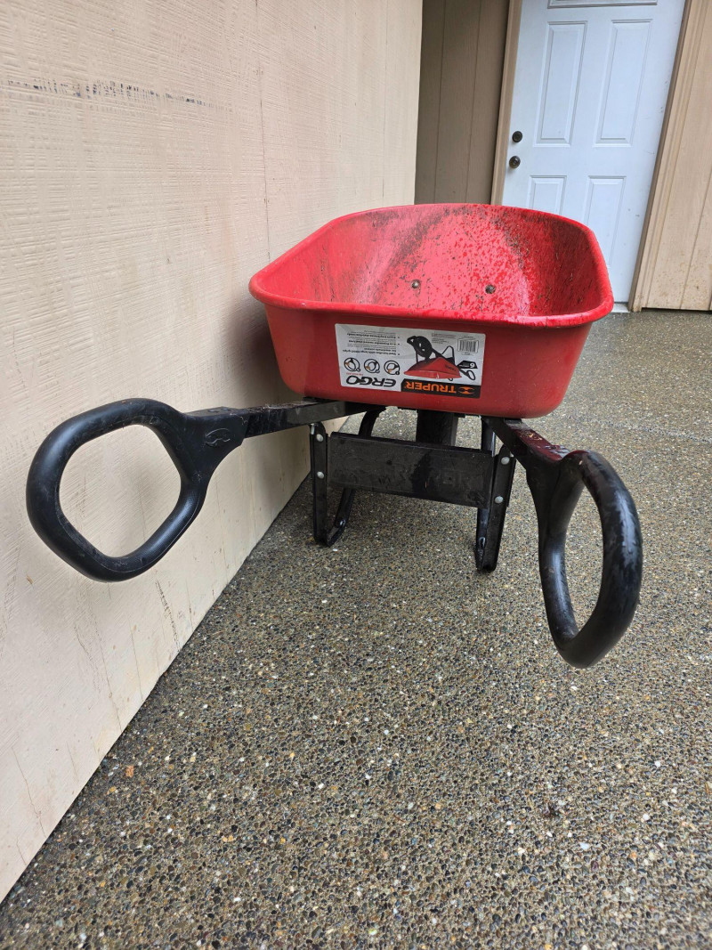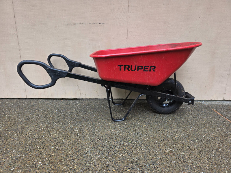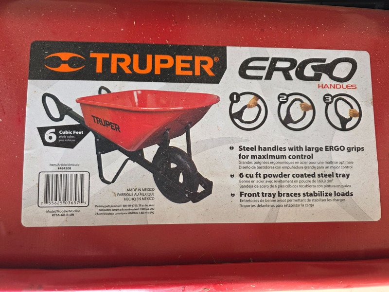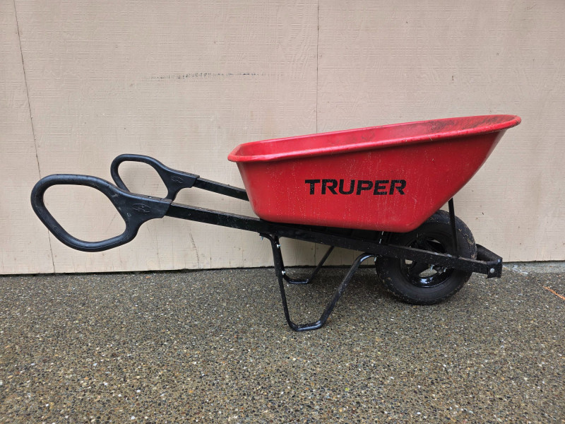 Truper 6 Cubic Foot Wheelbarrow Featuring a durable powder coated steel tray and ergonomic handles for enhanced control Capacity: 6 cubic foot steel tray Steel handles equipped with large ergonomic grips Front tray braces stabilize loads Single-wheel design, equipped with a 16-inch tire with a sport rim for smooth transport across various terrains In good, used condition! 28.5"T x 60"L x 25.5"W
