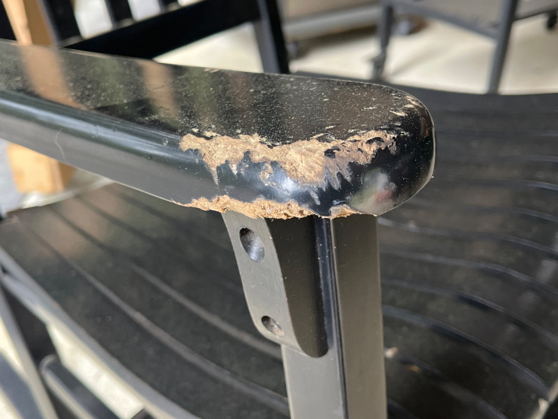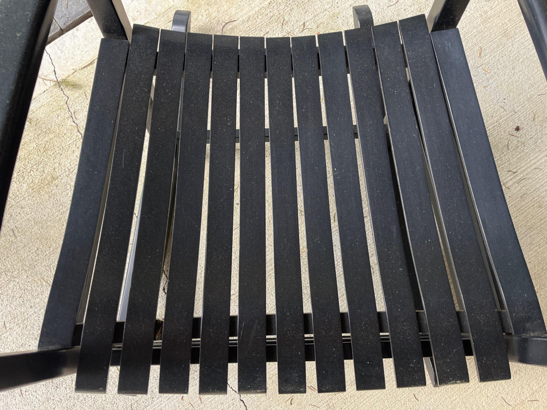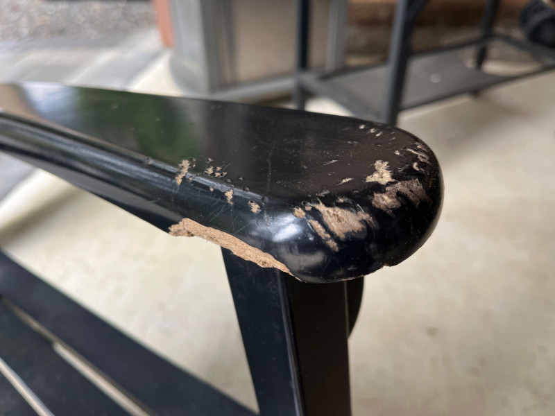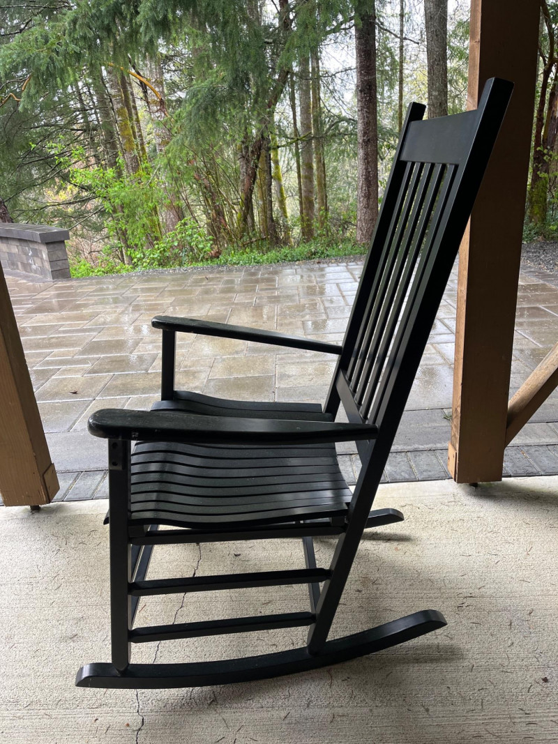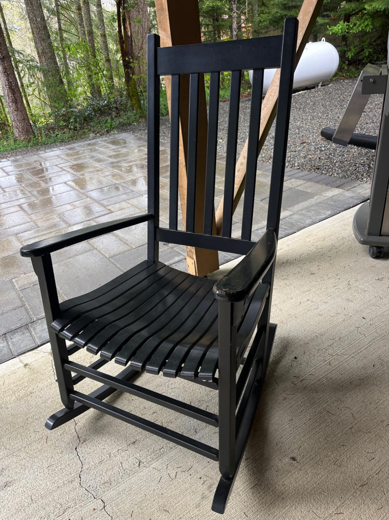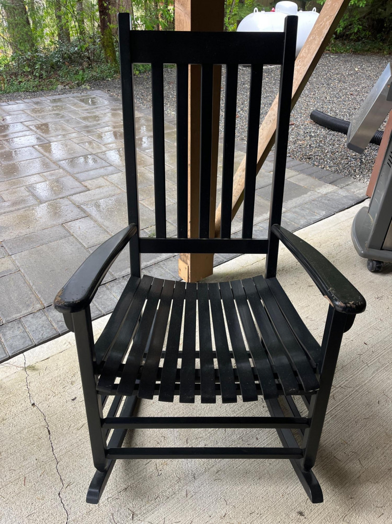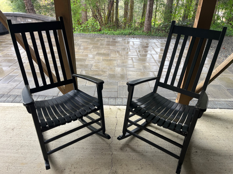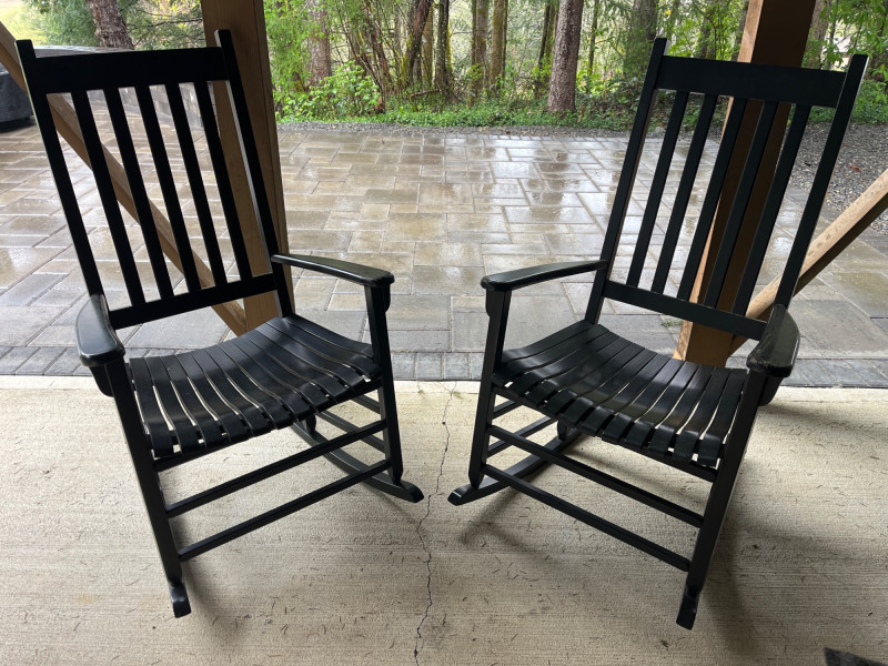 (2) Wooden Indoor/Outdoor Rocking Chairs Two black painted chairs. Slatted backs and slatted seats. Some damage on the arm rests. See pictures for details. 44”Tx26”Wx30.5”D Seat height is 16.5”.