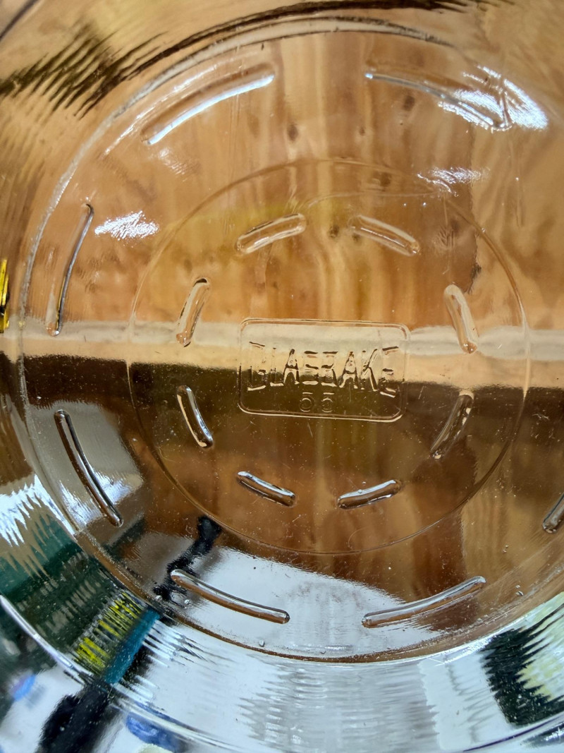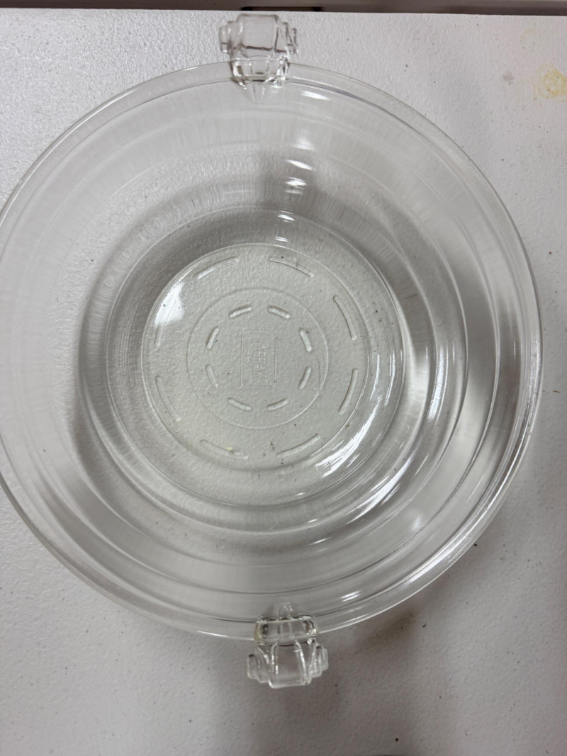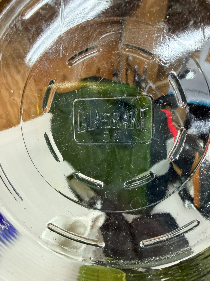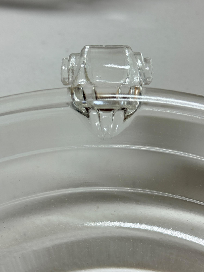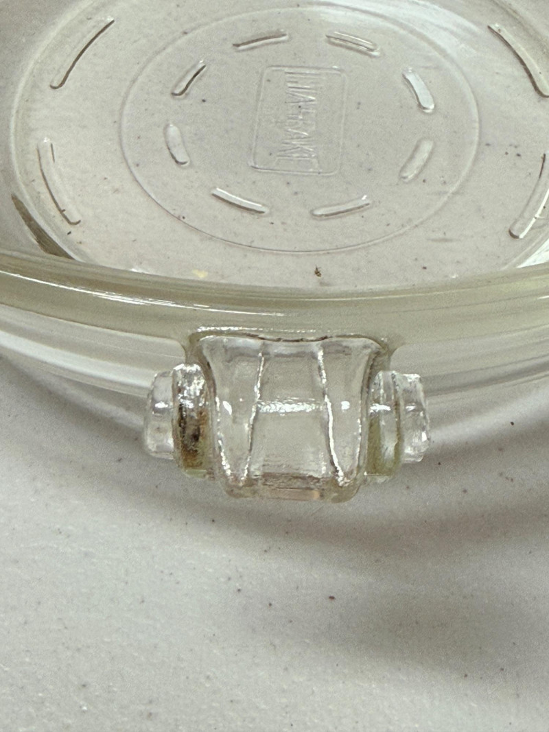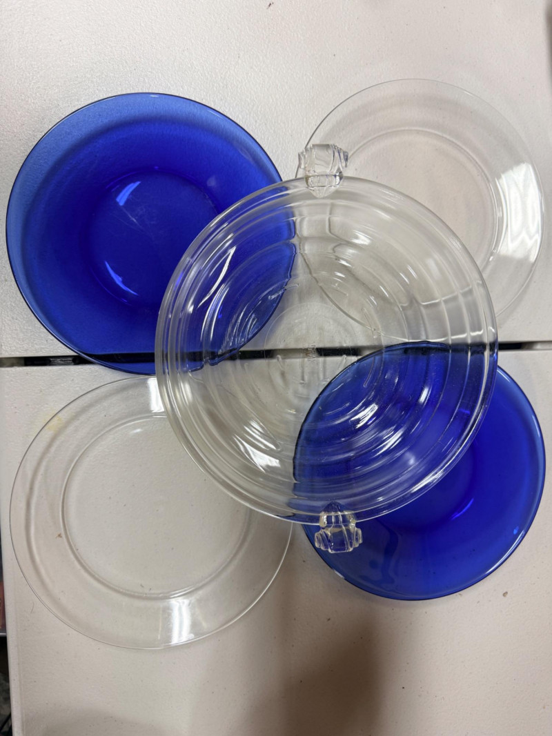 Vintage Art Deco Glasbake Casserole & 4 Plate Set (2) 8” Clear plates (2) 8” Blue transparent plates