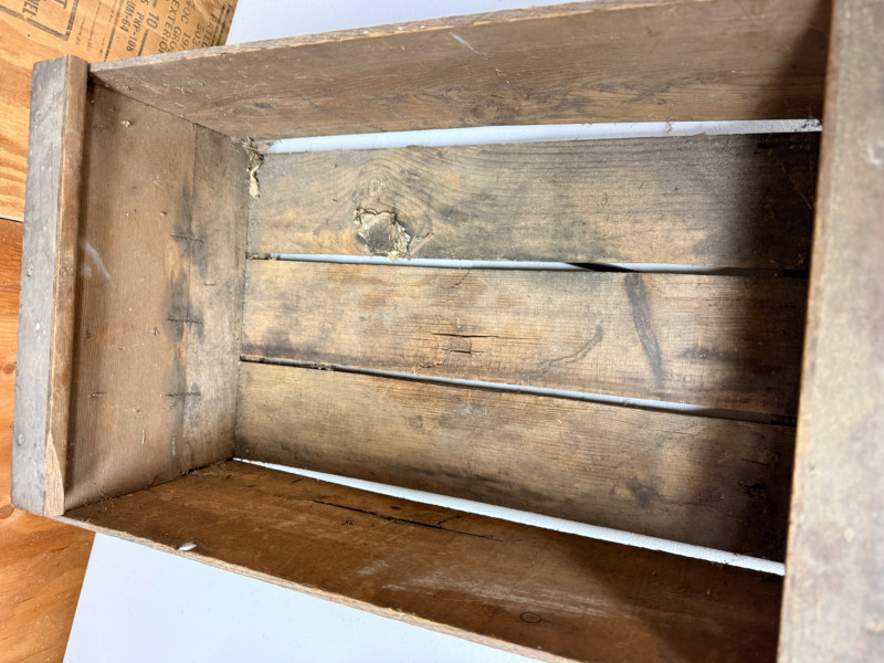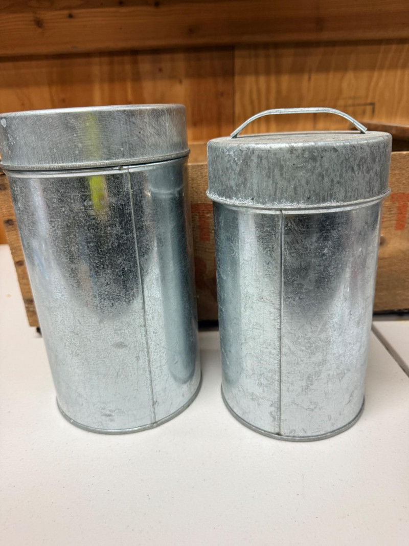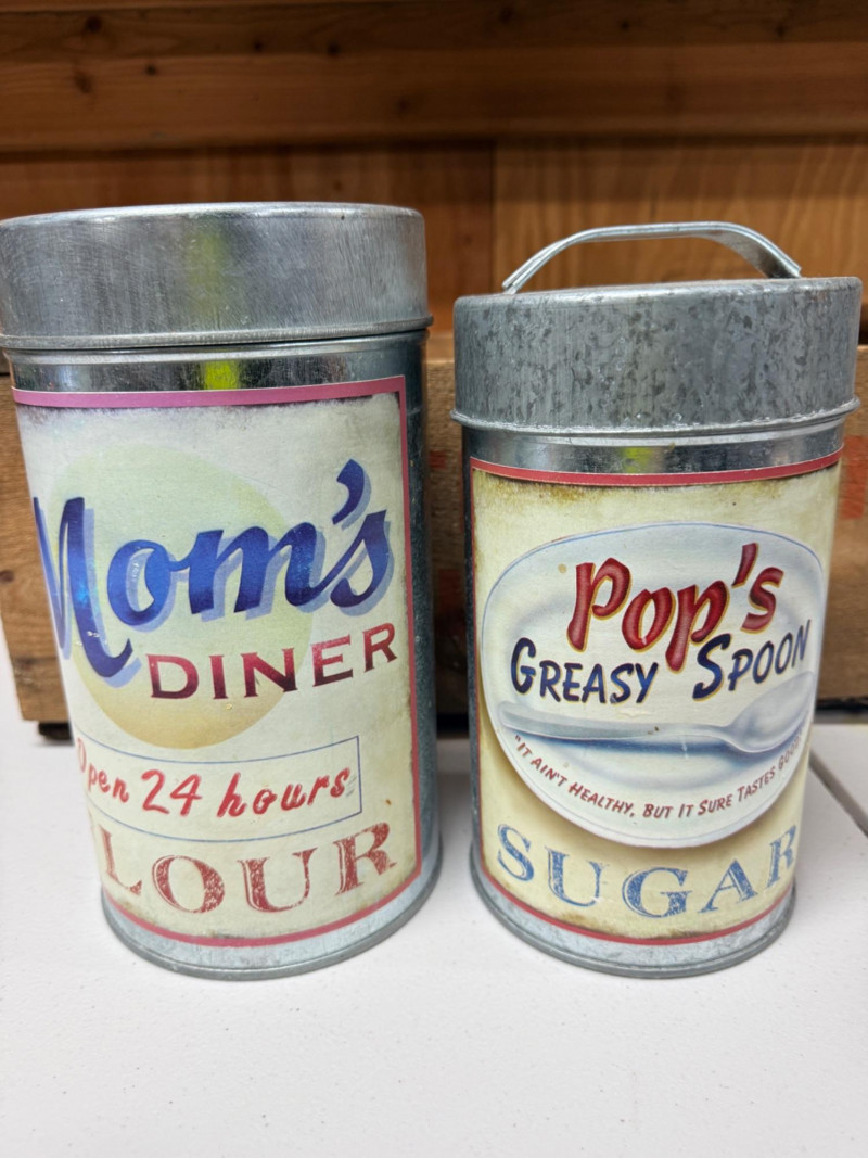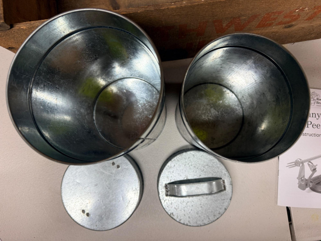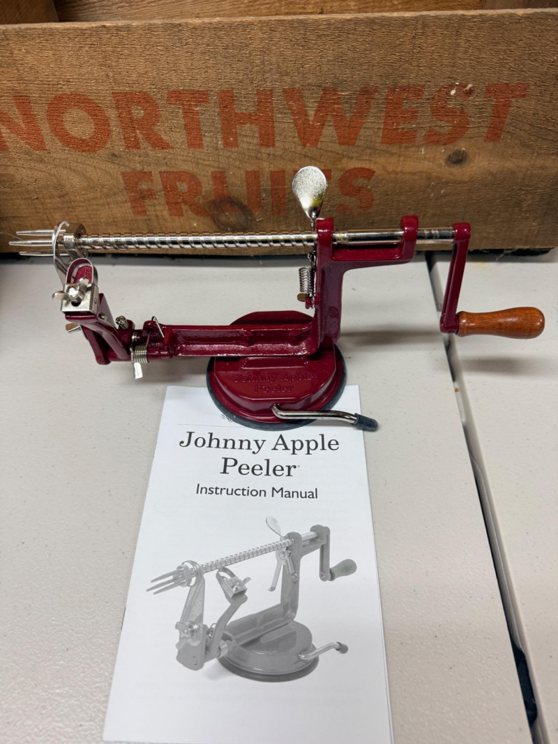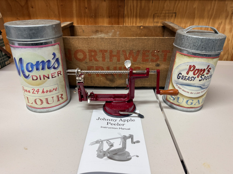 Northwest Fruits Crate - Apple Peeler - Flour/Sugar Tins Crate measures 19.5”x12”x8” with some rot in the middle floor support. Johnny Apple Peeler with instructions Decorative Flour and Sugar Tins. Flour is 10”x5.5”