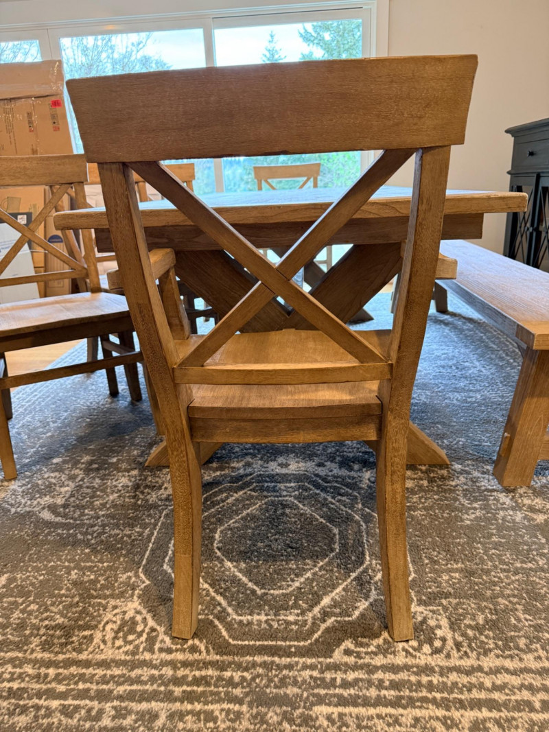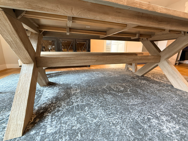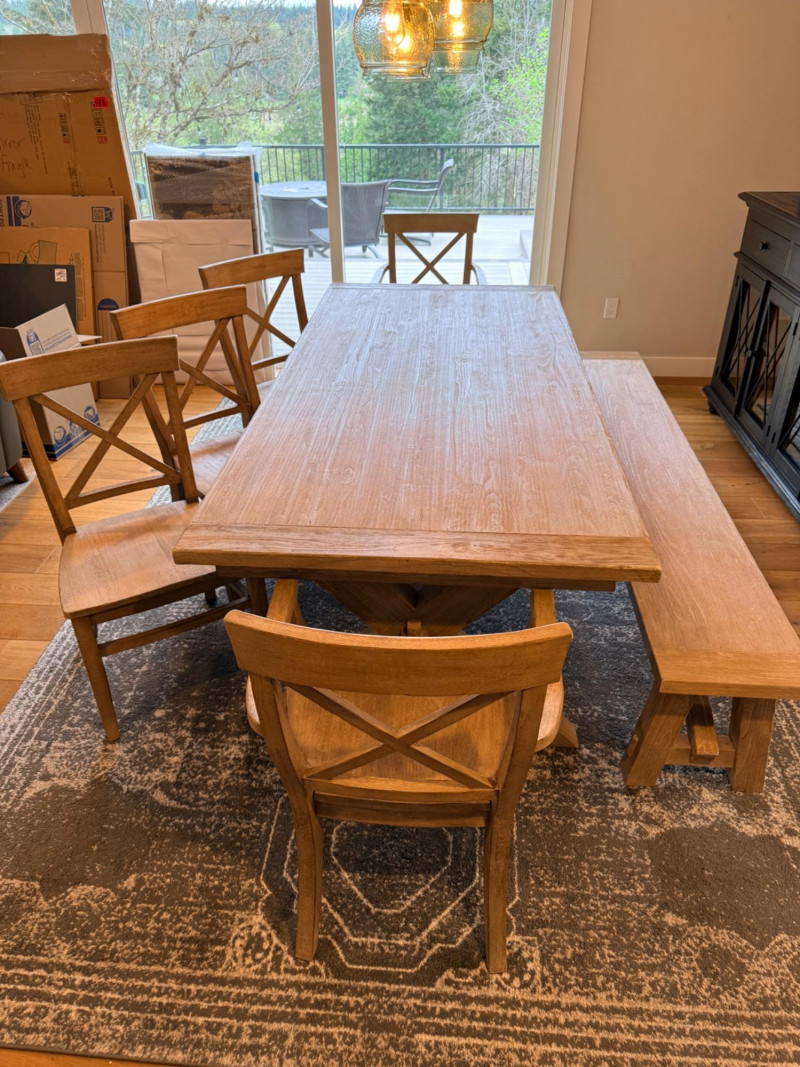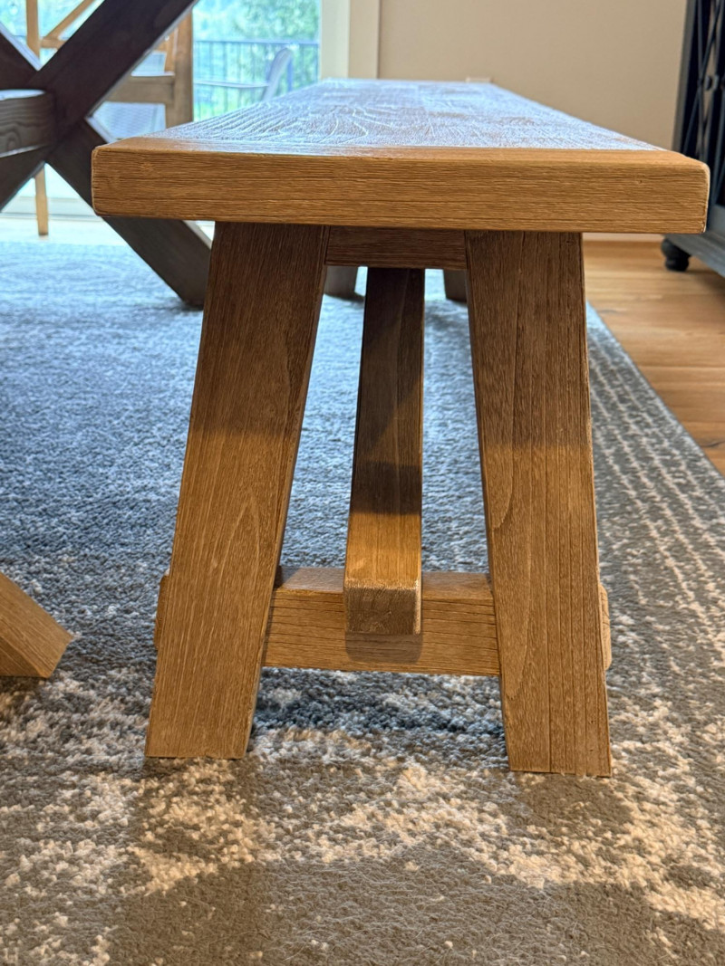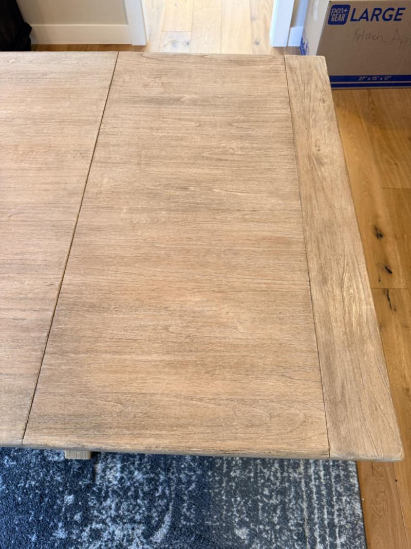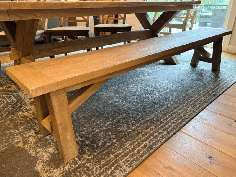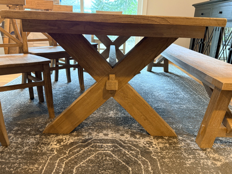 Pottery Barn Toscana Extendable Dining Table, Chairs & Bench. Toscana Extendable Dining Table, Seadrift, 88.5" - 124.5" (2 end of table leaves) Toscana Dining Bench, 88.5"L x 14"W, Seadrift Aaron Dining Arm Chair, Seadrift, Set Of 2 Aaron Dining Side Chair, Seadrift, Set Of 2 Currently available at PotteryBarn.com or click this direct link: Pottery Barn Table and Chairs Quality Pottery Barn furniture.