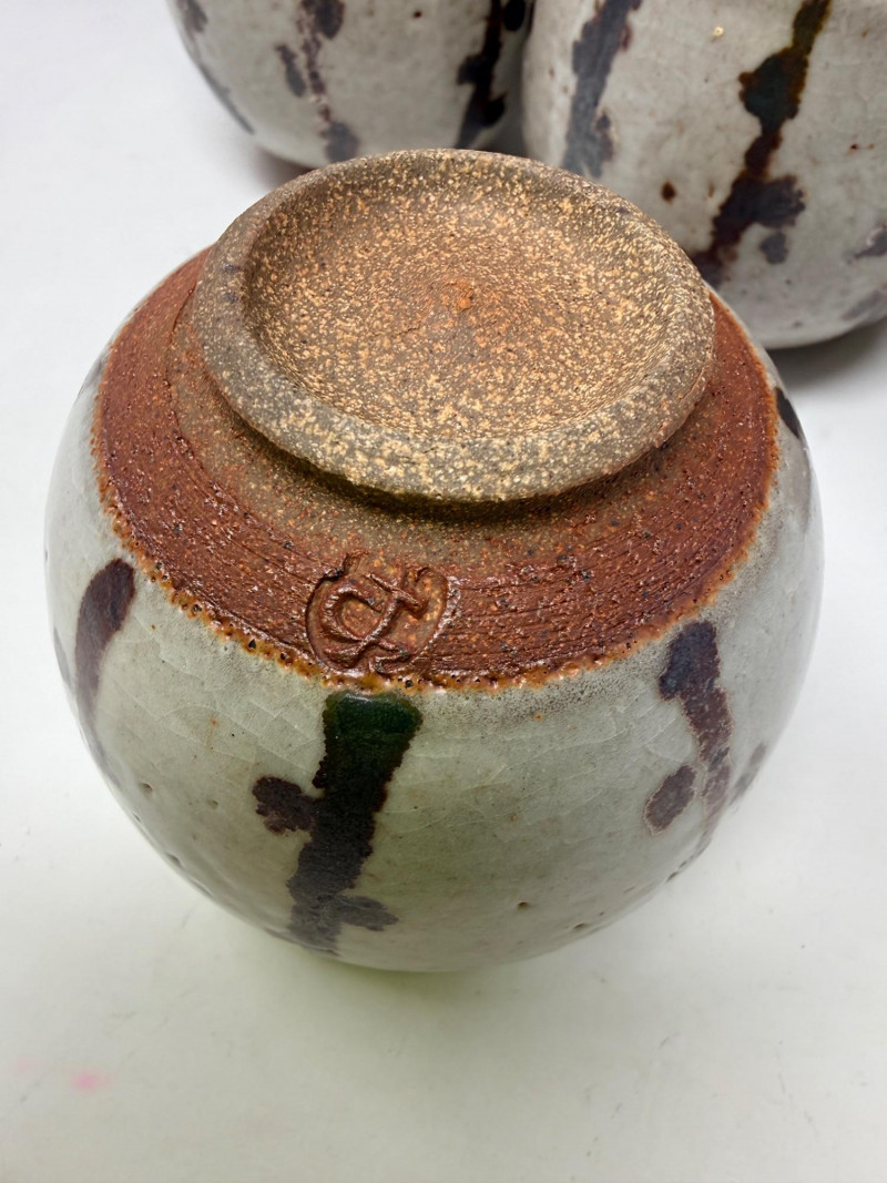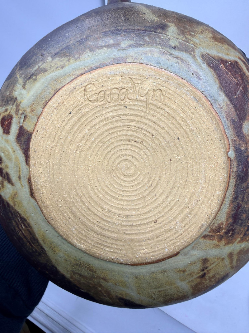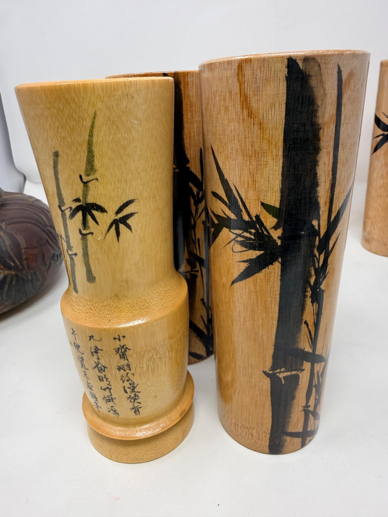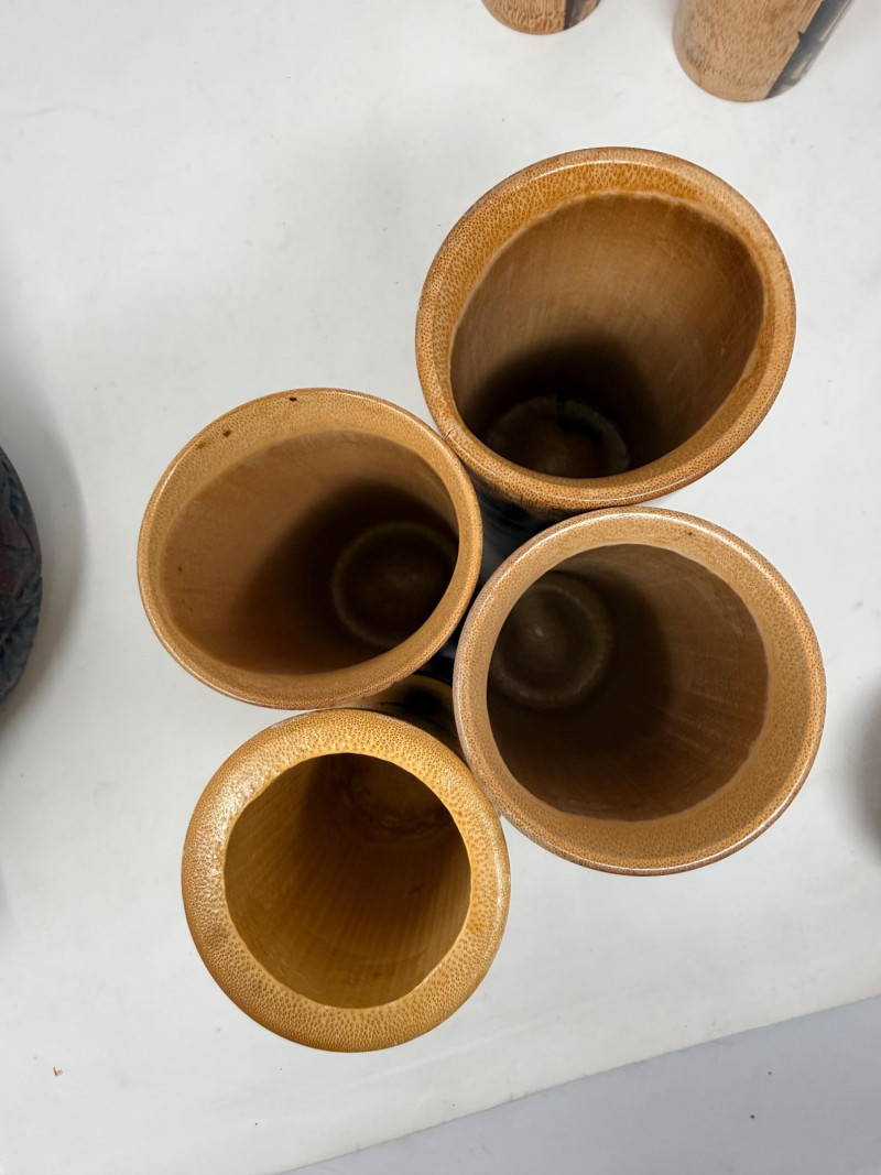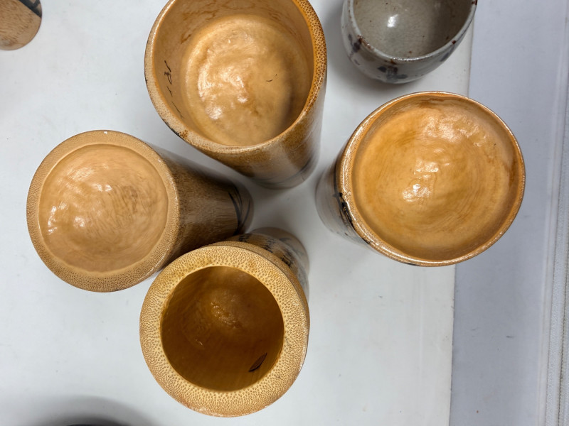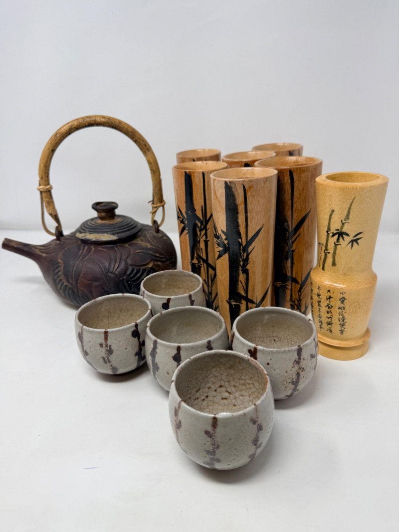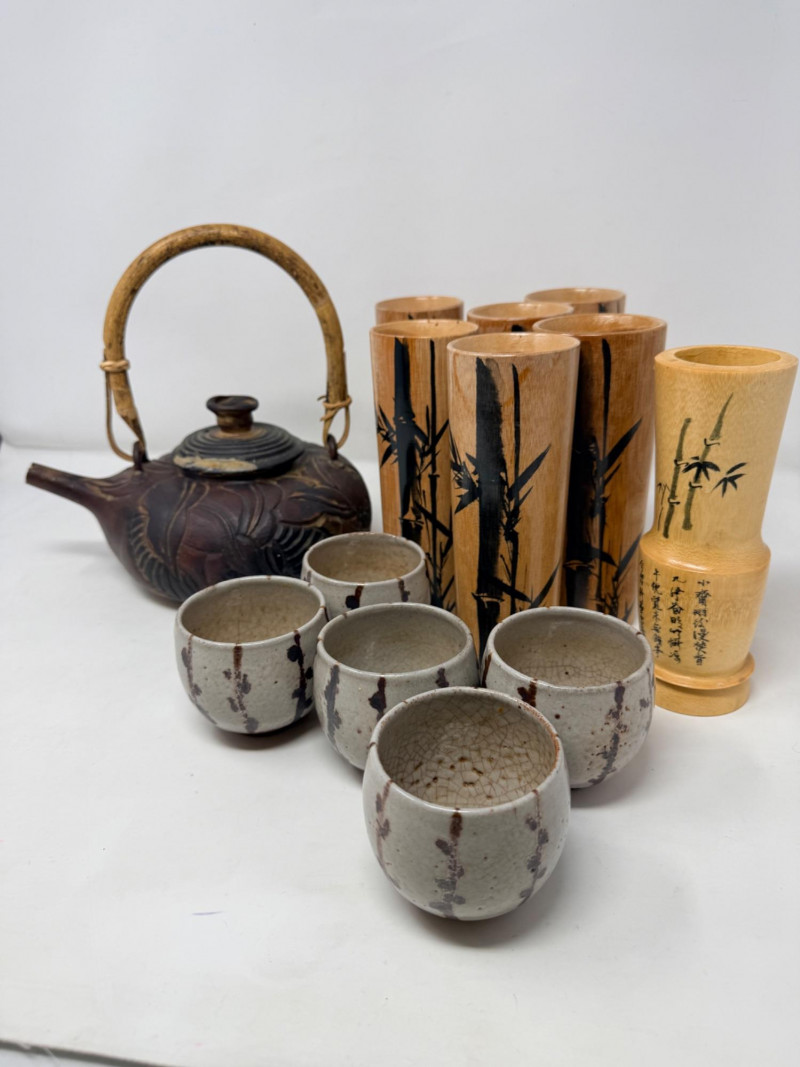 Hand Crafted Pottery Teapot & Cups - Bamboo Drinkware Handcrafted teapot by Artist Carolyn Kieckhaefer 7”x5.5” tall. (5) 3”x2.5” ceramic gray with brown design cups (7) 7” Bamboo cups
