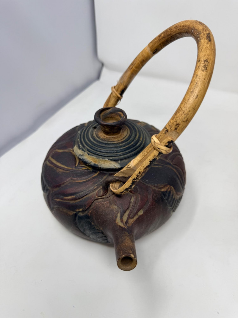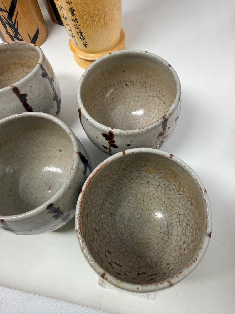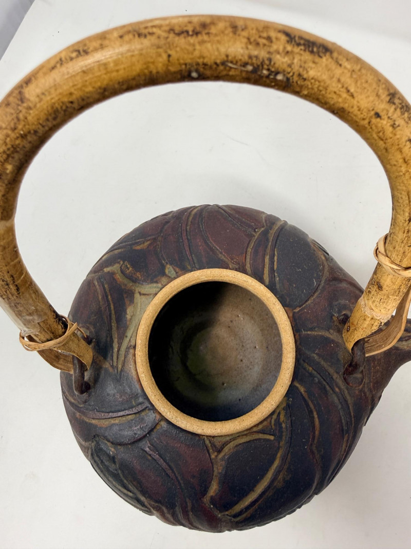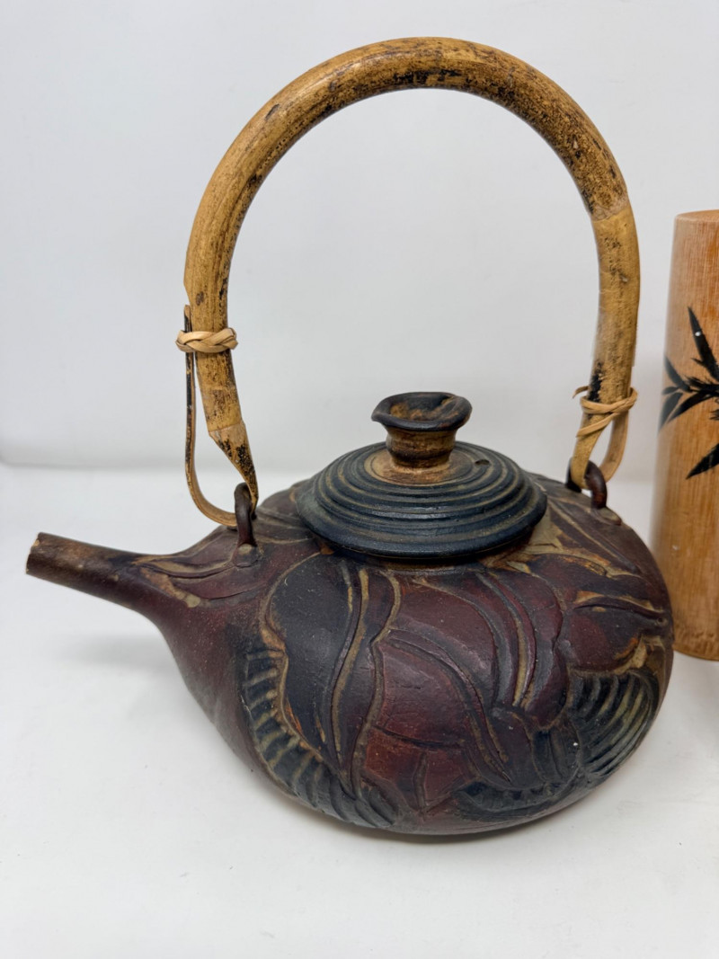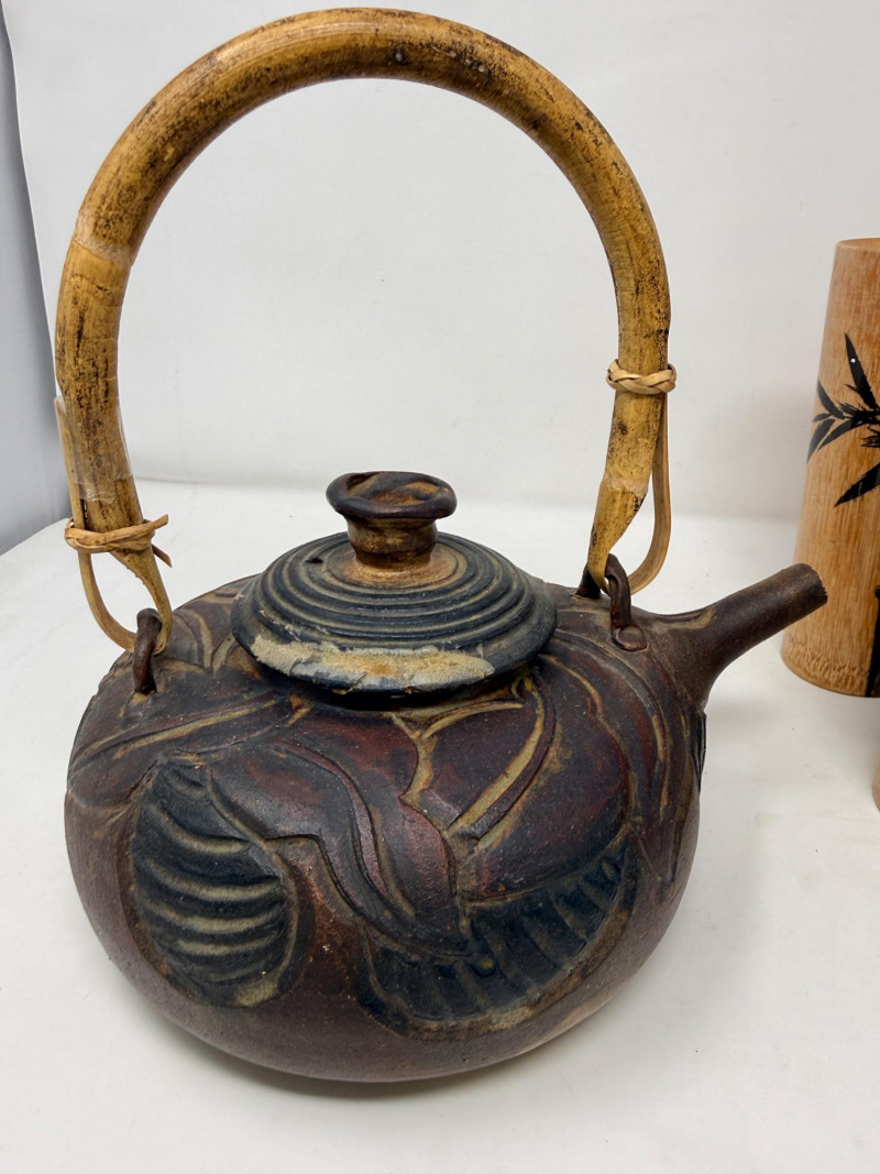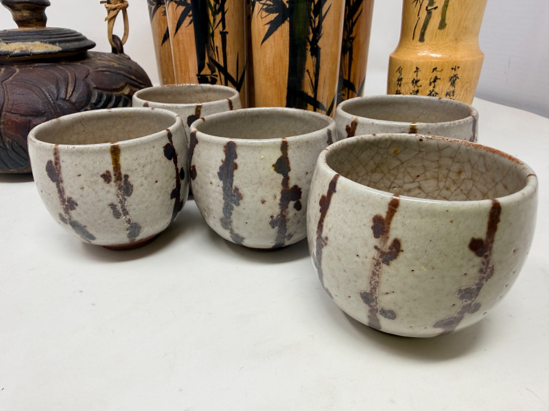 Lot # 251 - Hand Crafted Pottery Teapot & Cups - Bamboo Drinkware