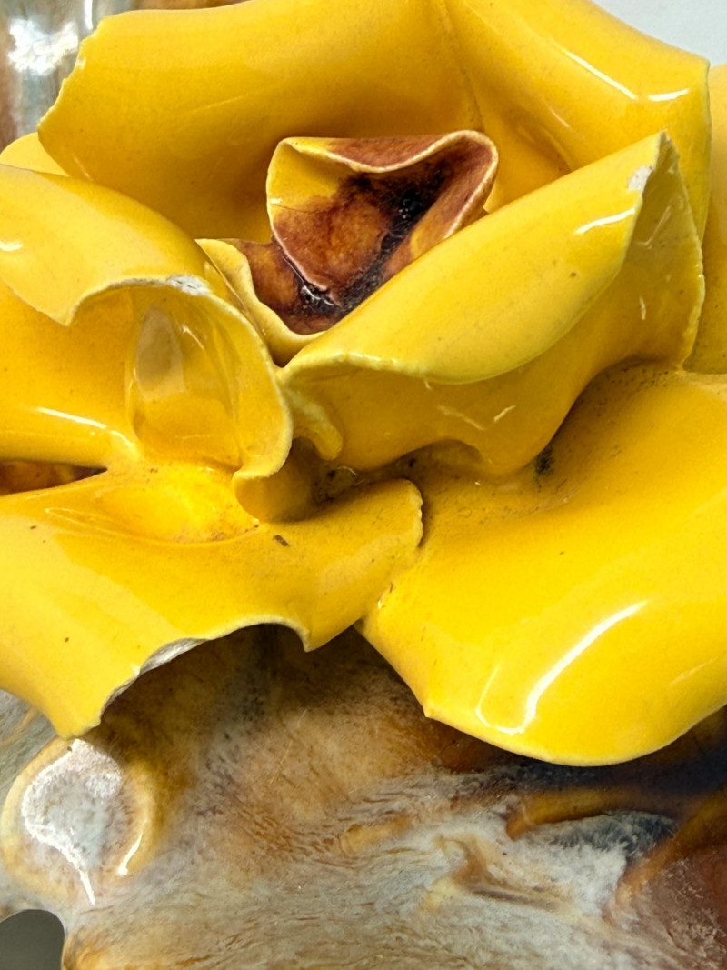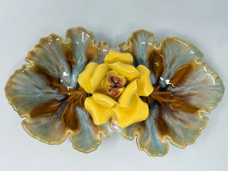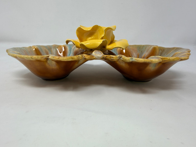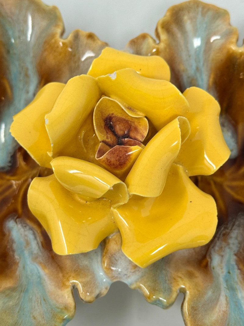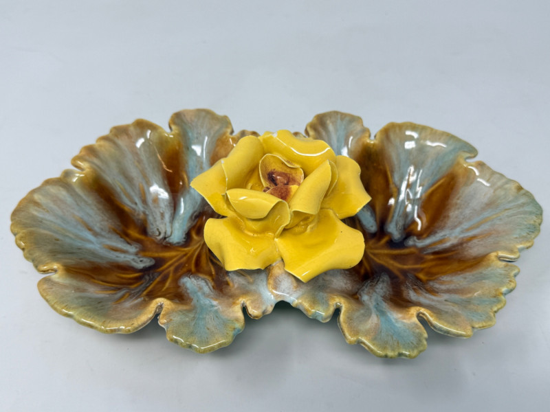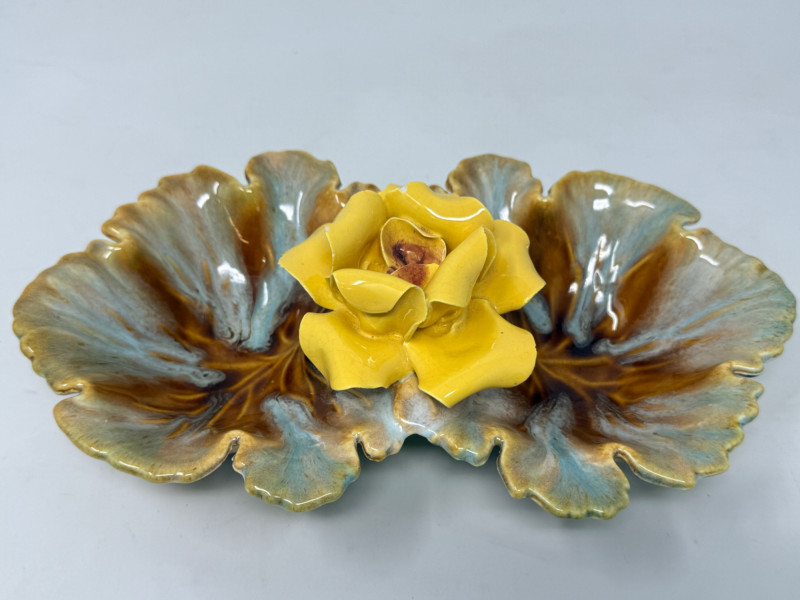Mojalica Rose Mid Century American Art Pottery American majolica 2-lobed leaf dish featuring a 3D yellow porcelain rose in the center and a blue and brown drip glaze. A candy dish or a decorative serving piece. Mid-Century Modern American art pottery. 9.5”x5.5” Small chips on edge of rose petals. See pics Marked USA on the bottom