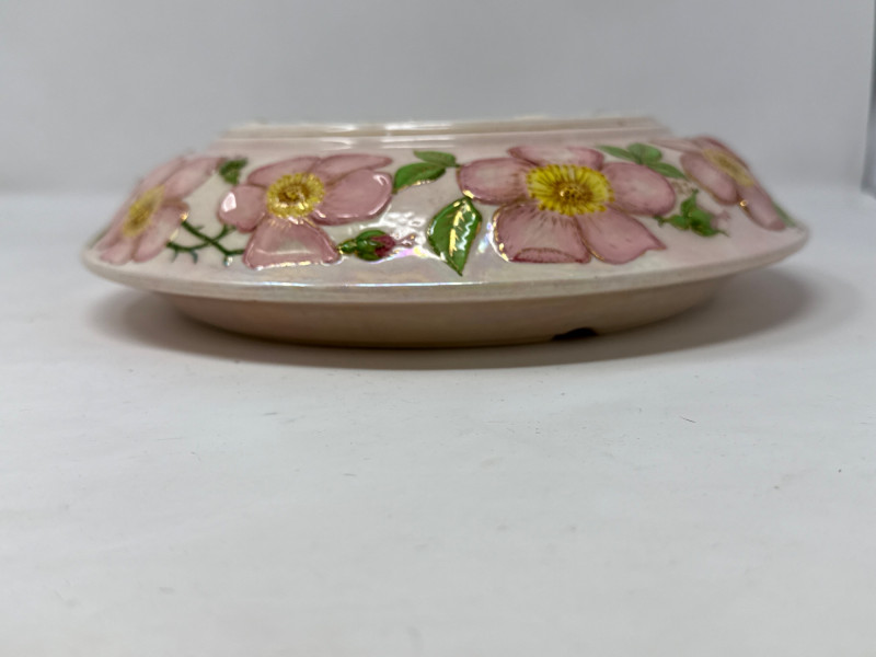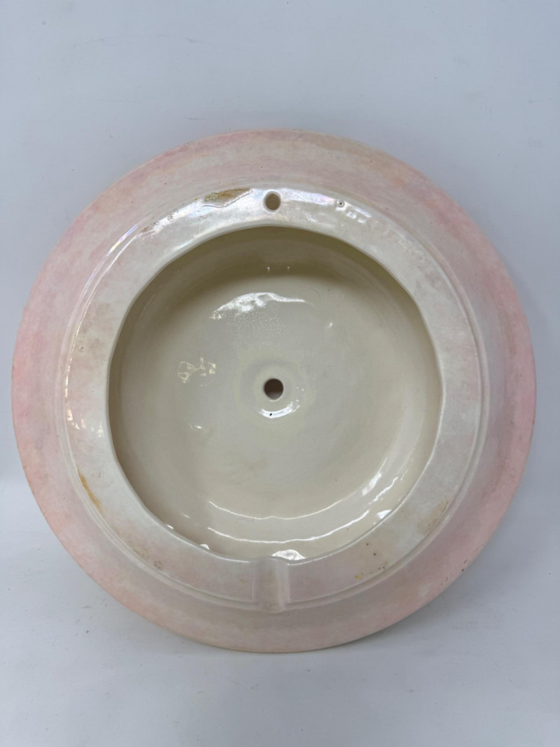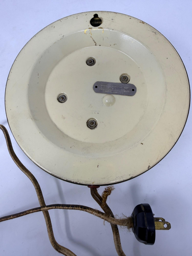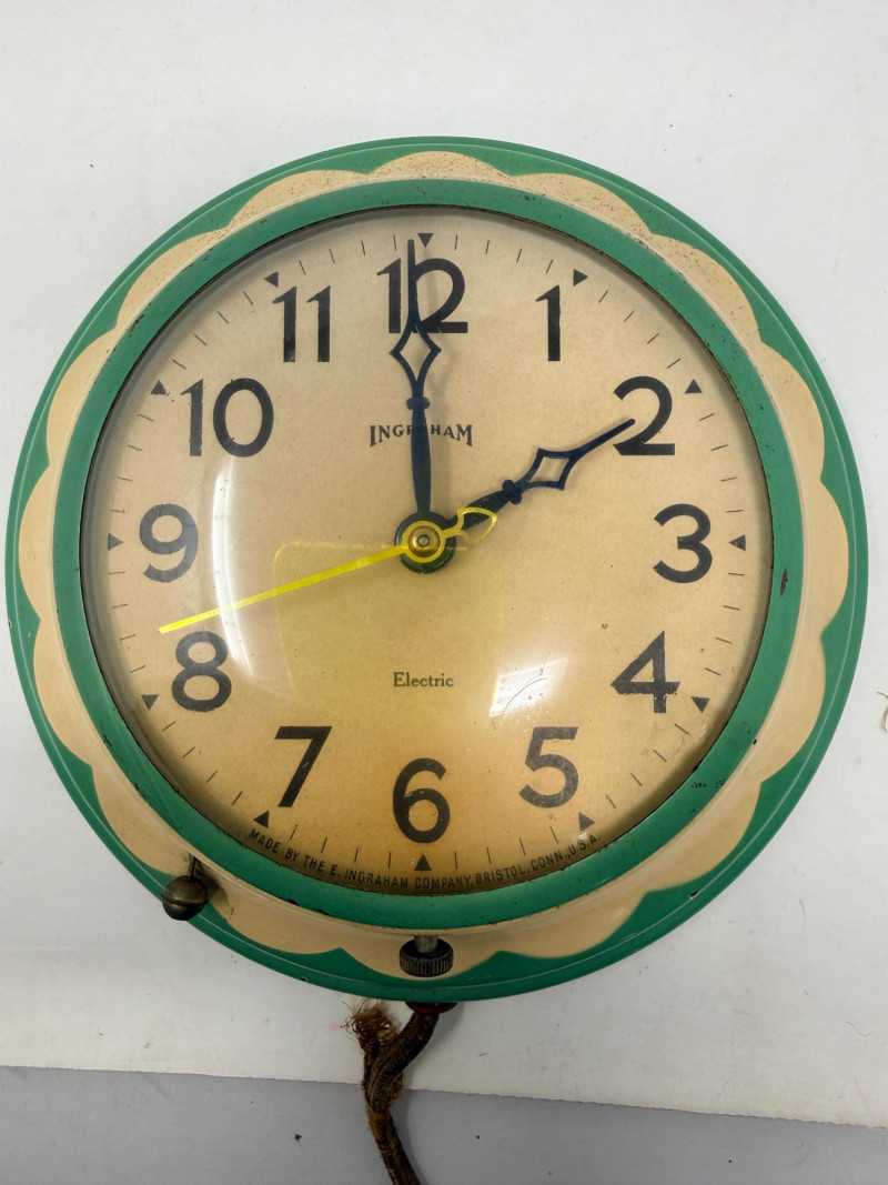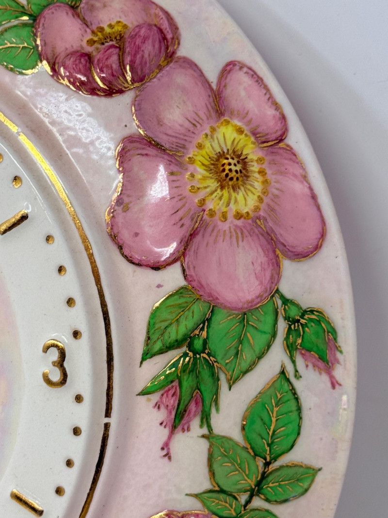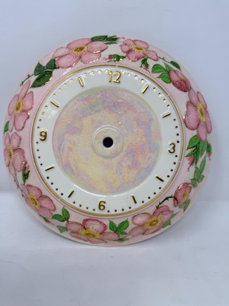 Working! Vintage Ingraham electric wall clock features a distinctive green scalloped or "bottle cap" edge and was manufactured by the E. Ingraham Company in Bristol, Connecticut. The E. Ingraham Company was a leading American clockmaker based in Bristol, Connecticut. They began producing electric clocks around 1930, which became a significant part of their line after World War II. This clock has a metal case and was built to be "self-starting" synchronous motors that plug directly into a wall outlet. Cord has some fraying to the outer cover. Tested and it works! Handpainted pink iridescent ceramic wall clock body, ready to finish. just add a battery and hands kit (not included). 10” diameter. Ingraham Wall Clock & Floral Ceramic Clock Body