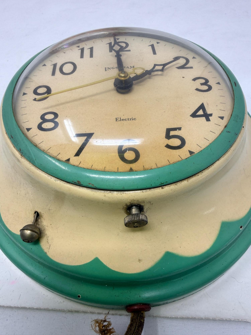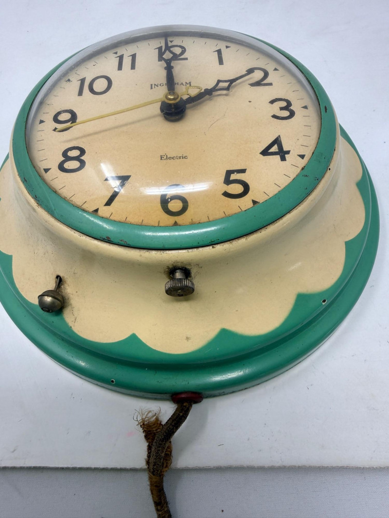This specific style is often referred to by collectors as a "Daisy"or "Bottle Cap" clock. The scalloped green frame and cream-colored face were popular for kitchen decor during the mid-20th century, particularly from the 1930s to the 1950s.