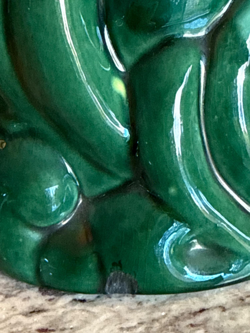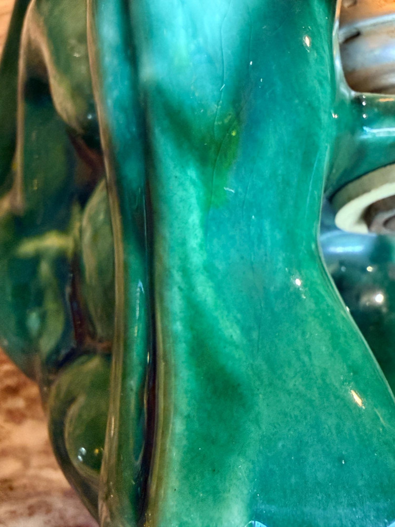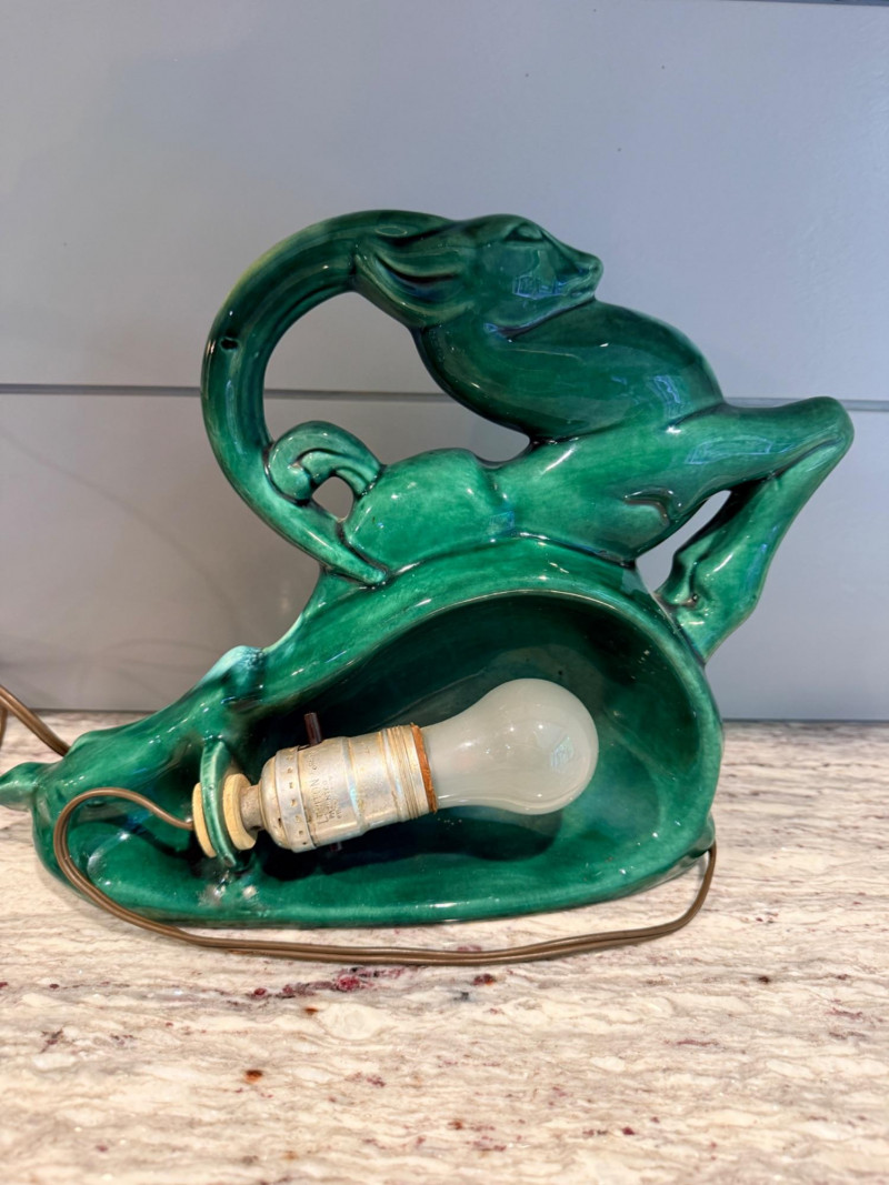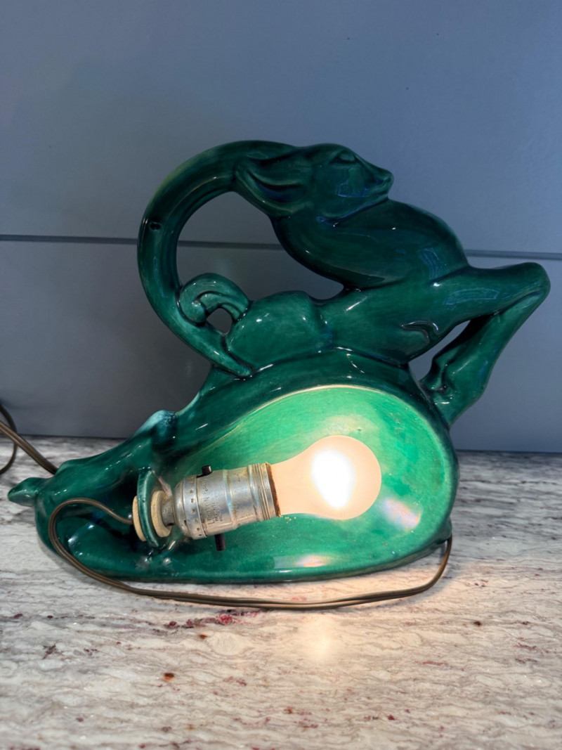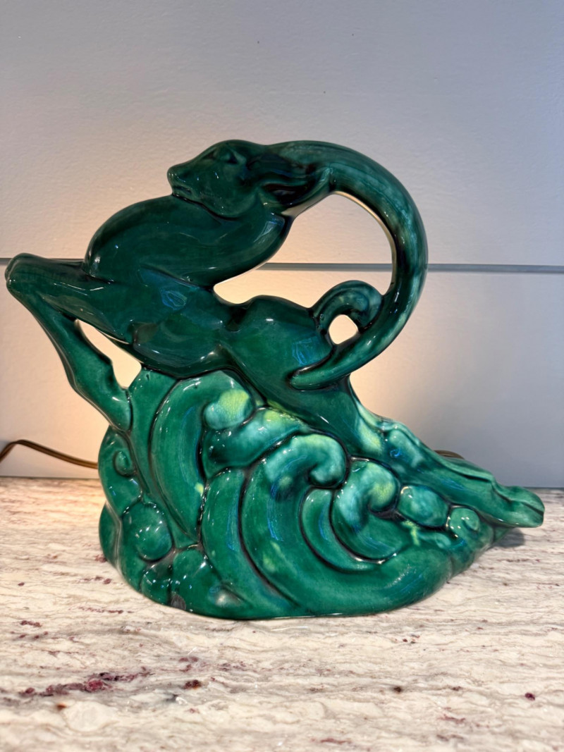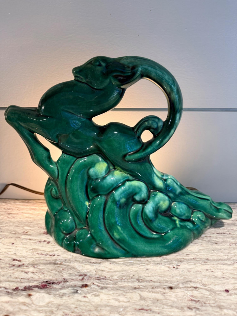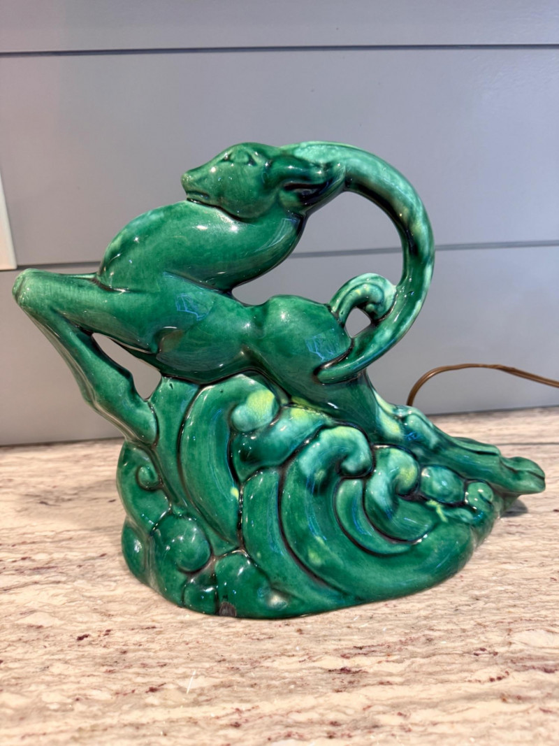 Features a green-glazed ceramic gazelle or antelope leaping over stylized waves.