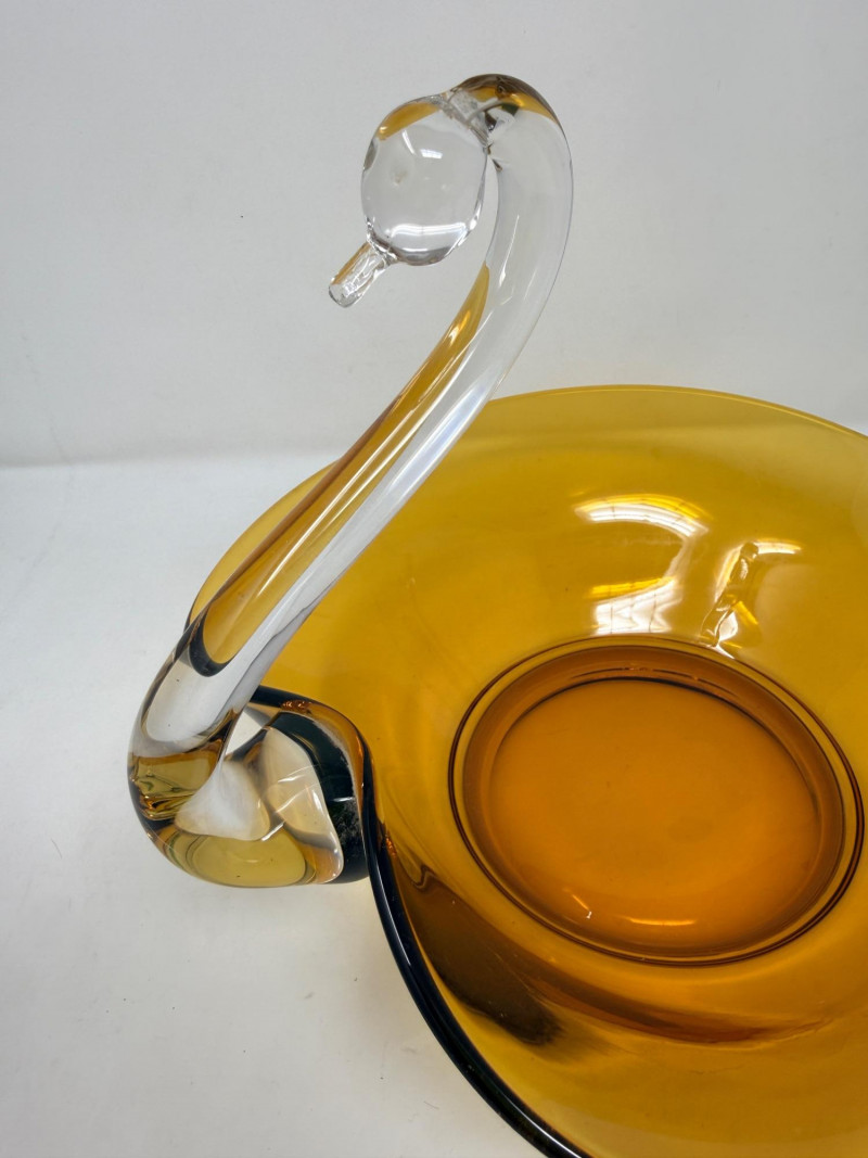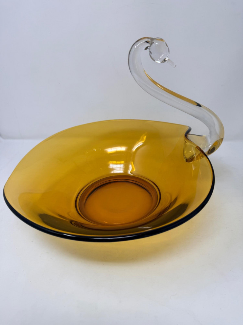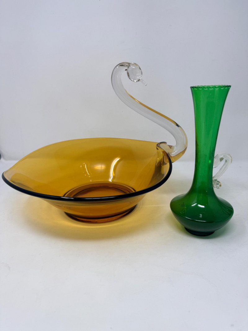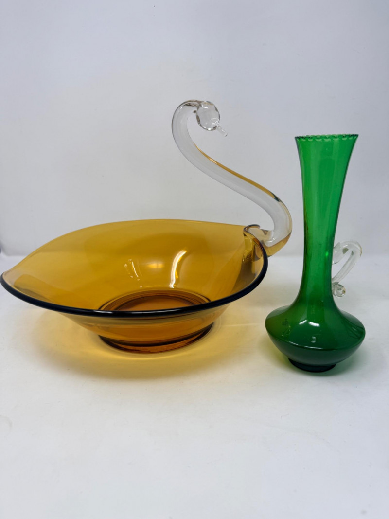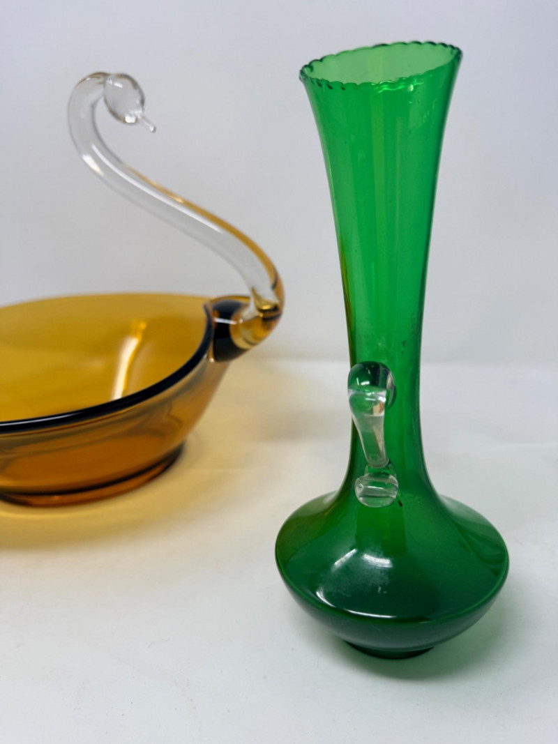 Emerald Green Art Glass Vase & Mid Century Hand Blown Glass Swan Bowl Mid-century modern glass art, particularly from Duncan Miller featured stylized animal forms and vibrant colors. This piece was popular decorative items and functional serveware during the 1950s and 1960s.