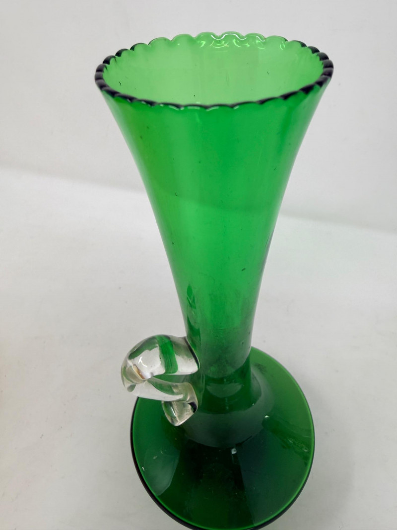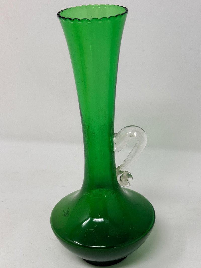Vintage emerald green art glass bud vase, often featuring a ruffled edge, a fluted funnel neck, and a small applied clear glass handle. 3.5”x8”