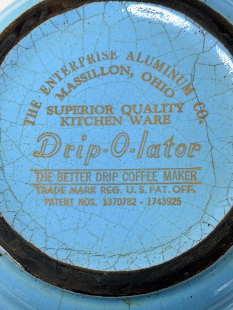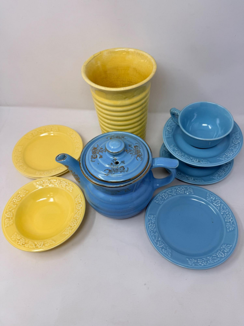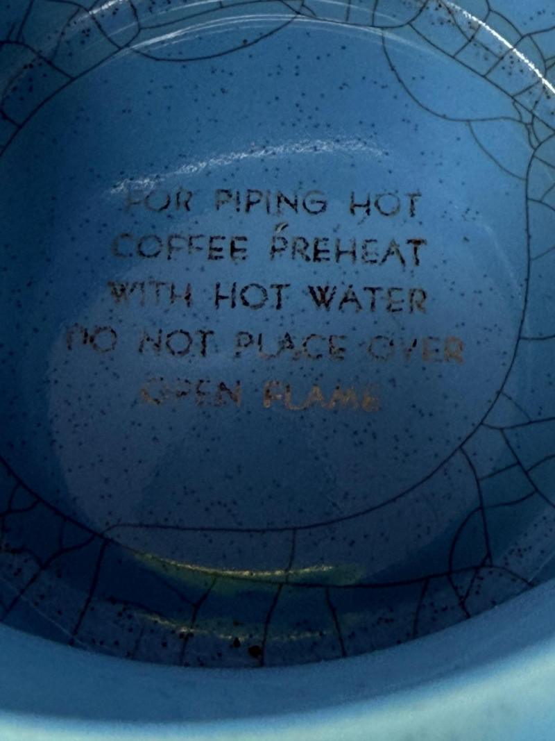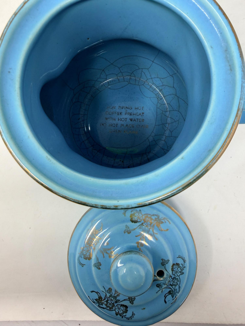 Del Coronado Pottery Collection & Drip-o-later Coffee Maker Blue Drip-o-later coffee maker with gold design. 8.5”x6” 2 blue saucers and cups with one small bowl Yellow beehive vase with a crack at the rim and heavy crazing. 5”x8.5”