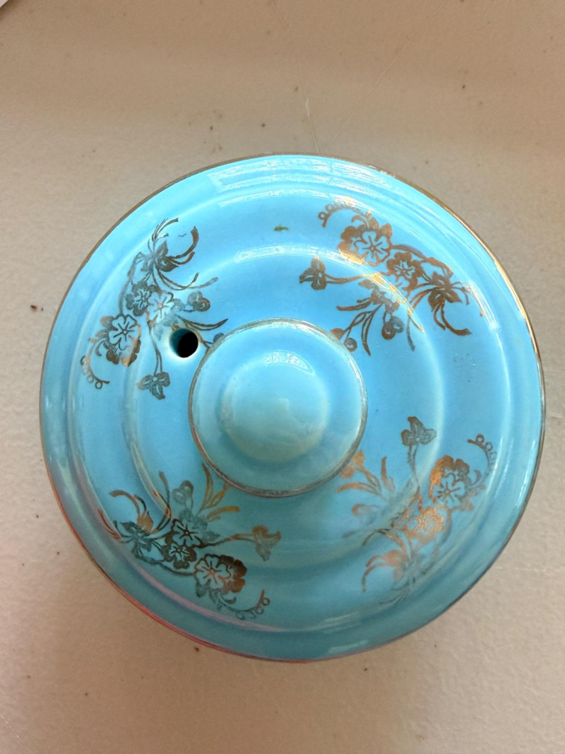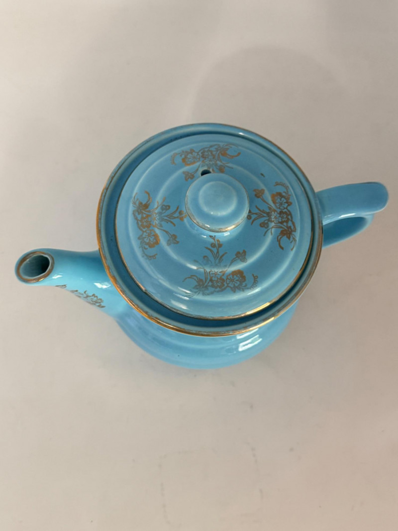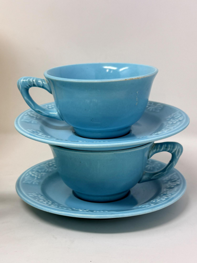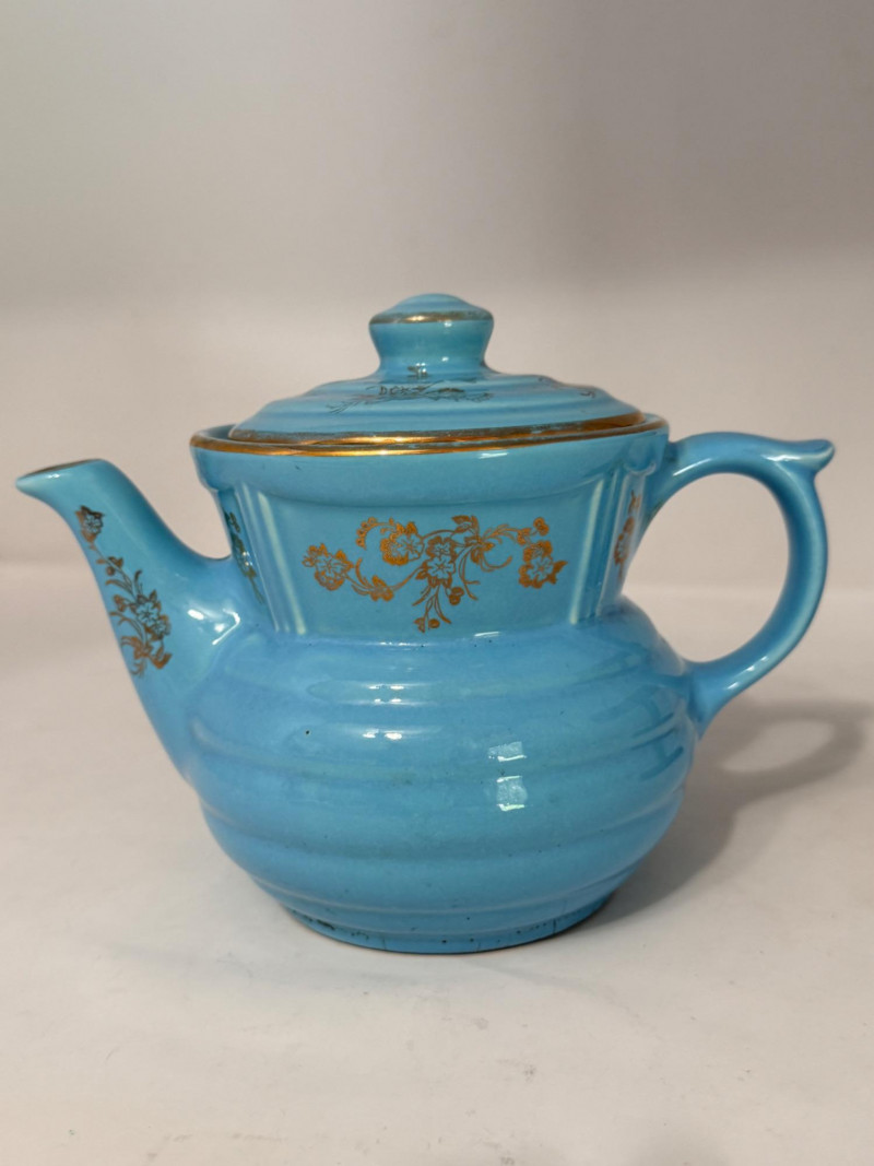 Del Coronado Pottery Collection & Drip-o-later Coffee Maker Blue Drip-o-later coffee maker with gold design. 8.5”x6” 2 blue saucers and cups with one small bowl Yellow beehive vase with a crack at the rim and heavy crazing. 5”x8.5”