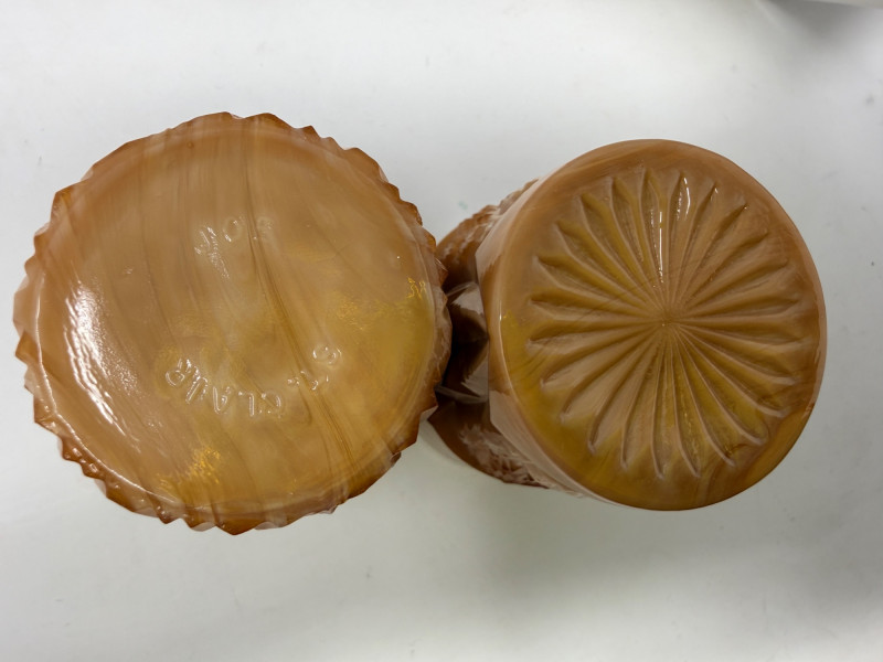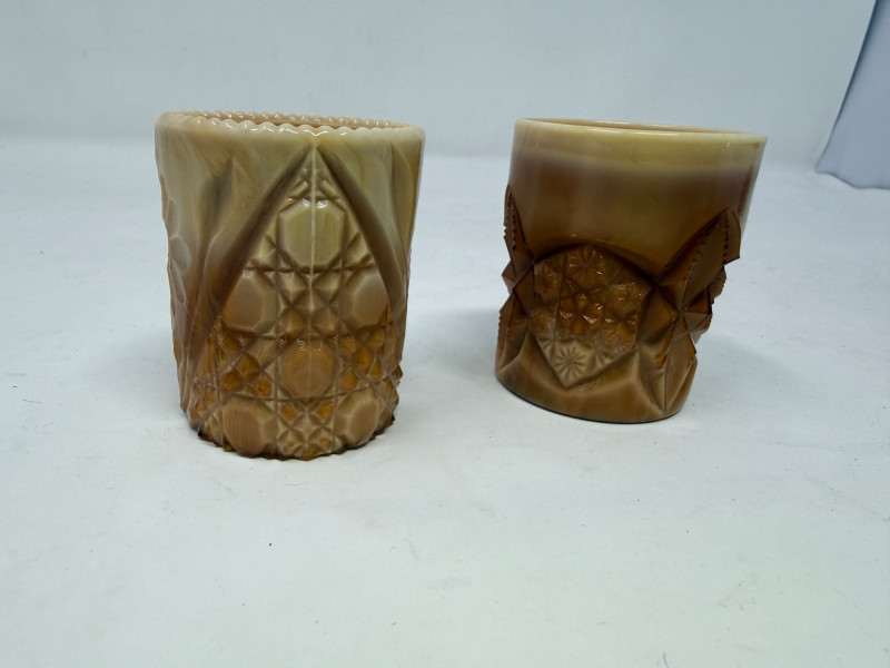 (2) Vintage Joe St. Clair chocolate slag glass toothpick holders. They are manufactured by Joe St. Clair Glass in Indiana. The holders feature a decorative, textured pattern with a mixed brown and caramel slag glass effect