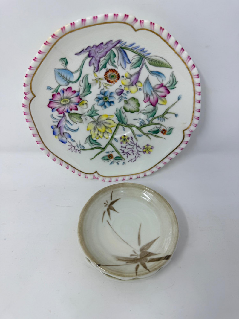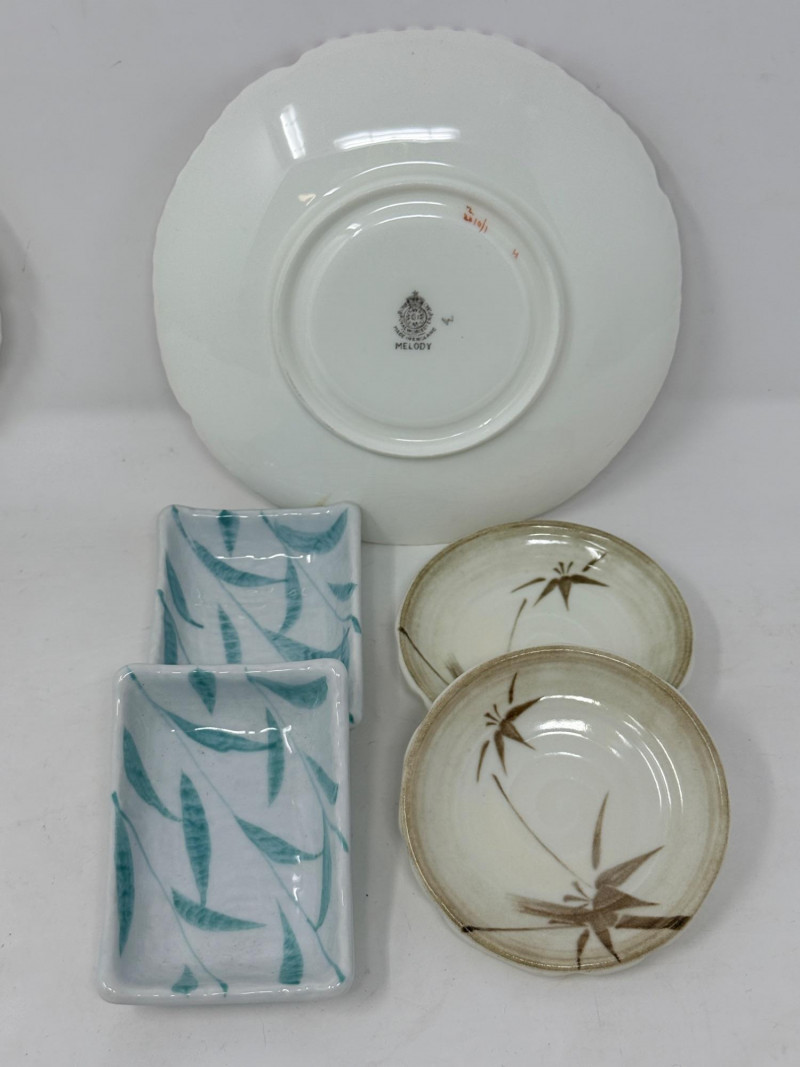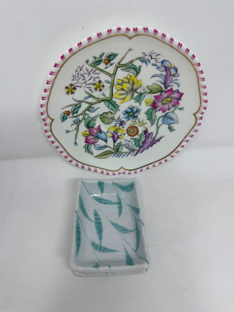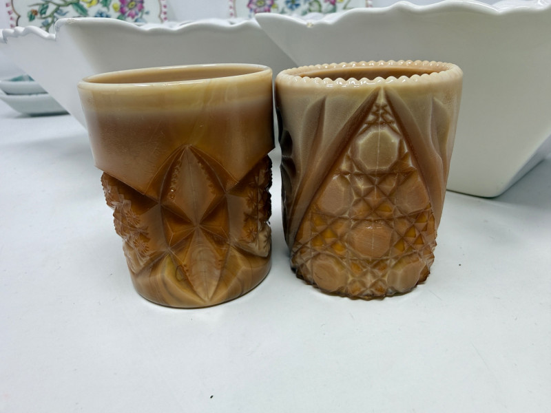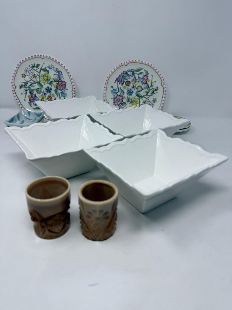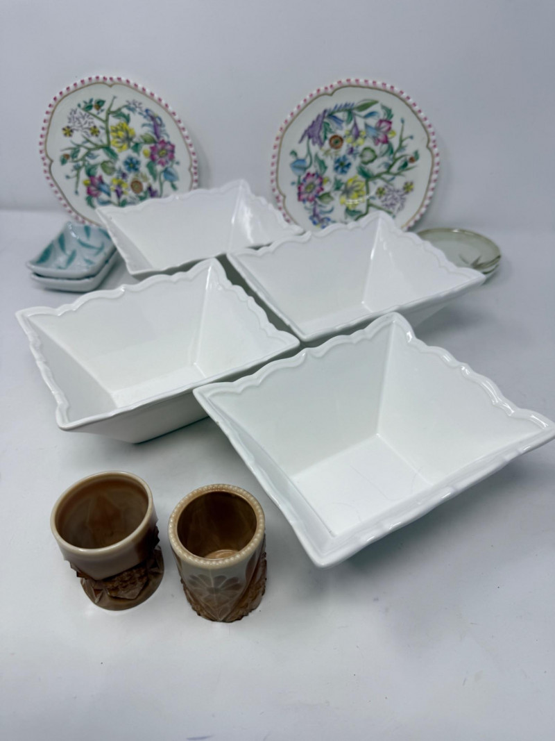 Joe St Clair Chocolate Slag Glass Toothpick Holders & Square Bowls (4) Primagera Portugese Bowls 5.75”x5”x3” (2) English China plates