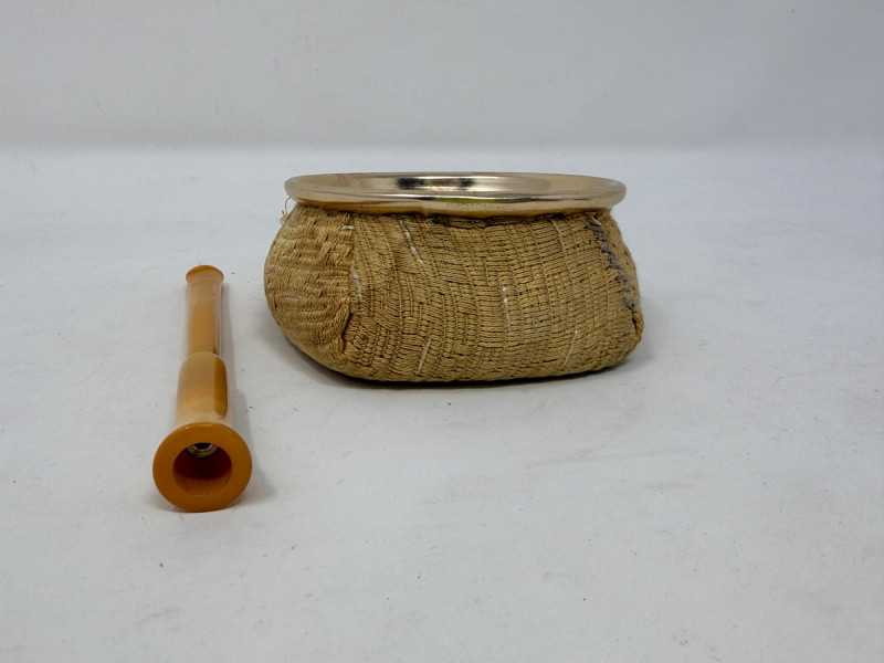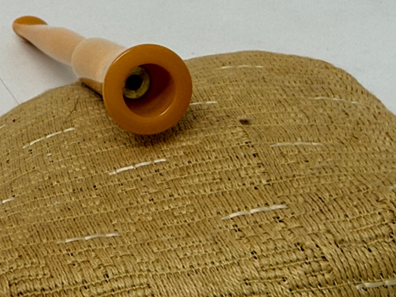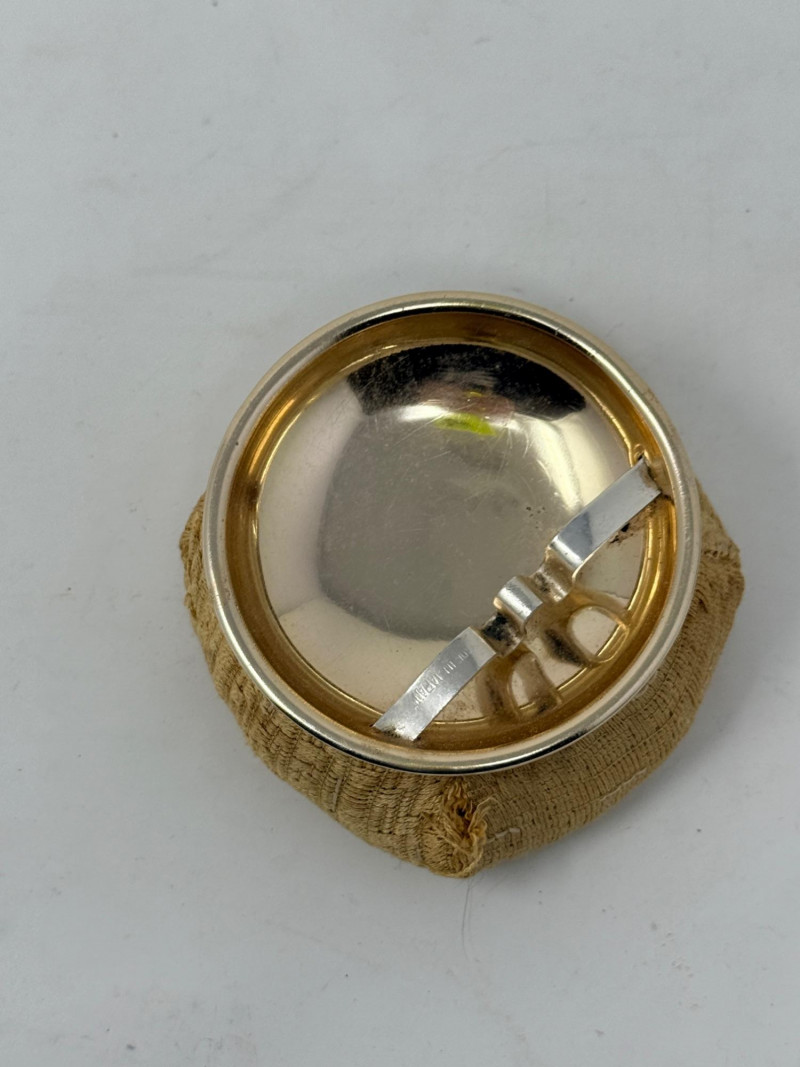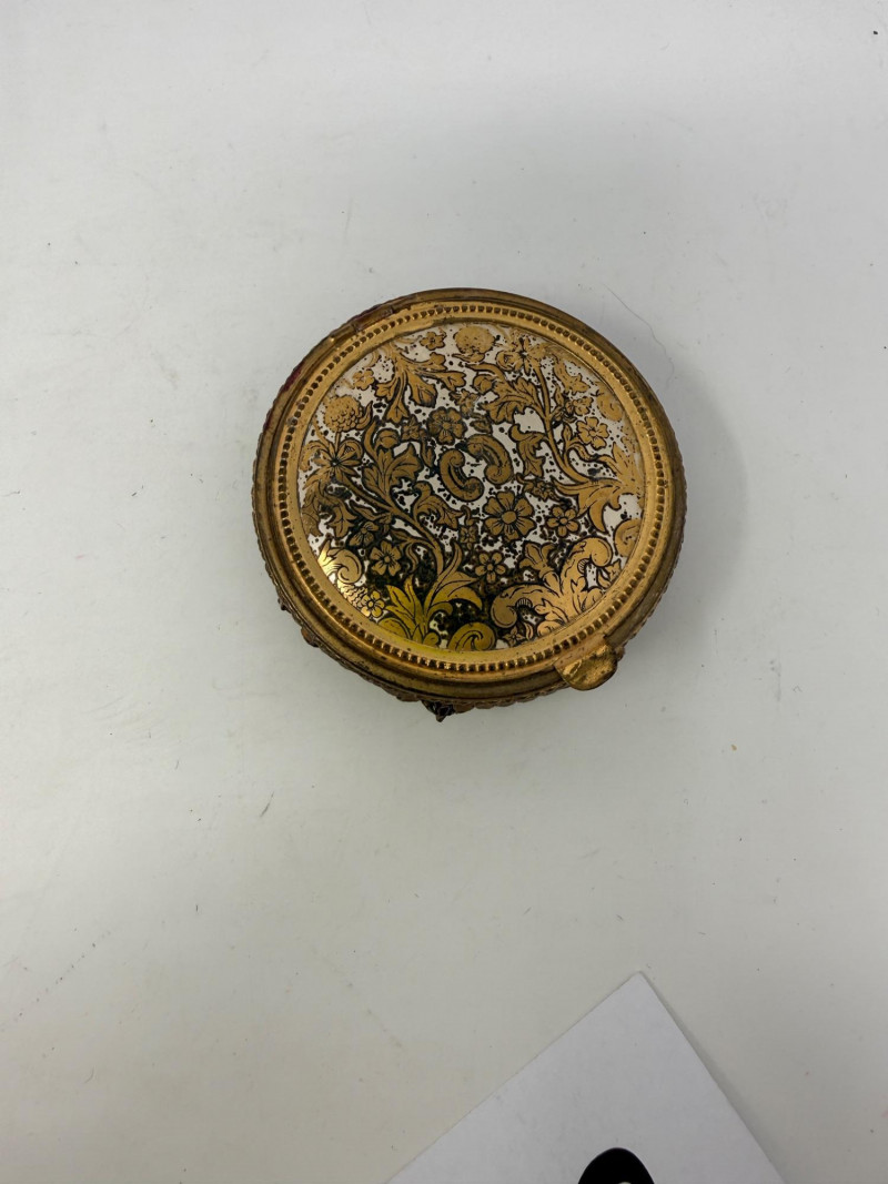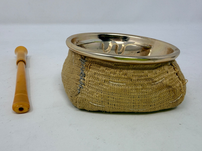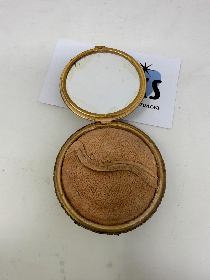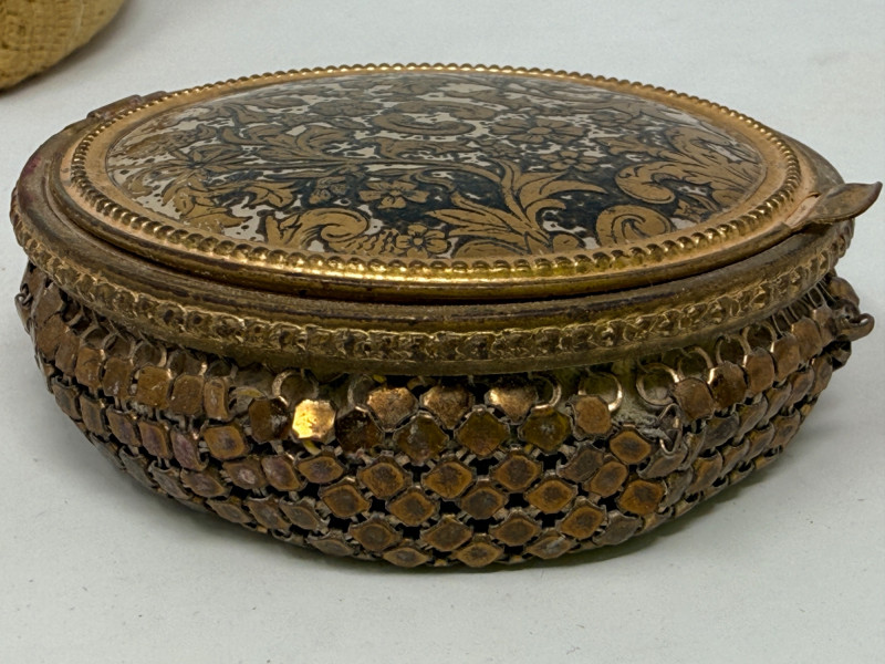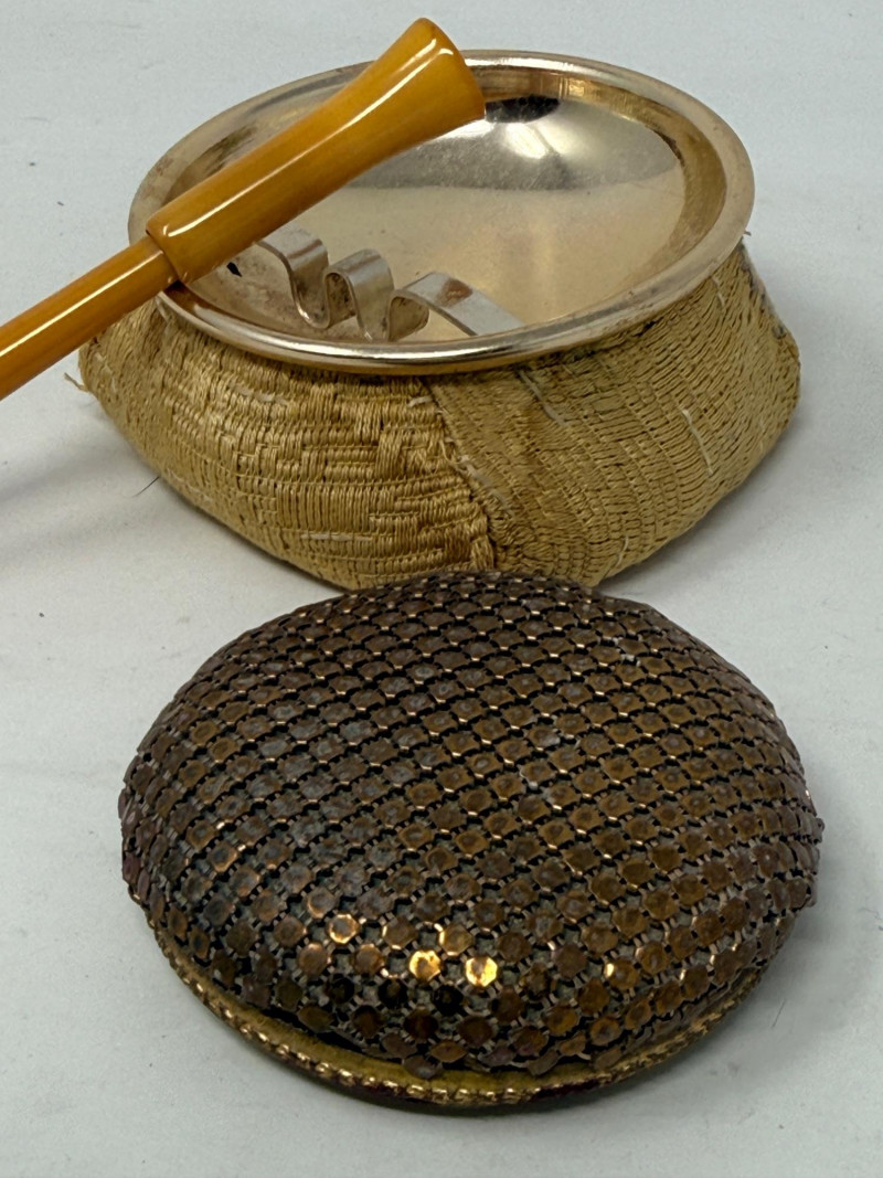 Satin Bean Bag Ashtray - Bakelite Cigarette Holder & Compact 4.5” Bakelite cigarette holder with active plunger. Metal lid powder compact with mirror and bead base in a metal link fabric. Original compact powder inside along with original applicator.