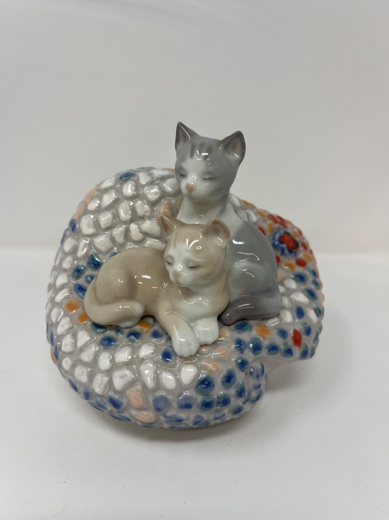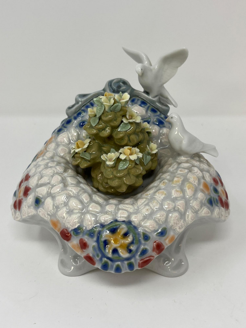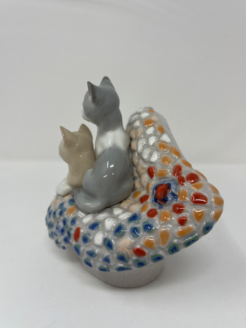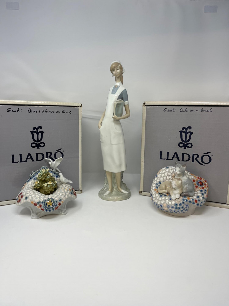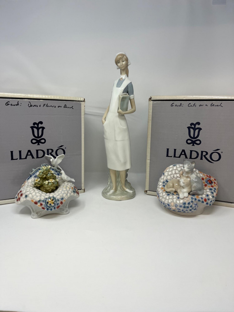 (3) Lladró - Cats on a Bench - Garden in Barcelona - Making Rounds Llardó Cats on a Bench porcelain figurine. # 6664 Two kittens resting on a colorful mosaic bench. Comes in original box. 5”Tx5.5”Wx4”D Lladró Garden in Barcelona porcelain figurine. # 6662 Vibrant, multicolor glazed finish with mosaic-style patterns and delicate porcelain flowers, topped with two white doves. Comes in original box. 5”Tx6”Wx5”D Lladró Nurse Figurine, also known by the title "Making Rounds". # 4603 Glossy porcelain figurine. One of the hands is broken. See pictures for details. 14”Tx3.5”Wx3.75”D