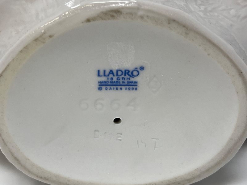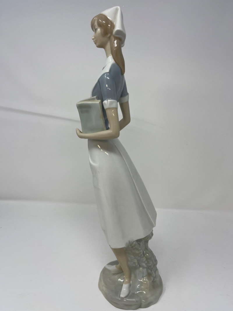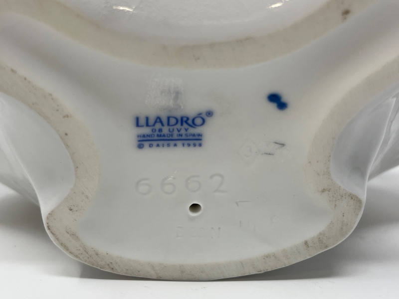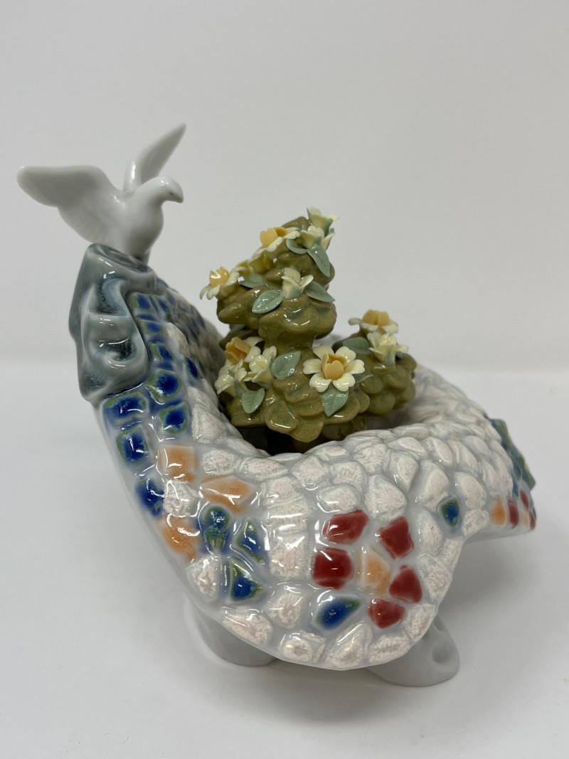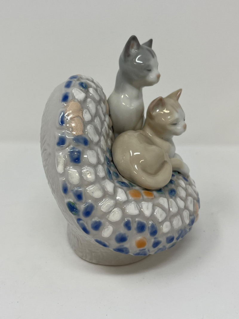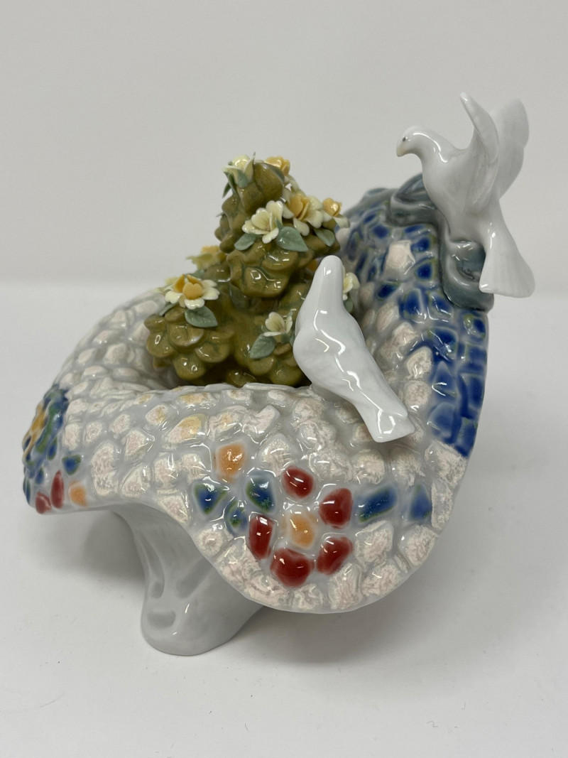 (3) Lladró - Cats on a Bench - Garden in Barcelona - Making Rounds Llardó Cats on a Bench porcelain figurine. # 6664 Two kittens resting on a colorful mosaic bench. Comes in original box. 5”Tx5.5”Wx4”D Lladró Garden in Barcelona porcelain figurine. # 6662 Vibrant, multicolor glazed finish with mosaic-style patterns and delicate porcelain flowers, topped with two white doves. Comes in original box. 5”Tx6”Wx5”D Lladró Nurse Figurine, also known by the title "Making Rounds". # 4603 Glossy porcelain figurine. One of the hands is broken. See pictures for details. 14”Tx3.5”Wx3.75”D
