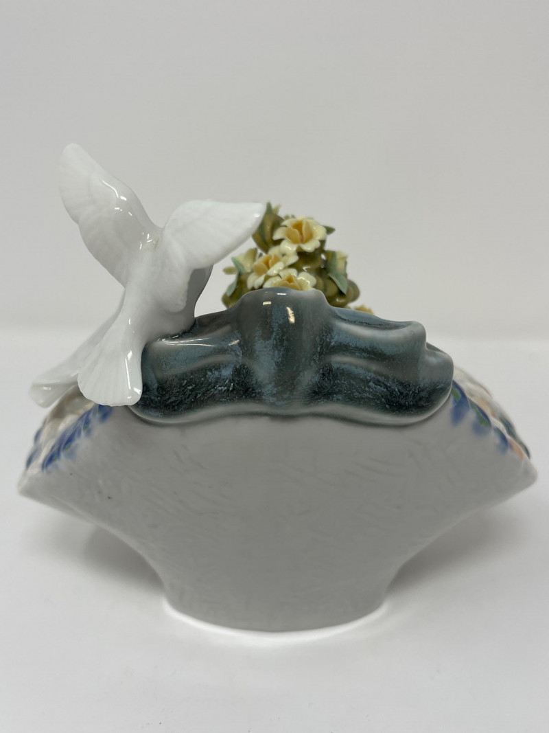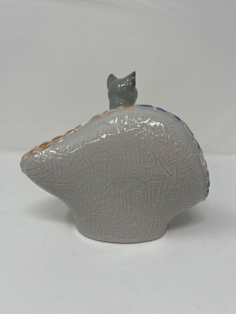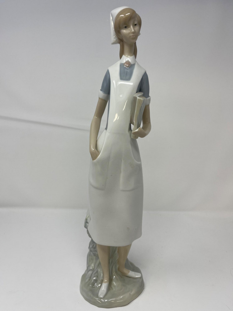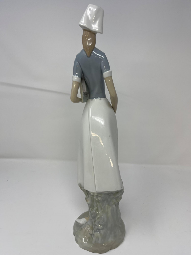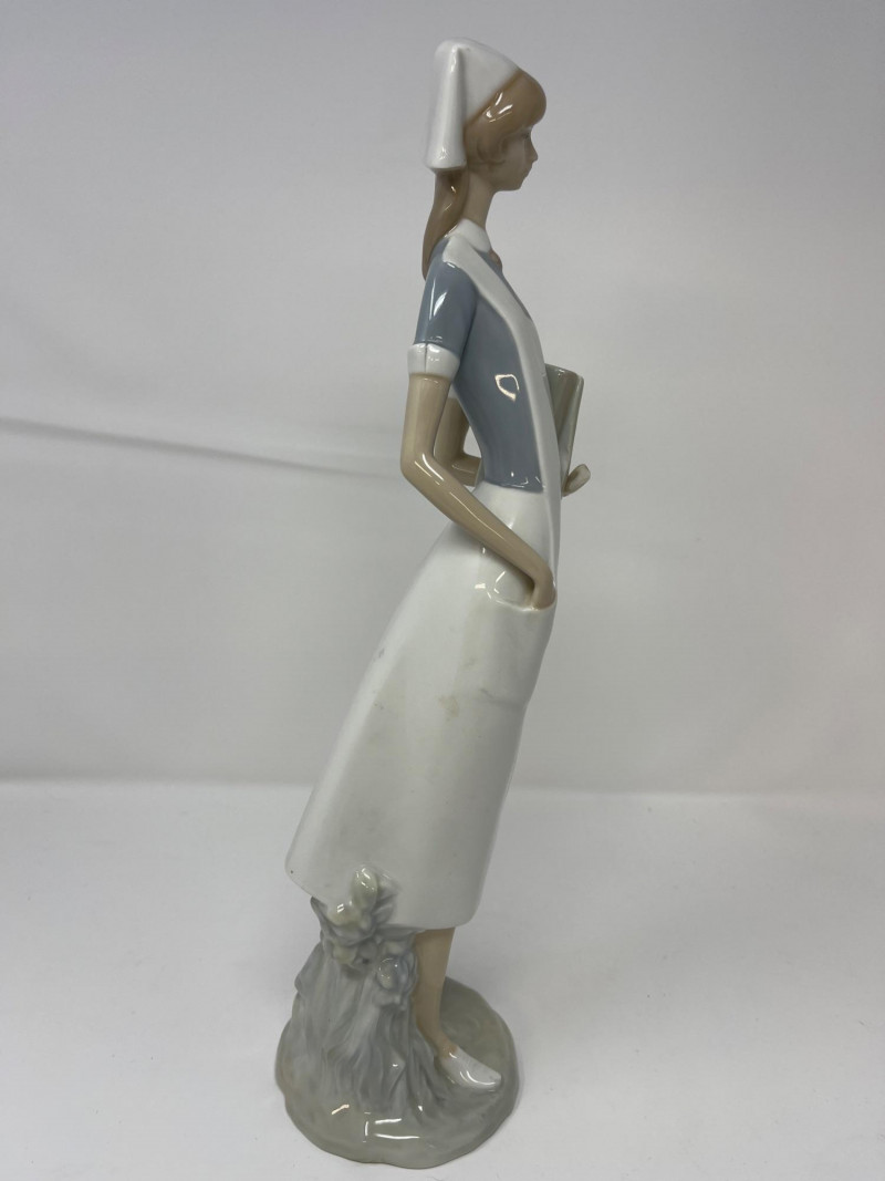 (3) Lladró - Cats on a Bench - Garden in Barcelona - Making Rounds Llardó Cats on a Bench porcelain figurine. # 6664 Two kittens resting on a colorful mosaic bench. Comes in original box. 5”Tx5.5”Wx4”D Lladró Garden in Barcelona porcelain figurine. # 6662 Vibrant, multicolor glazed finish with mosaic-style patterns and delicate porcelain flowers, topped with two white doves. Comes in original box. 5”Tx6”Wx5”D Lladró Nurse Figurine, also known by the title "Making Rounds". # 4603 Glossy porcelain figurine. One of the hands is broken. See pictures for details. 14”Tx3.5”Wx3.75”D