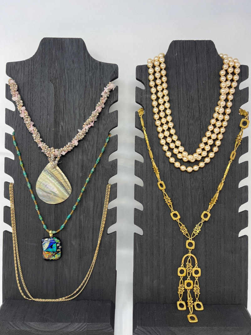 (6) Costume Jewelry Necklaces Seashell and pink bead necklace, multi-strand pearl necklace, and more!