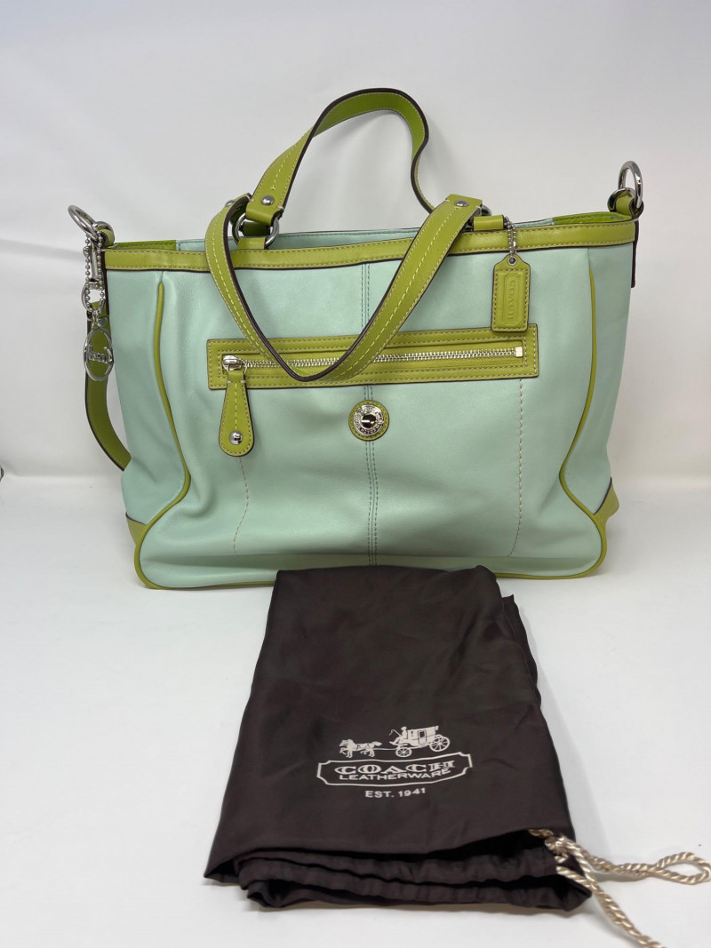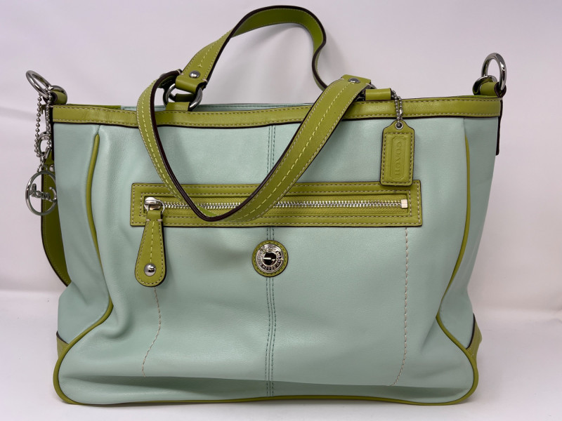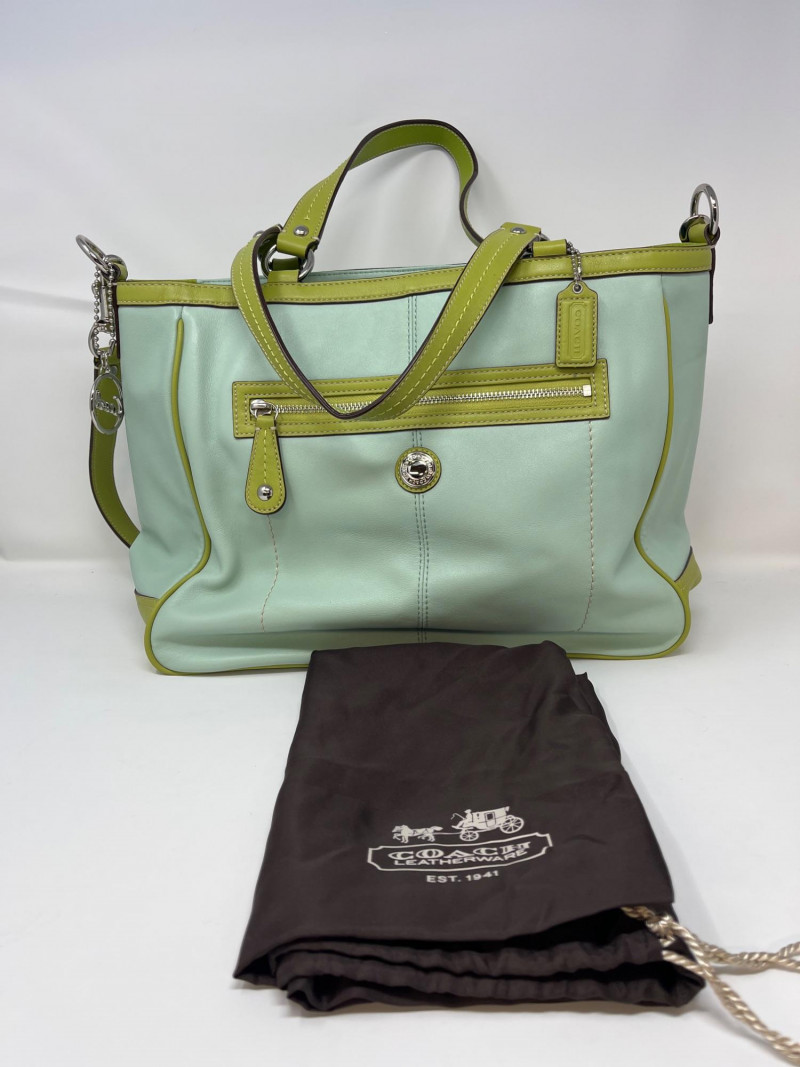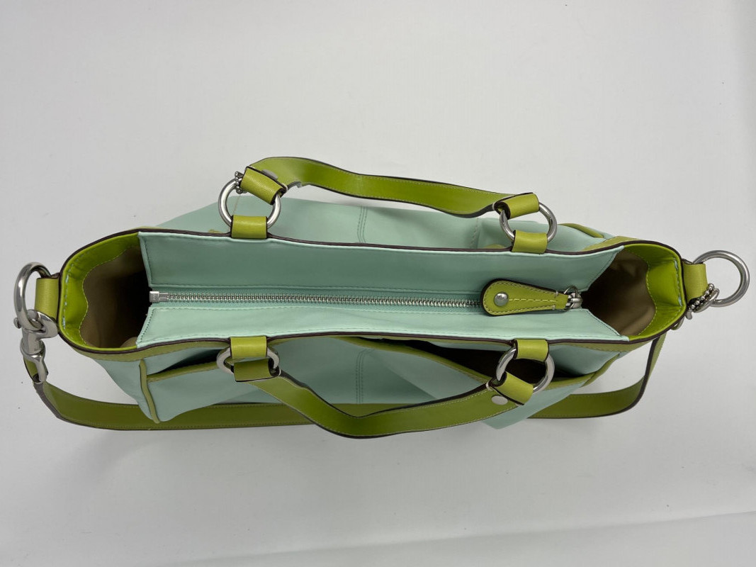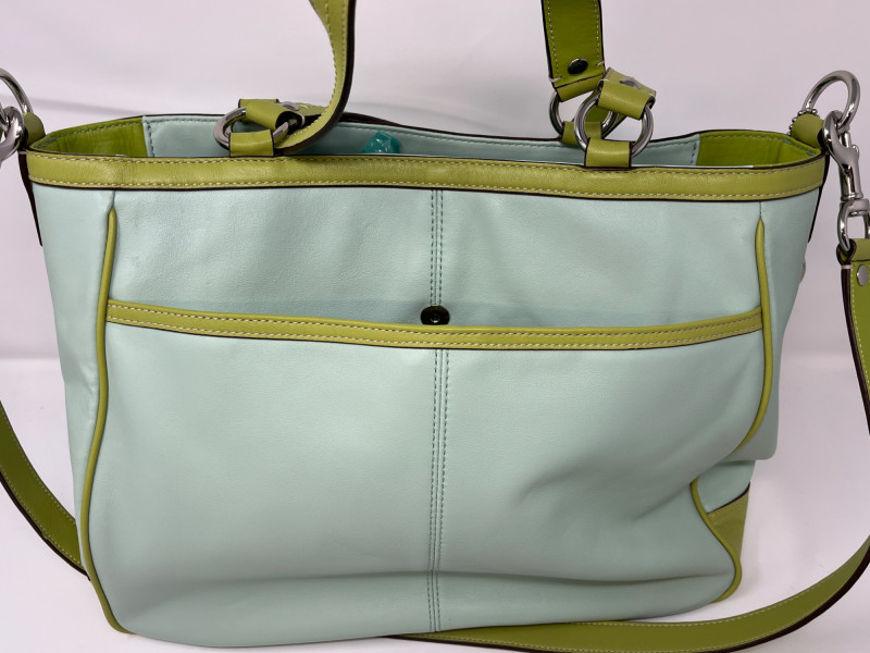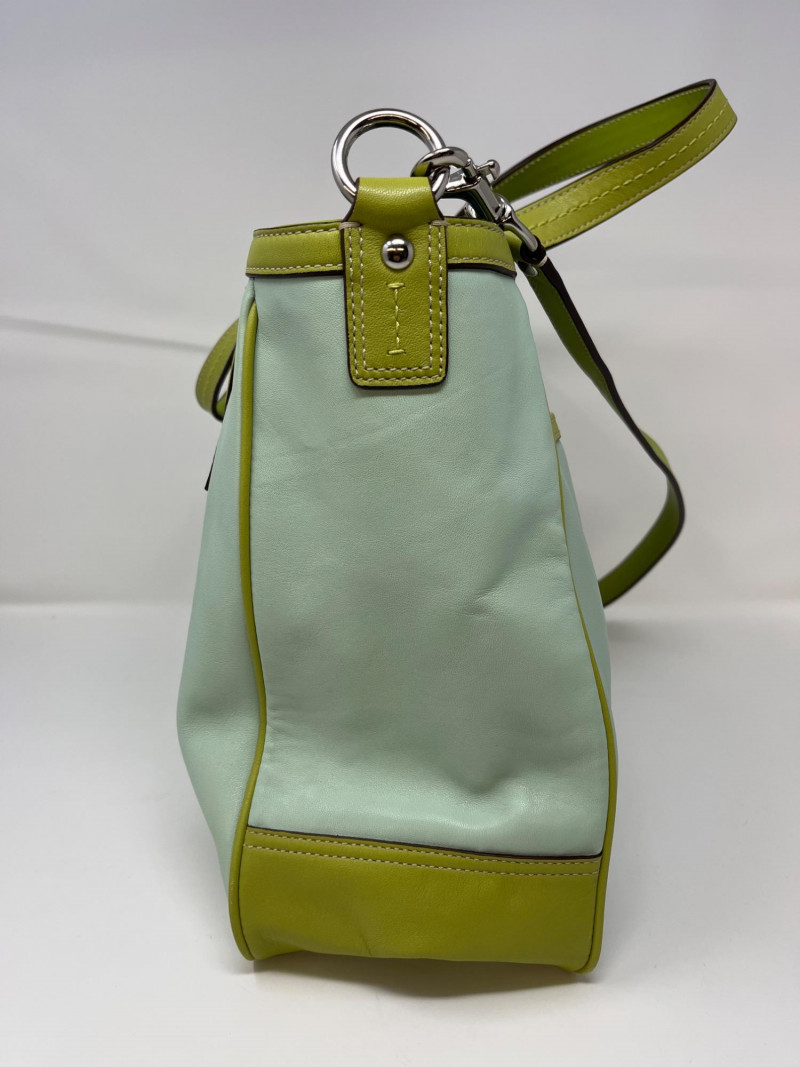 Limited Edition Coach Laura Leather 2-Way Tote New in dust bag. Model # F14887 Sea foam and lime butter soft leather. One zipper pocket and two open pockets inside of bag. Detachable shoulder strap. Nickel Coach medallion. Original dust bag. Original price tag and maintenance card.