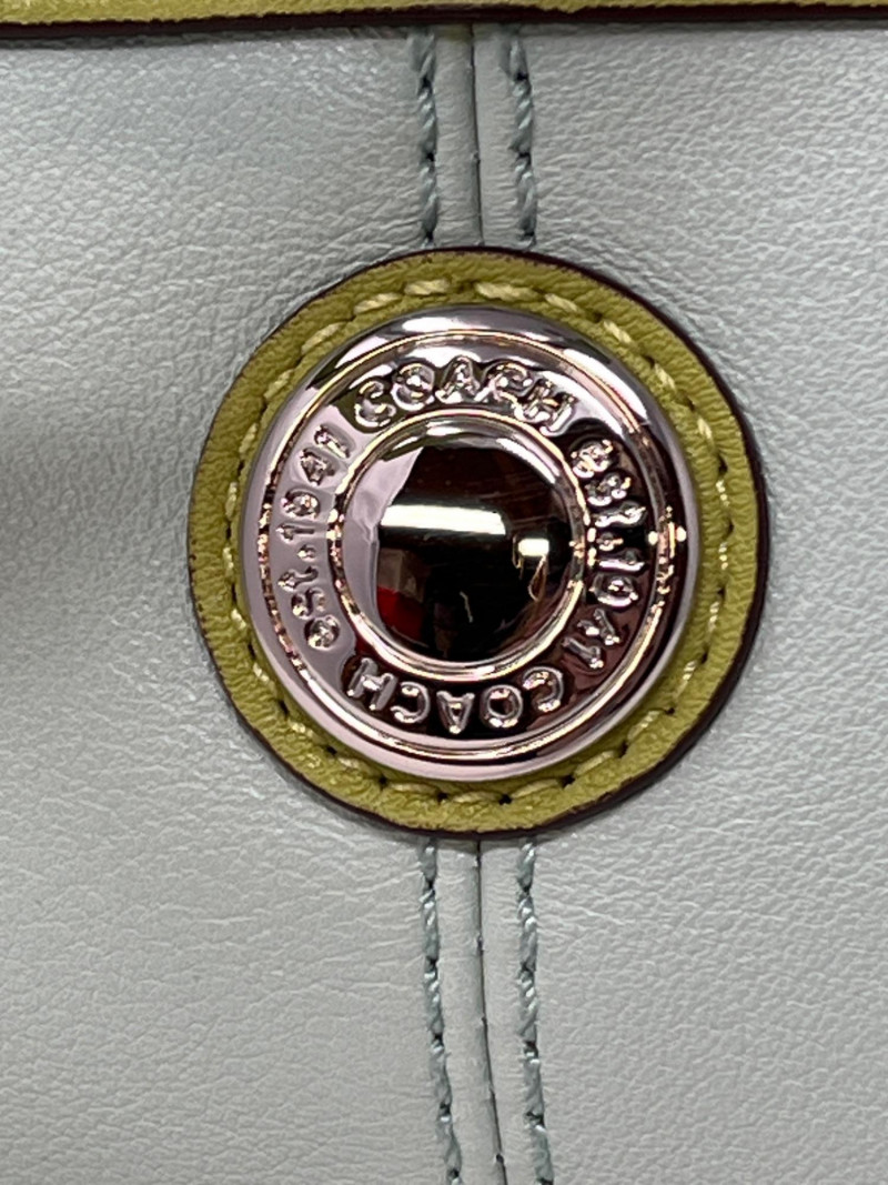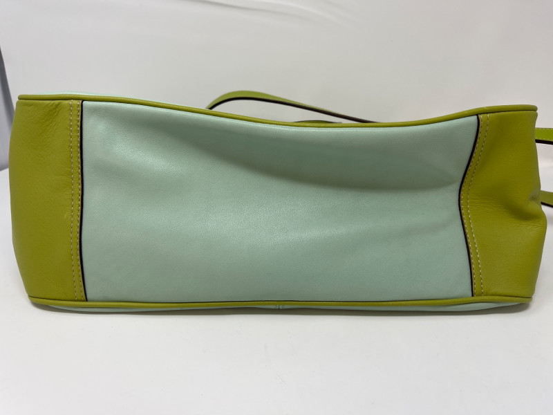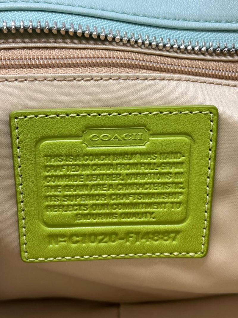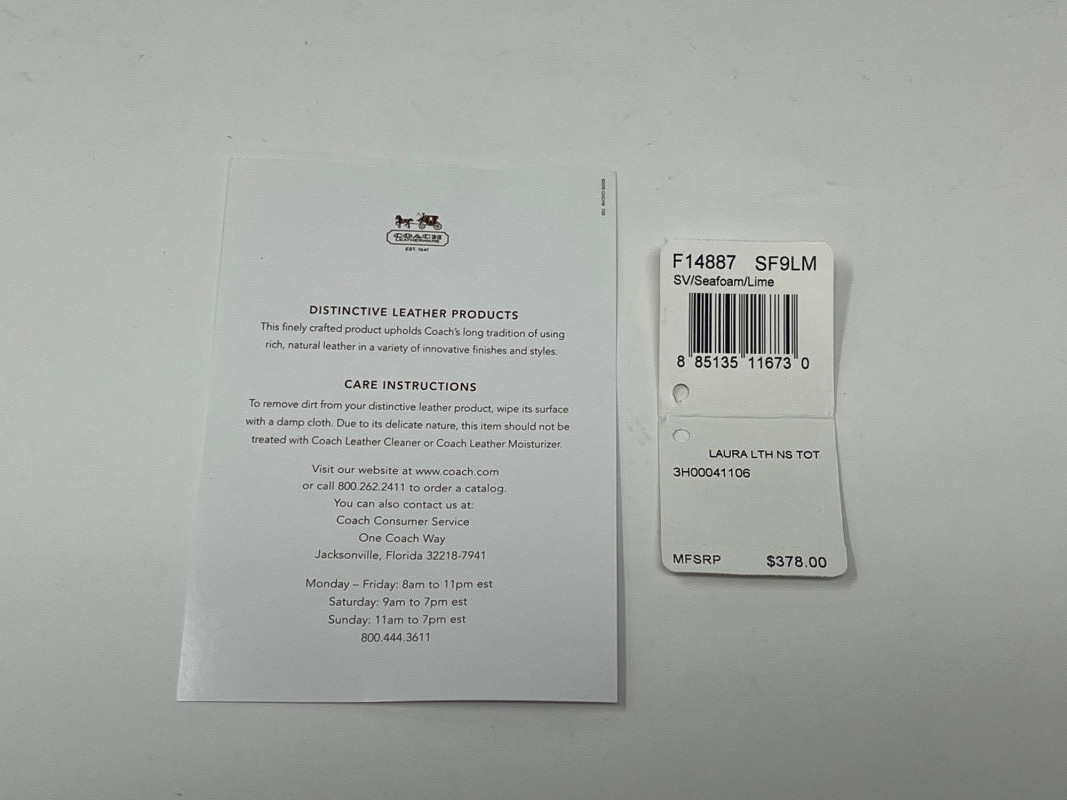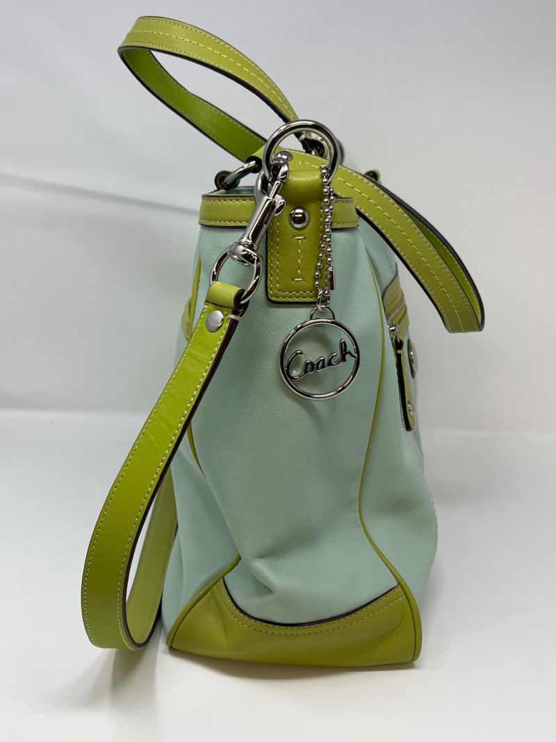 Limited Edition Coach Laura Leather 2-Way Tote New in dust bag. Model # F14887 Sea foam and lime butter soft leather. One zipper pocket and two open pockets inside of bag. Detachable shoulder strap. Nickel Coach medallion. Original dust bag. Original price tag and maintenance card.